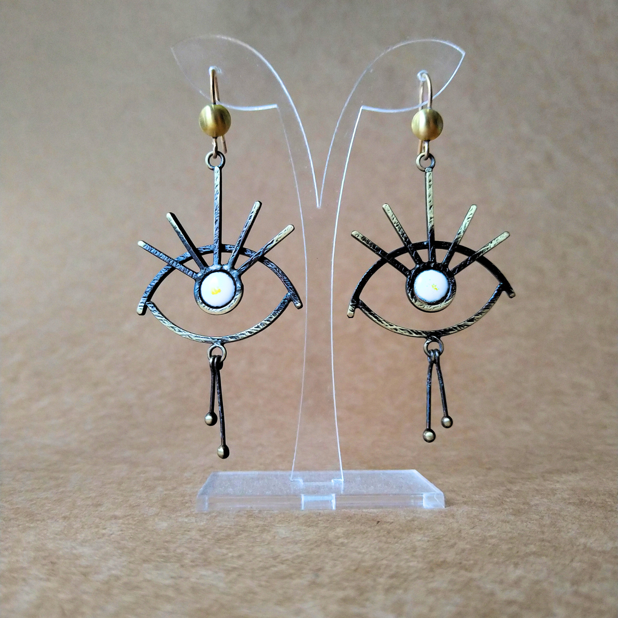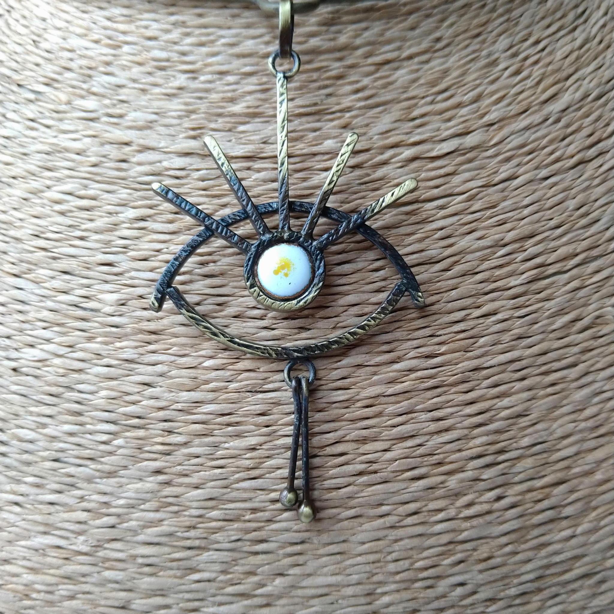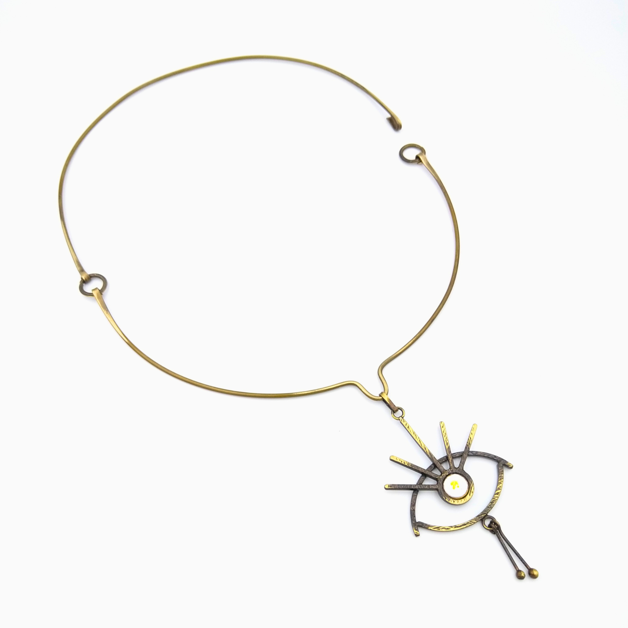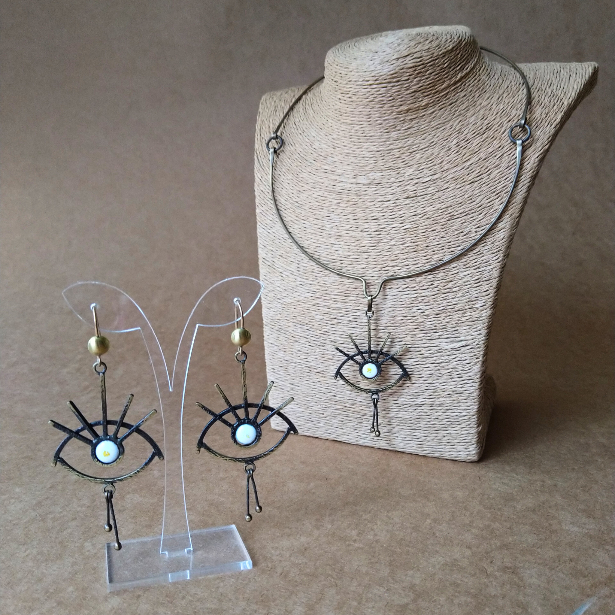 Antkaklė su auskarais Akių šviesa, tai ypatingas ir išskirtinis papuošalas simbolizuojantis apsaugą, gyvybę, šviesą ir išminį. Antkaklę (kolje) puikiai papildo tų pačių motyvų auskarai. Akies-saulės simbolis puoštas balto gintaro detalėmis suteikia žalvariui gyvumo ir mistiškumo. Ankaklės detalės jungtos žiedeliais priduoda lankeliui lengvumo. Ankaklė patogiai užsisega/atsisega šone kabliuku.