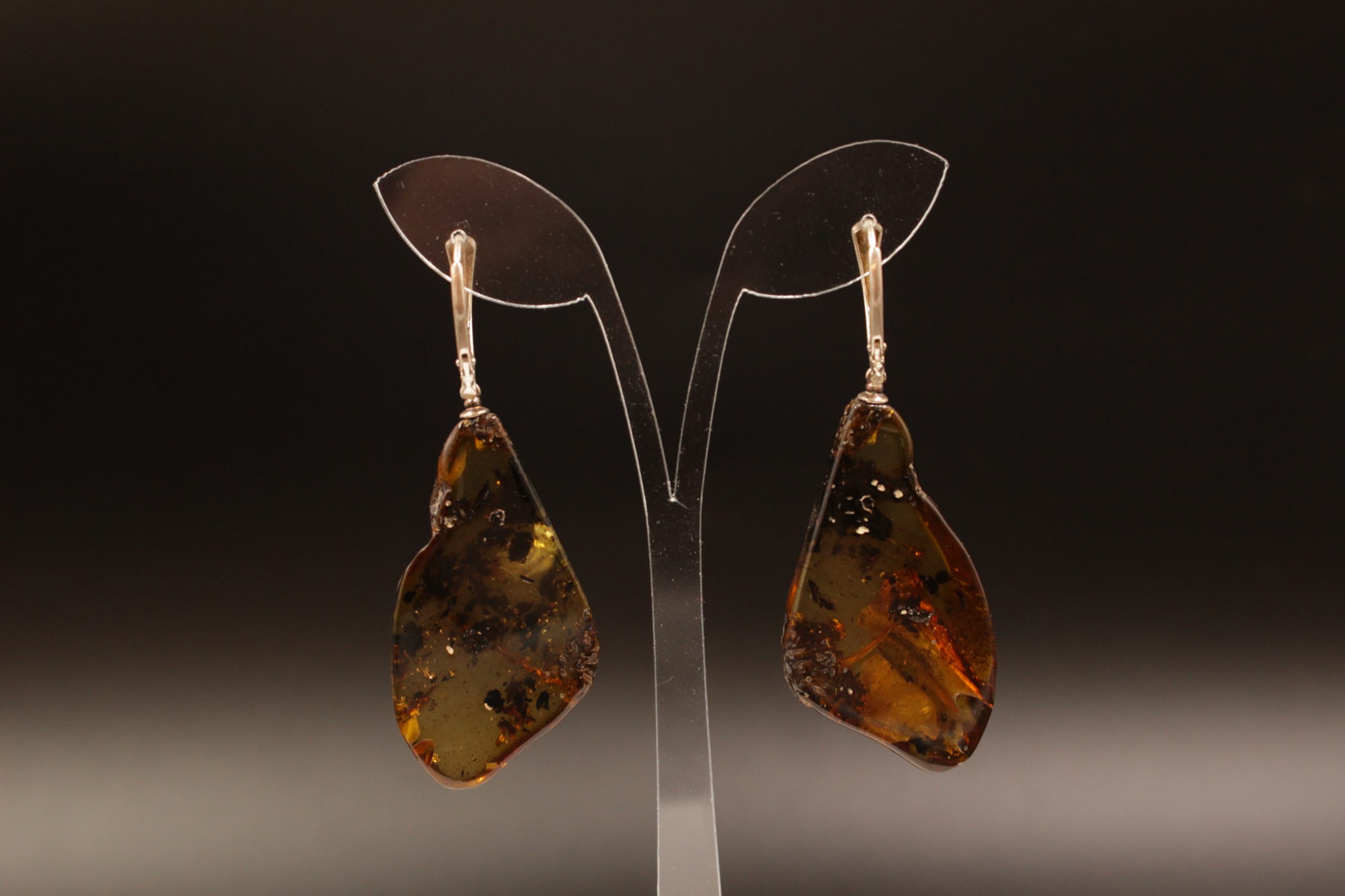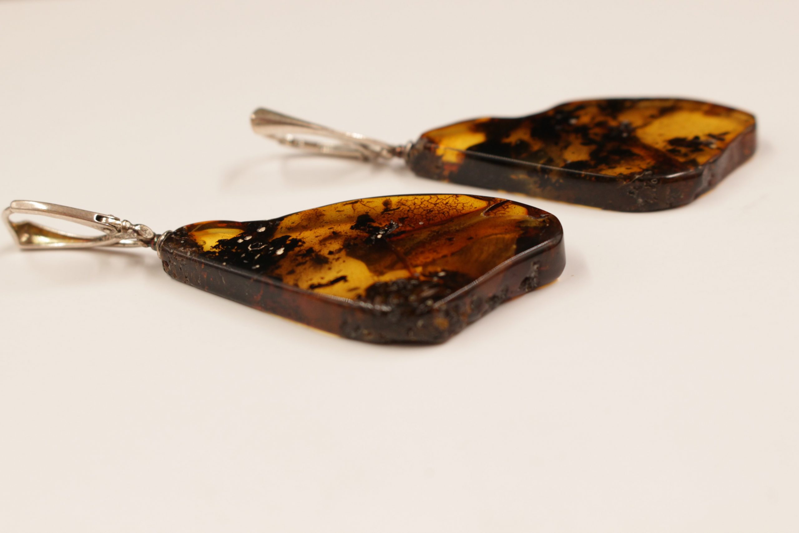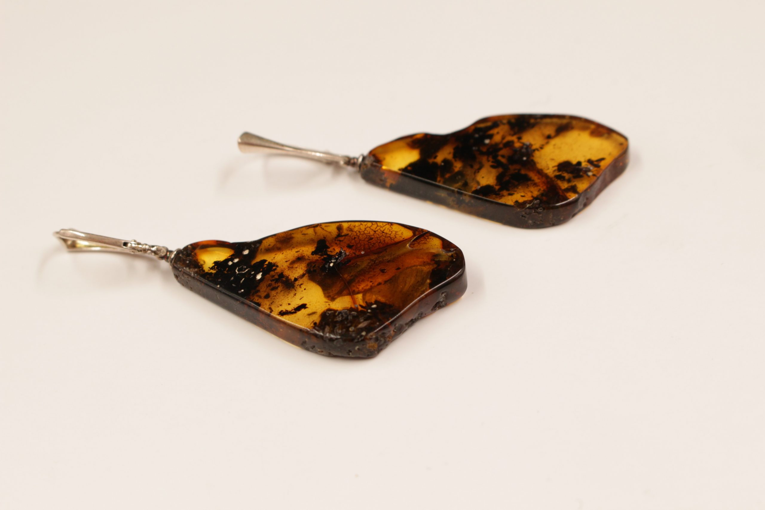 Natūralaus gintaro auskarai, pjauti per pus iš vienos gintaro plokštelės.