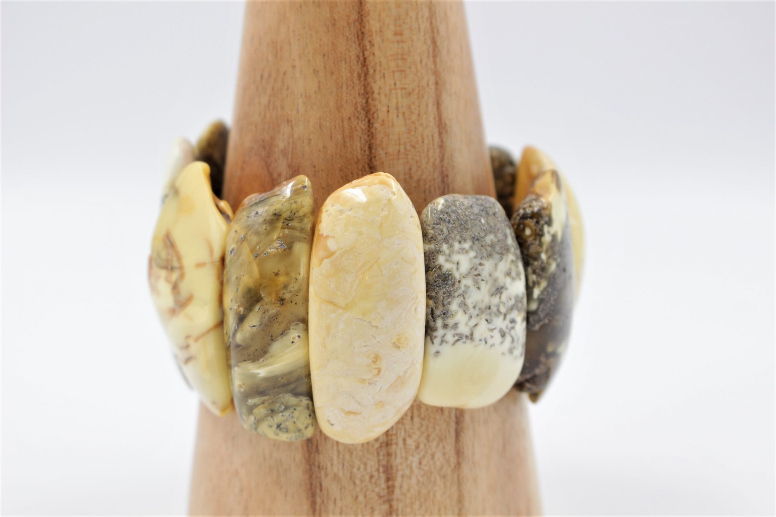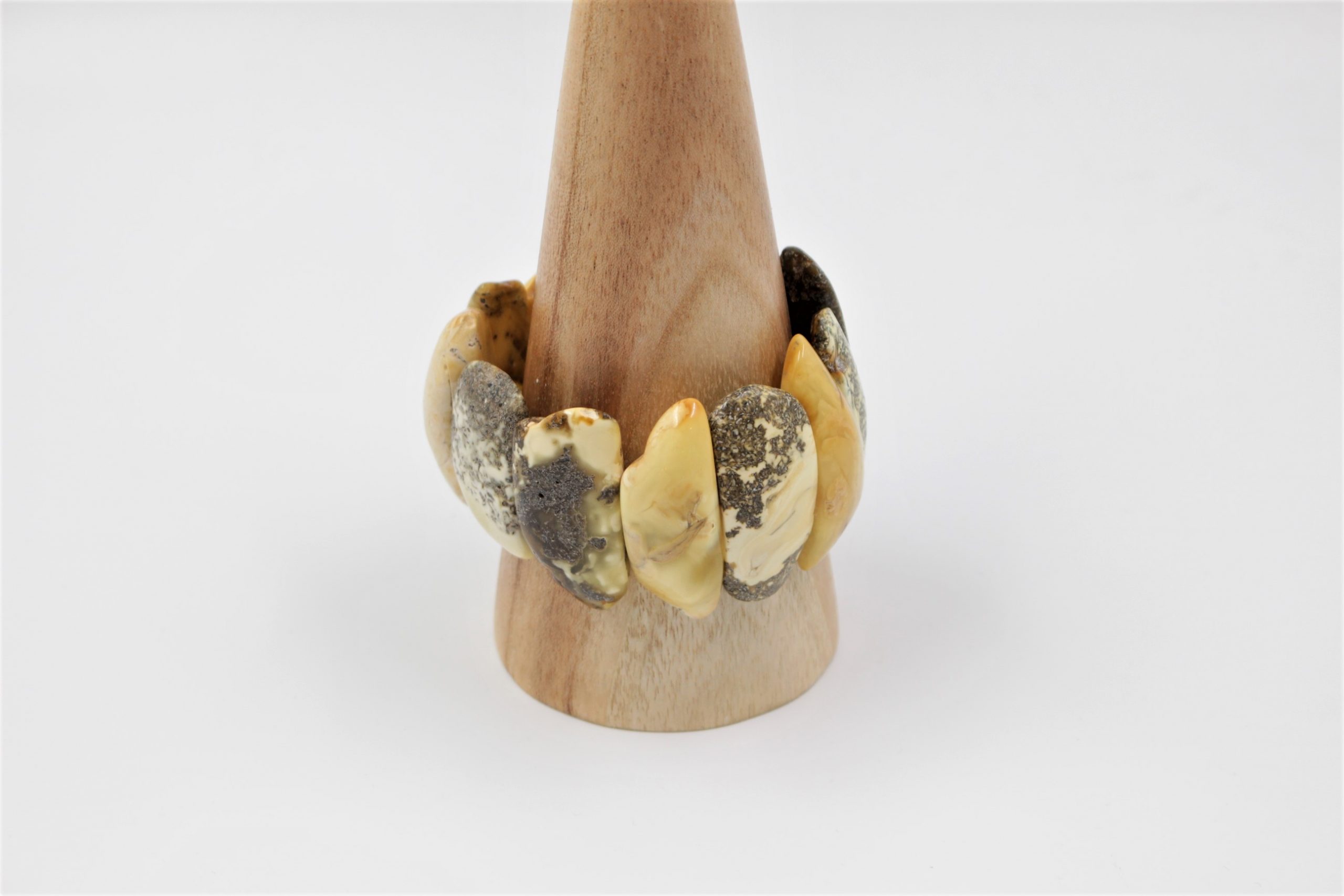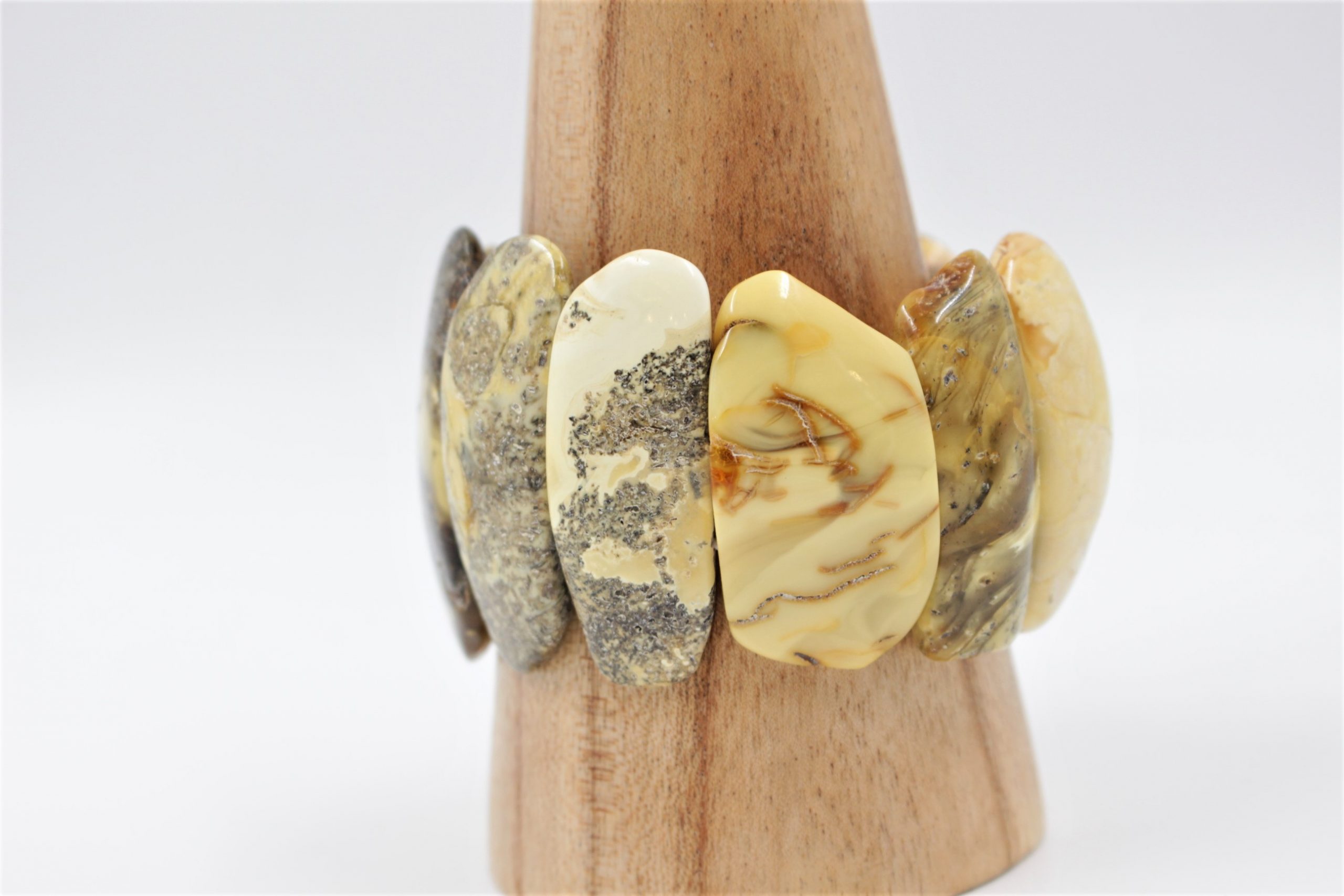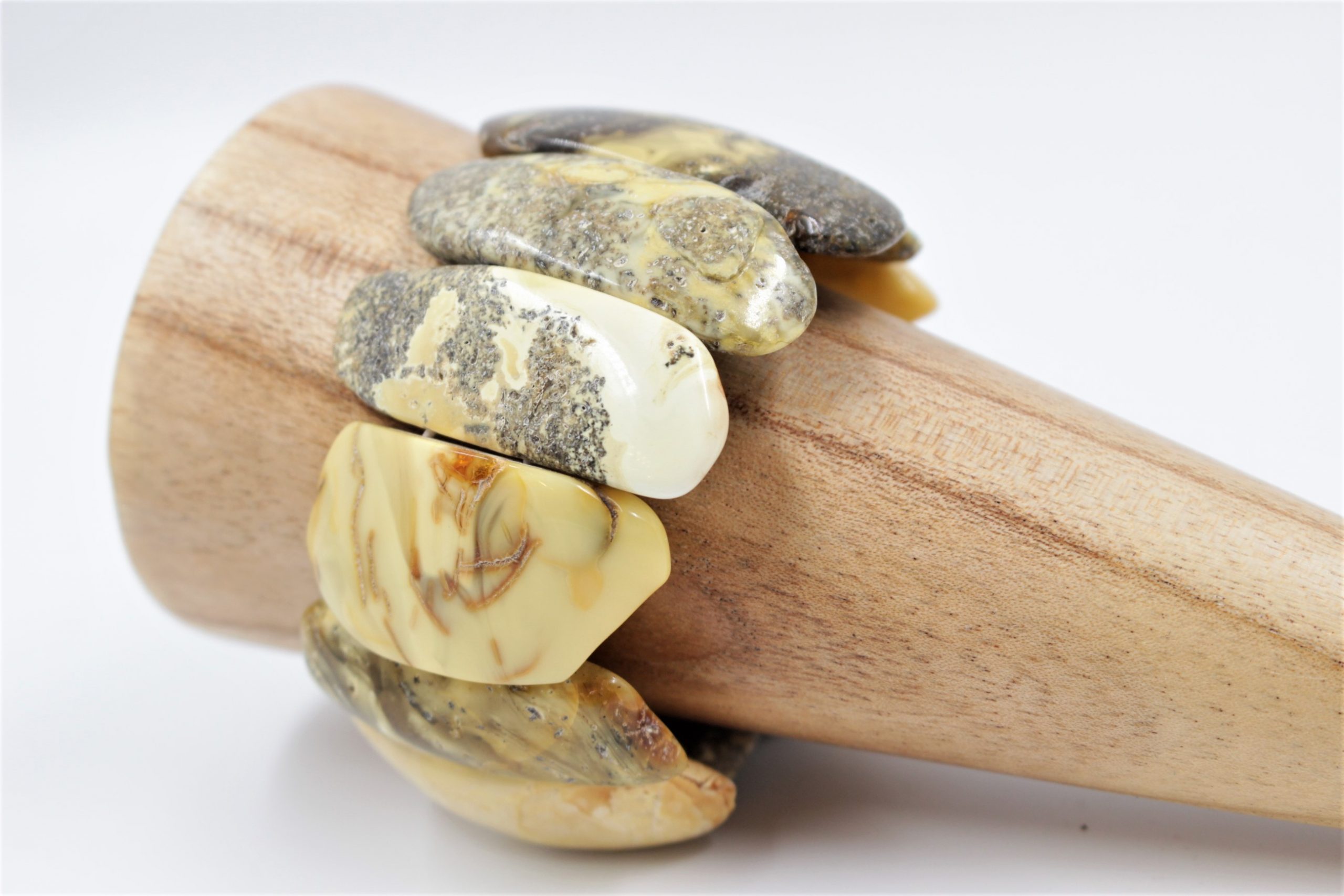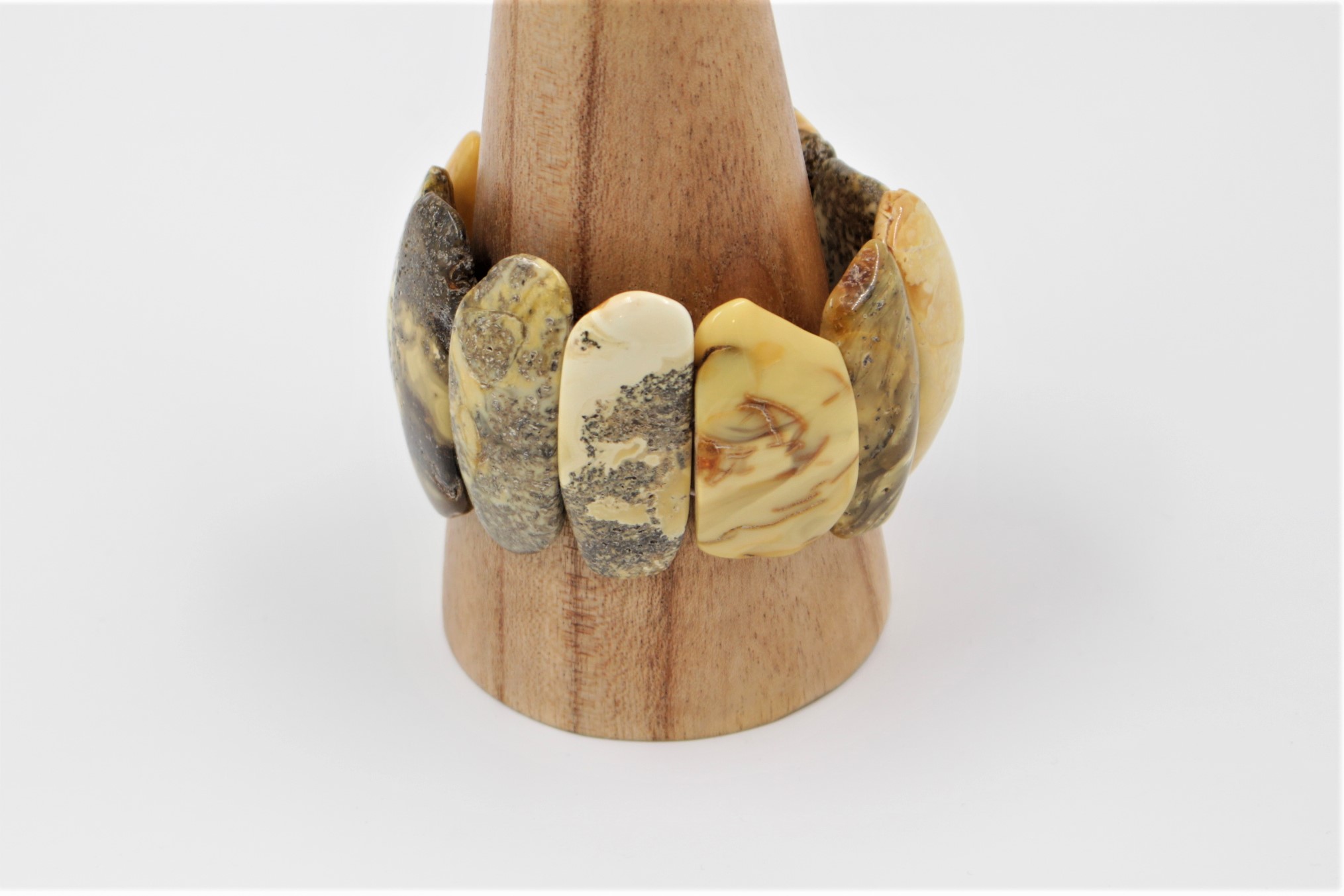 Baltai marga apyrankė, suverta ant gumos, iš storų plokštelės gabaliukų.