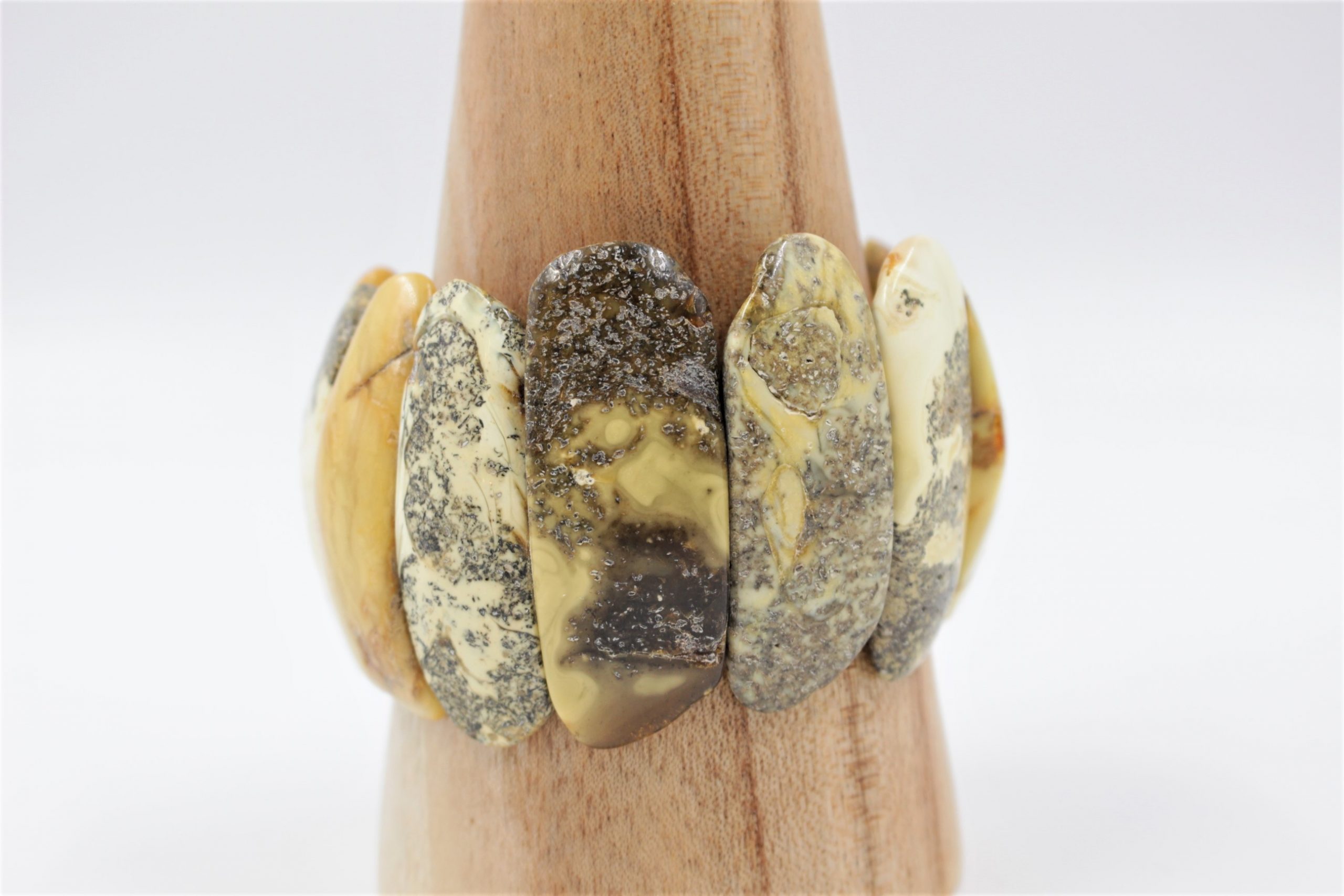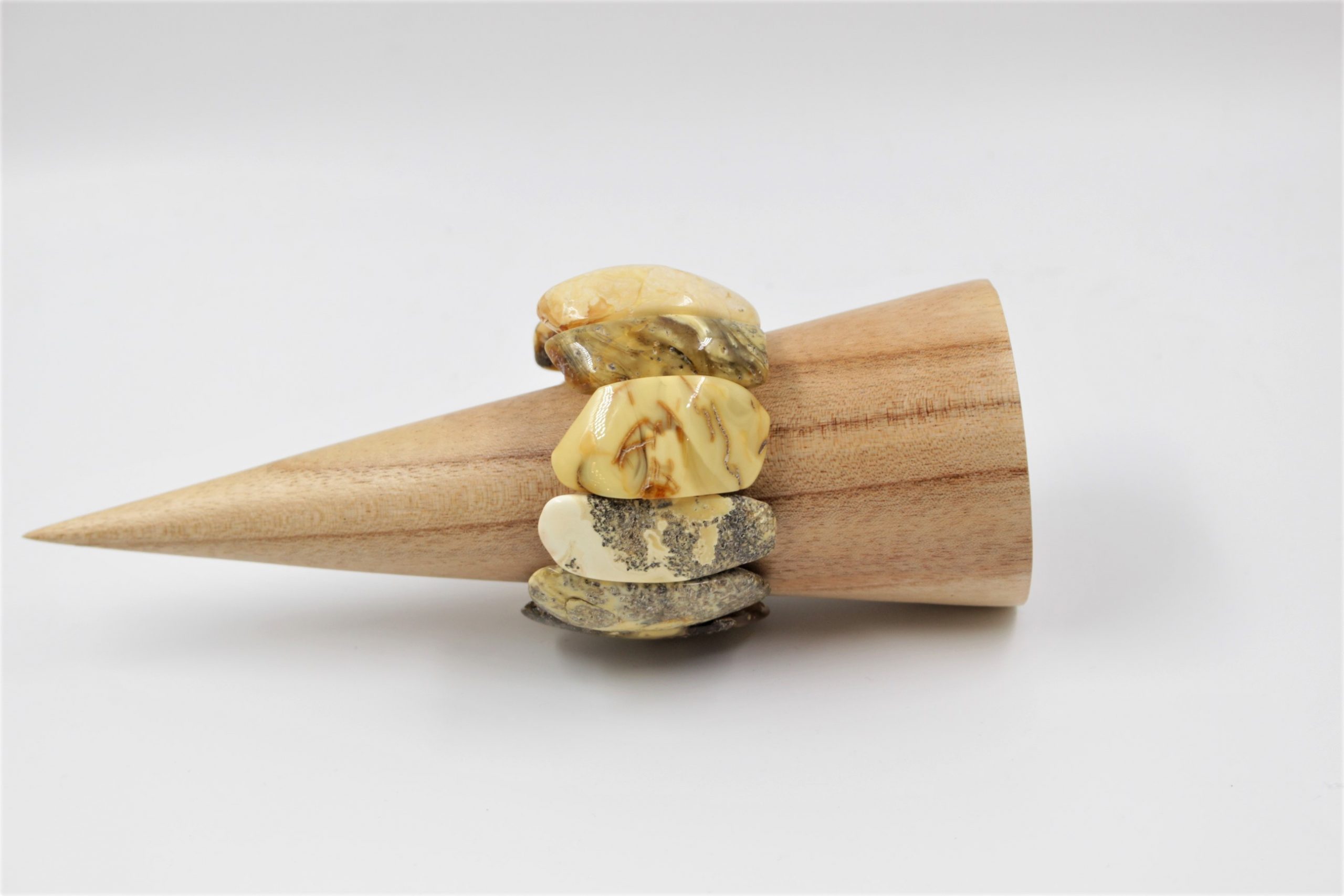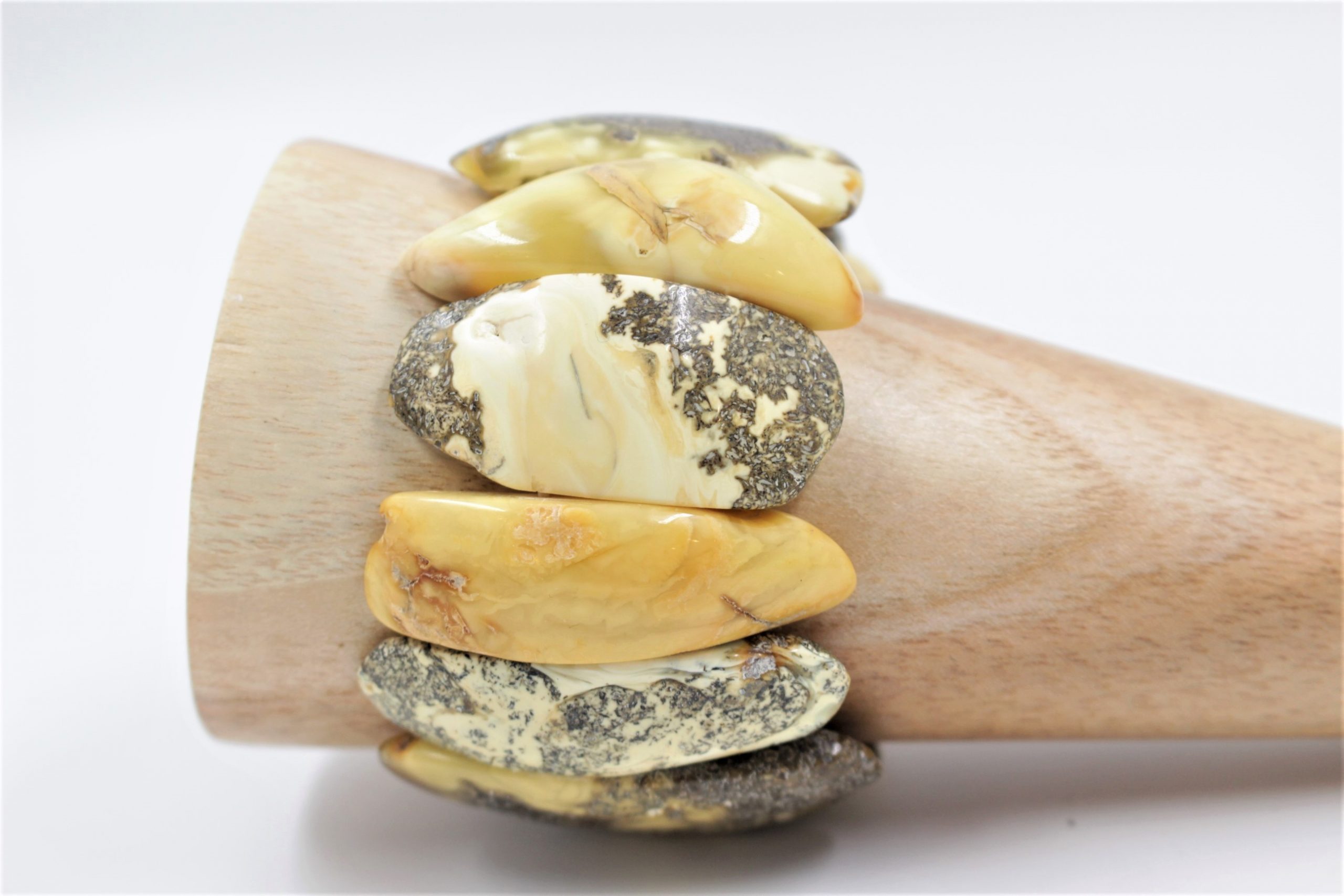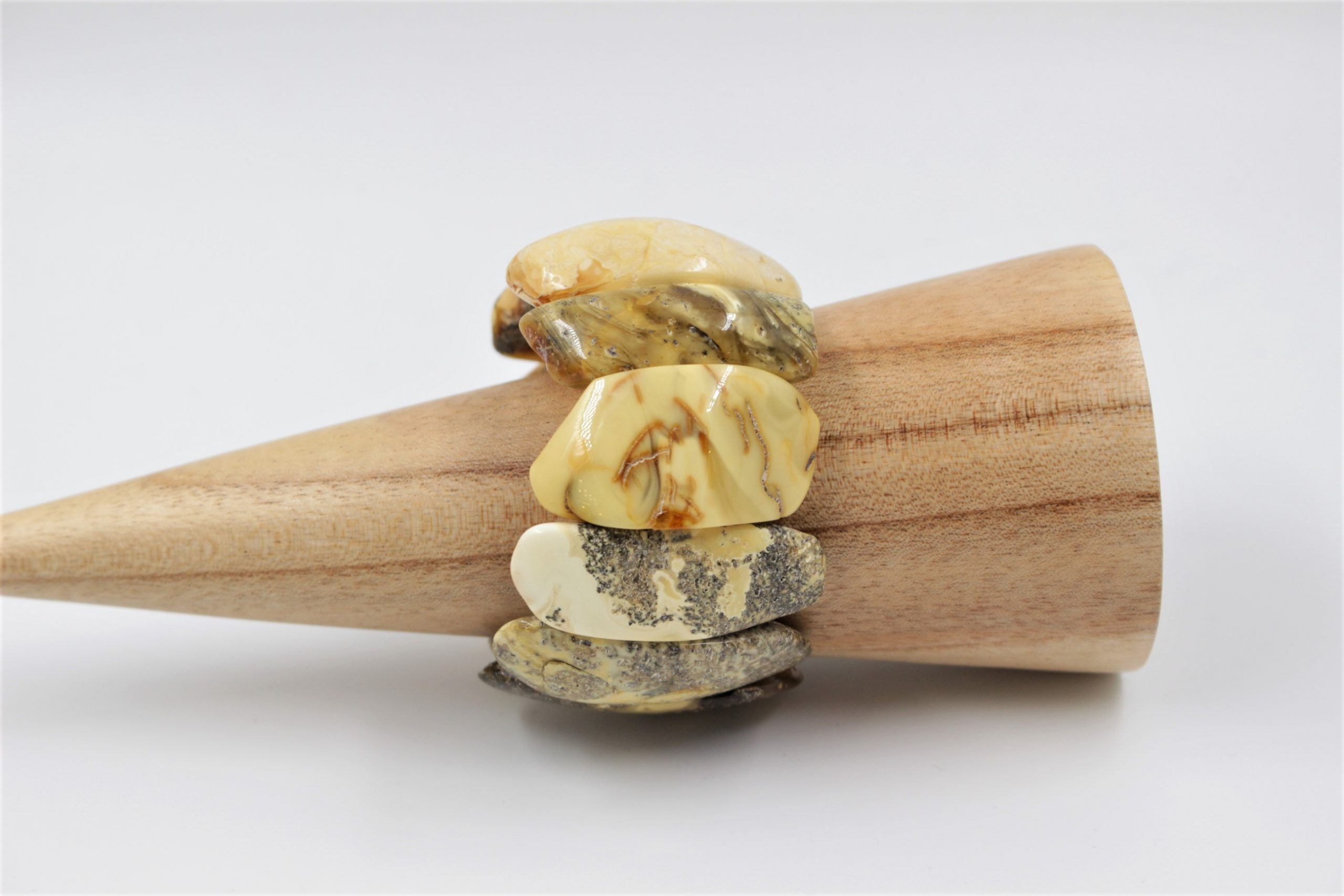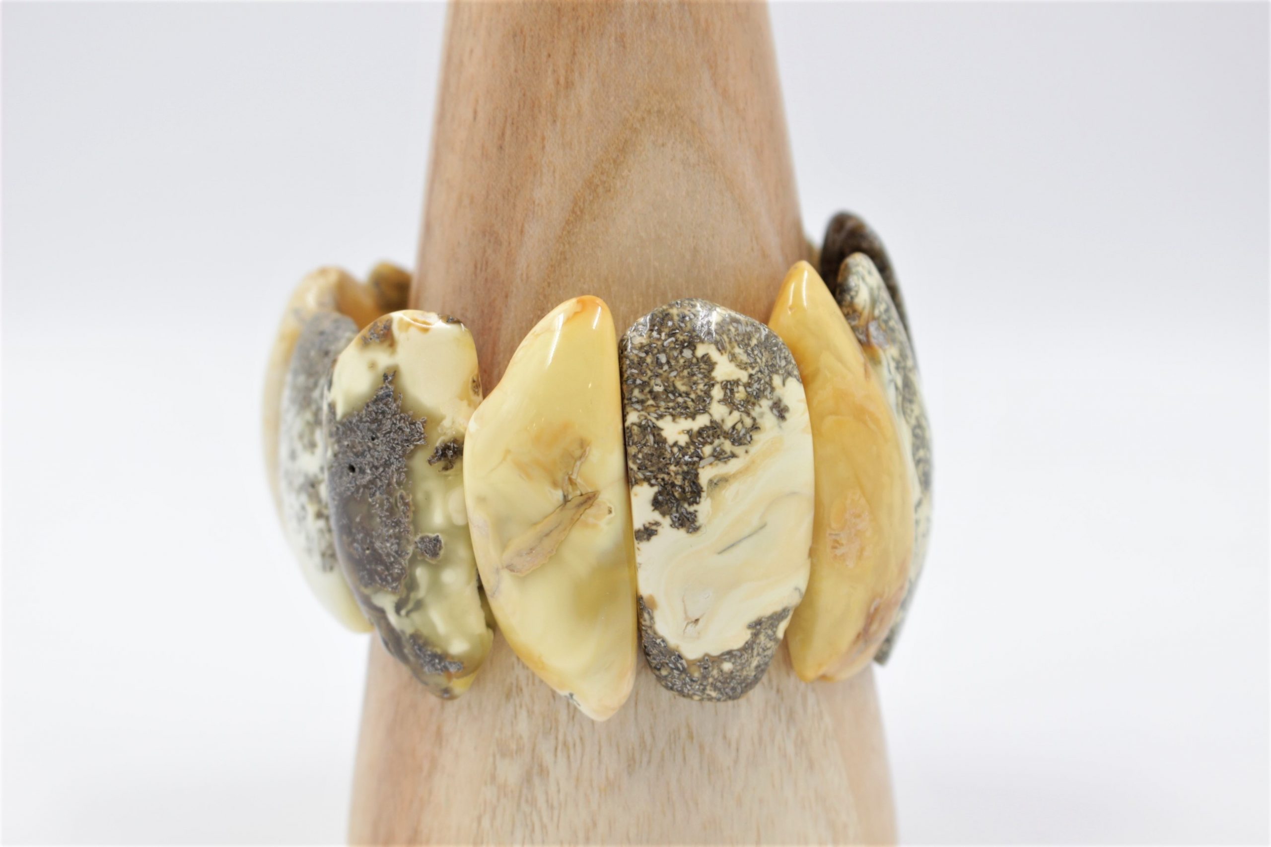 Baltai marga apyrankė, suverta ant gumos, iš storų plokštelės gabaliukų.