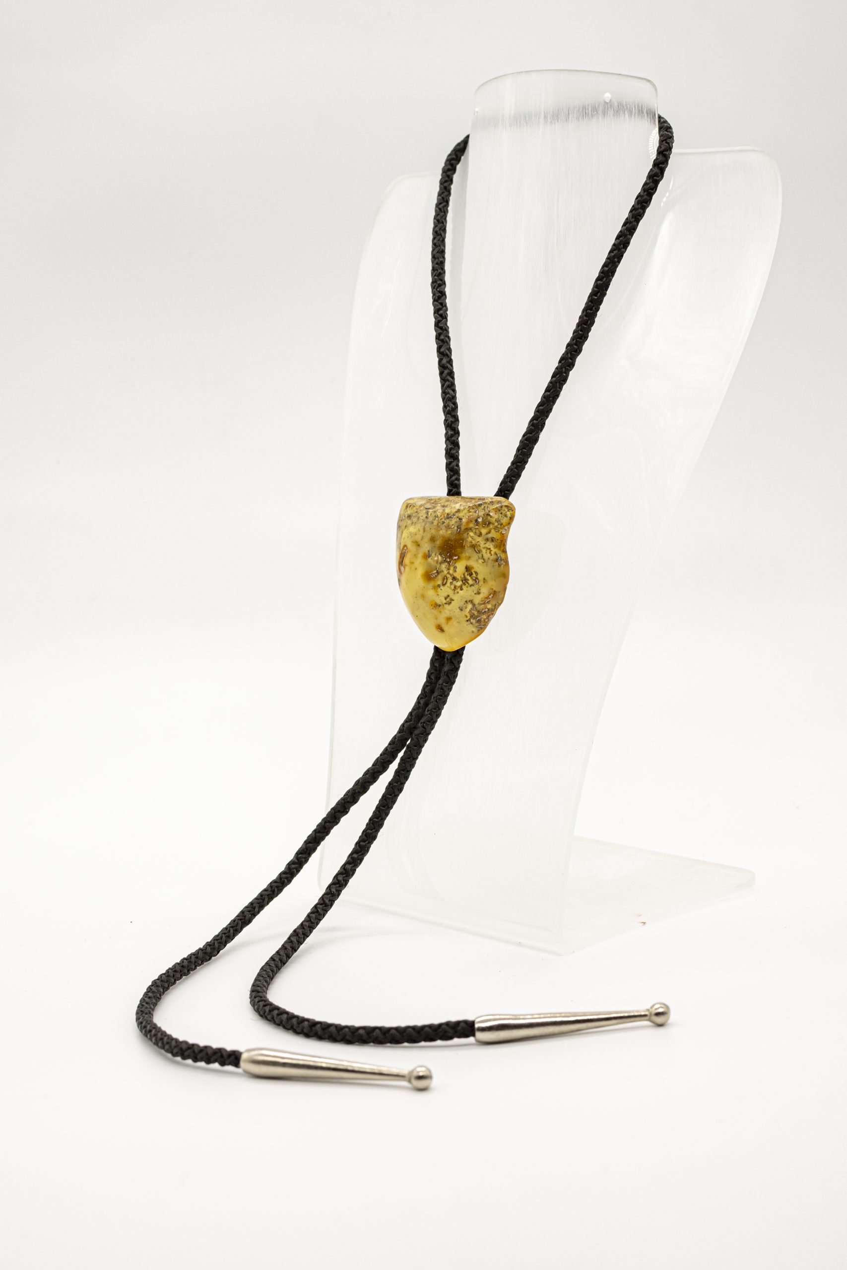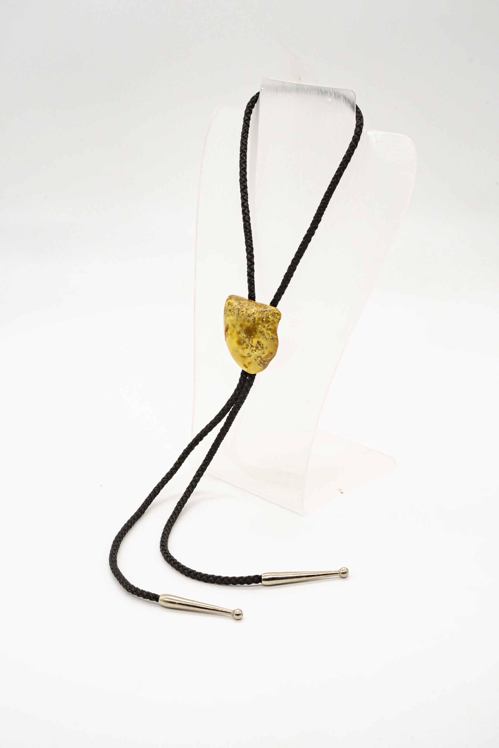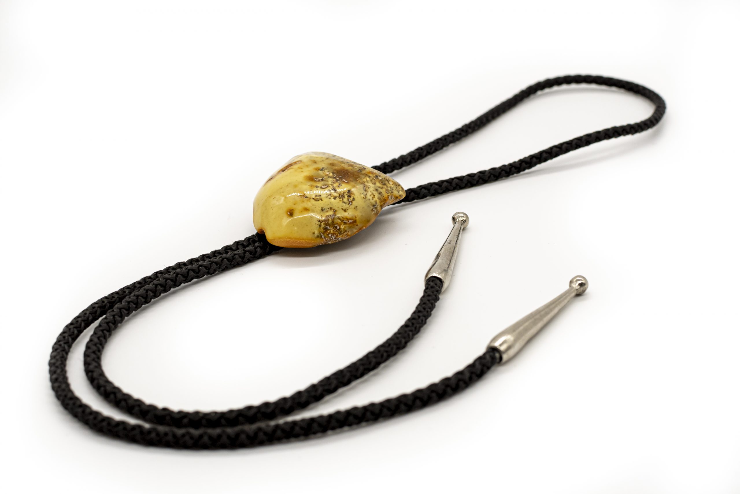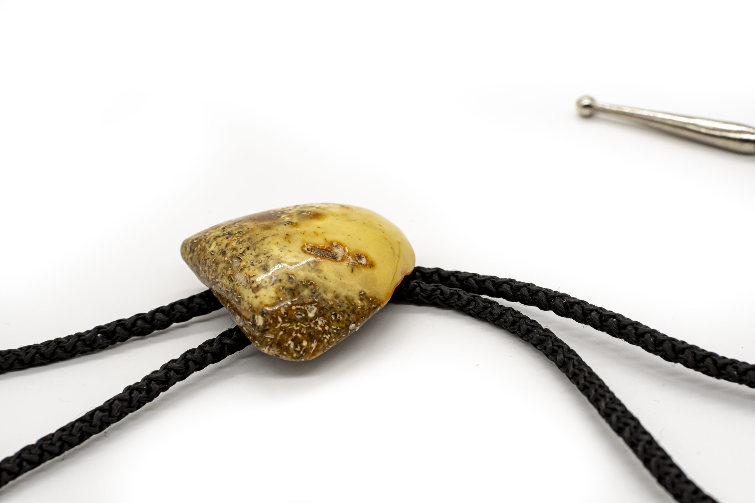 Vientiso balto gintaro kaubojiškas kaklaraištis su juoda medžiagine virvele bei melchioru.