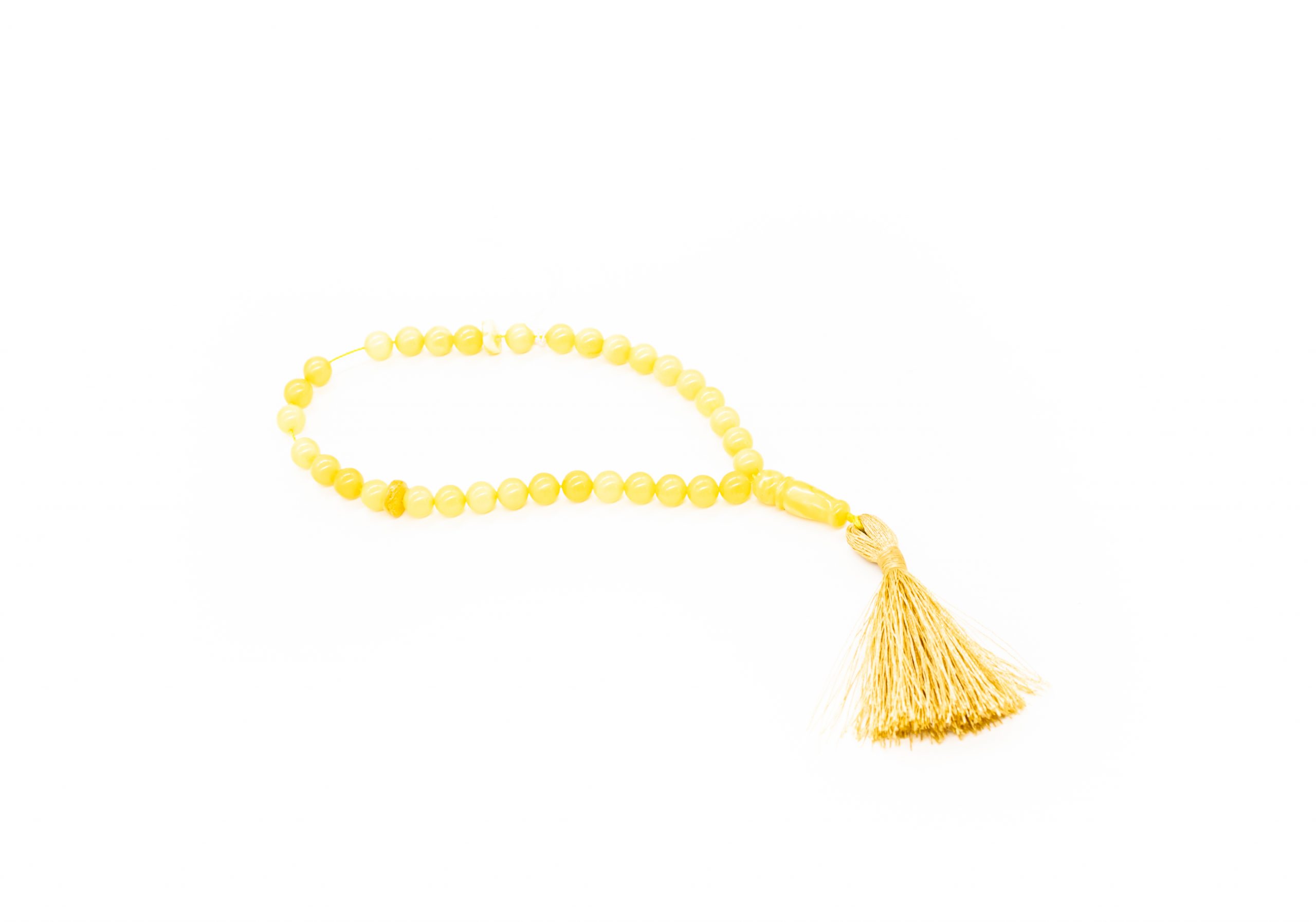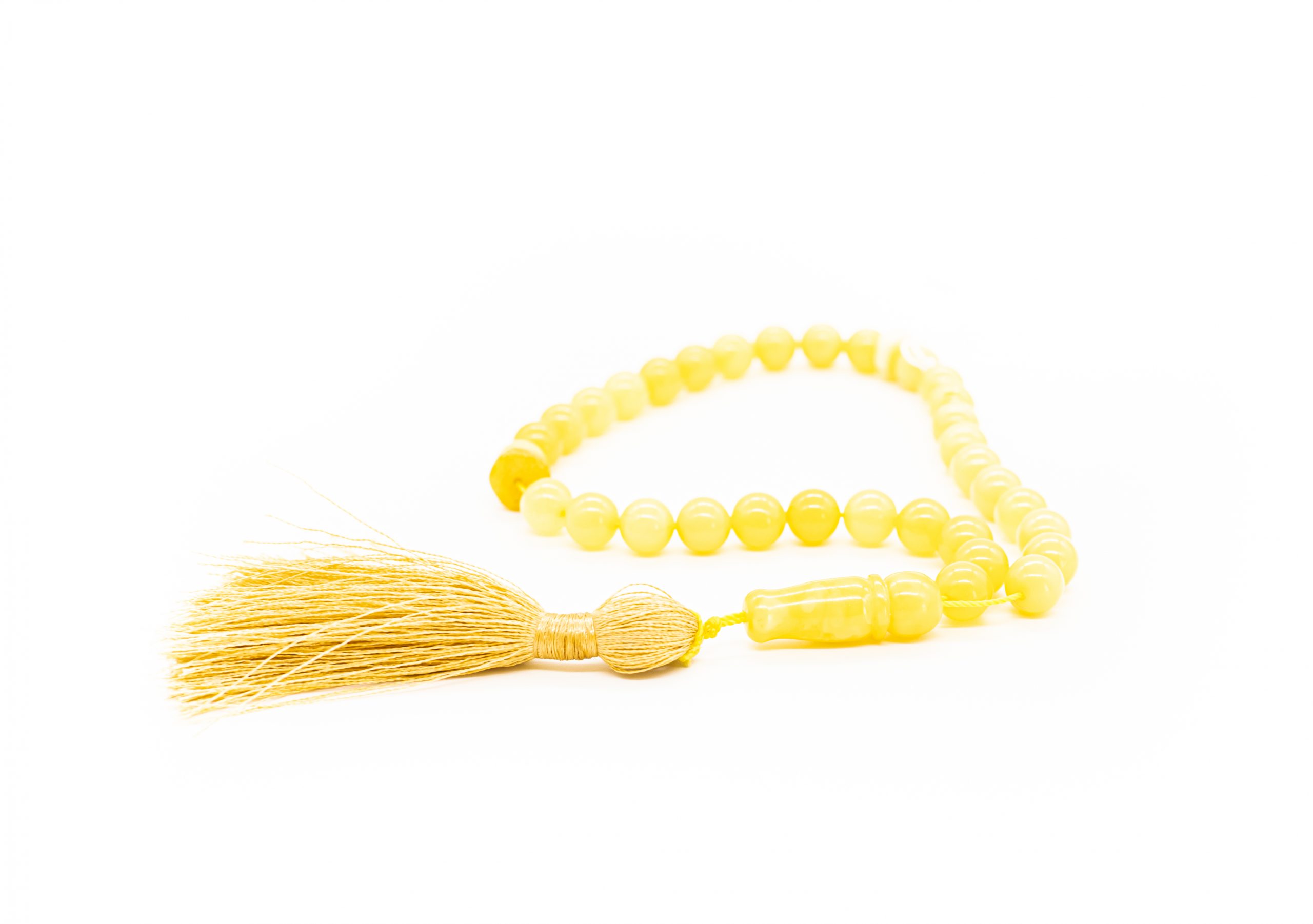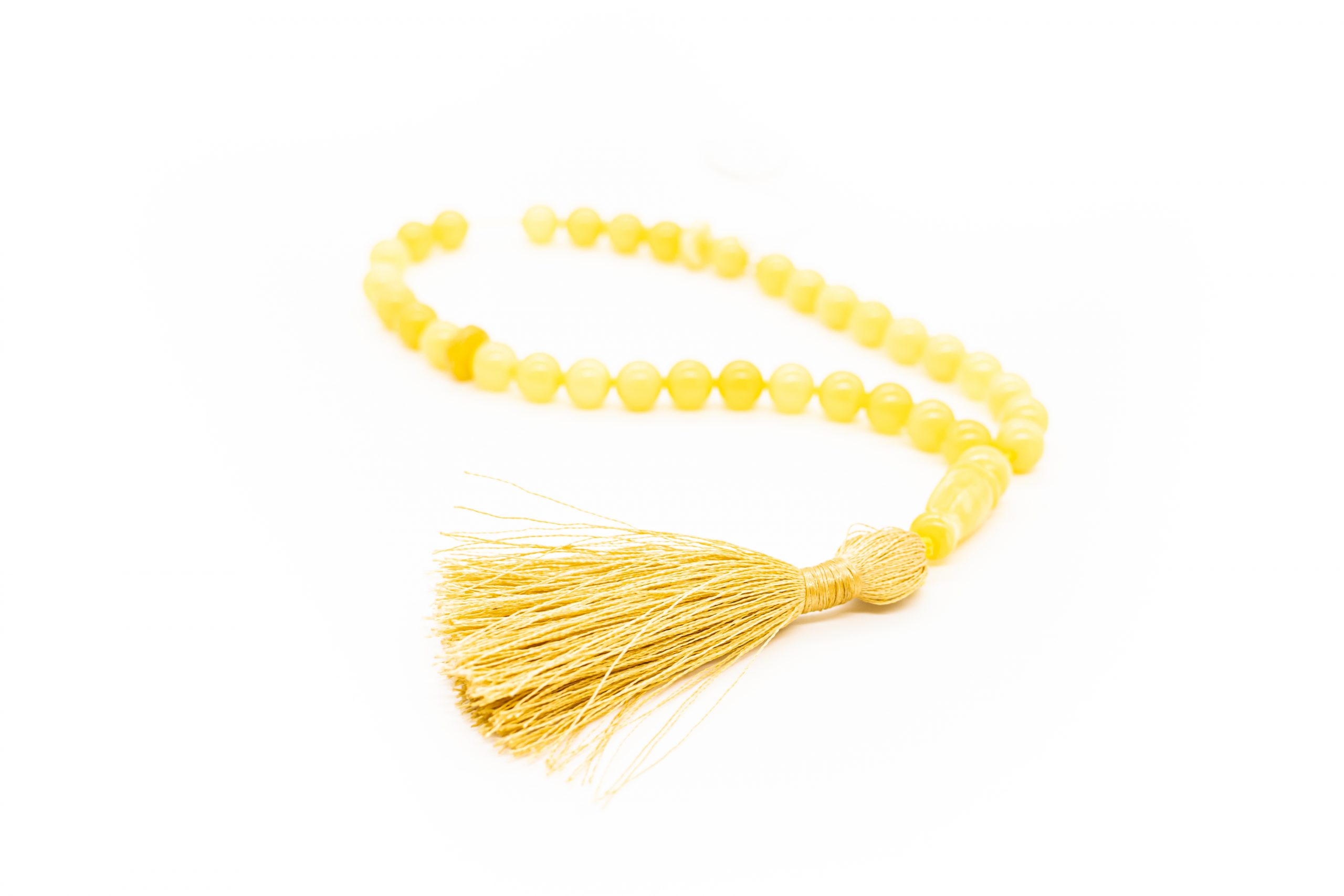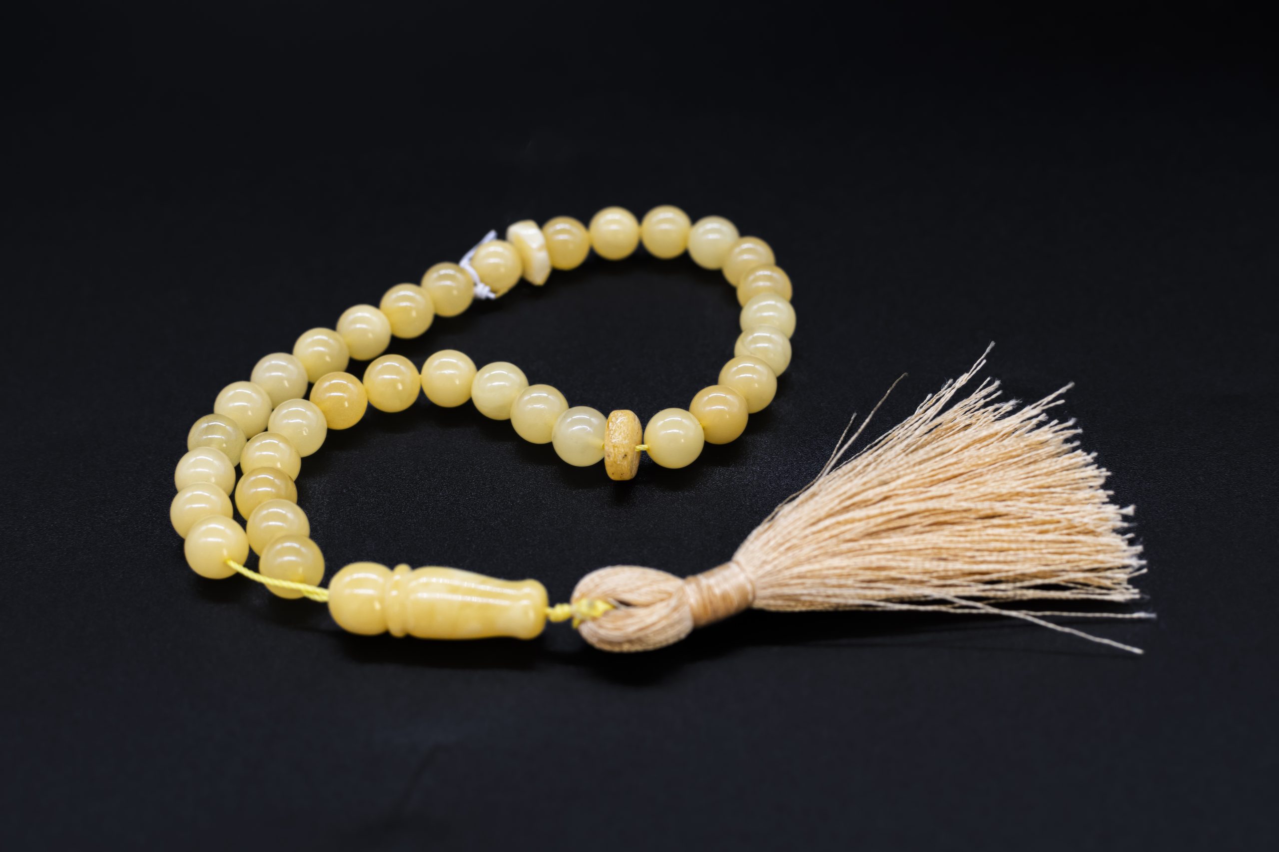 Balto apvalaus gintaro burbuliukų musulmoniškas rožinis, suvertas ant šilkinės virvelės ir dekoruotas šilkiniu kutu. 33 burbuliukai.