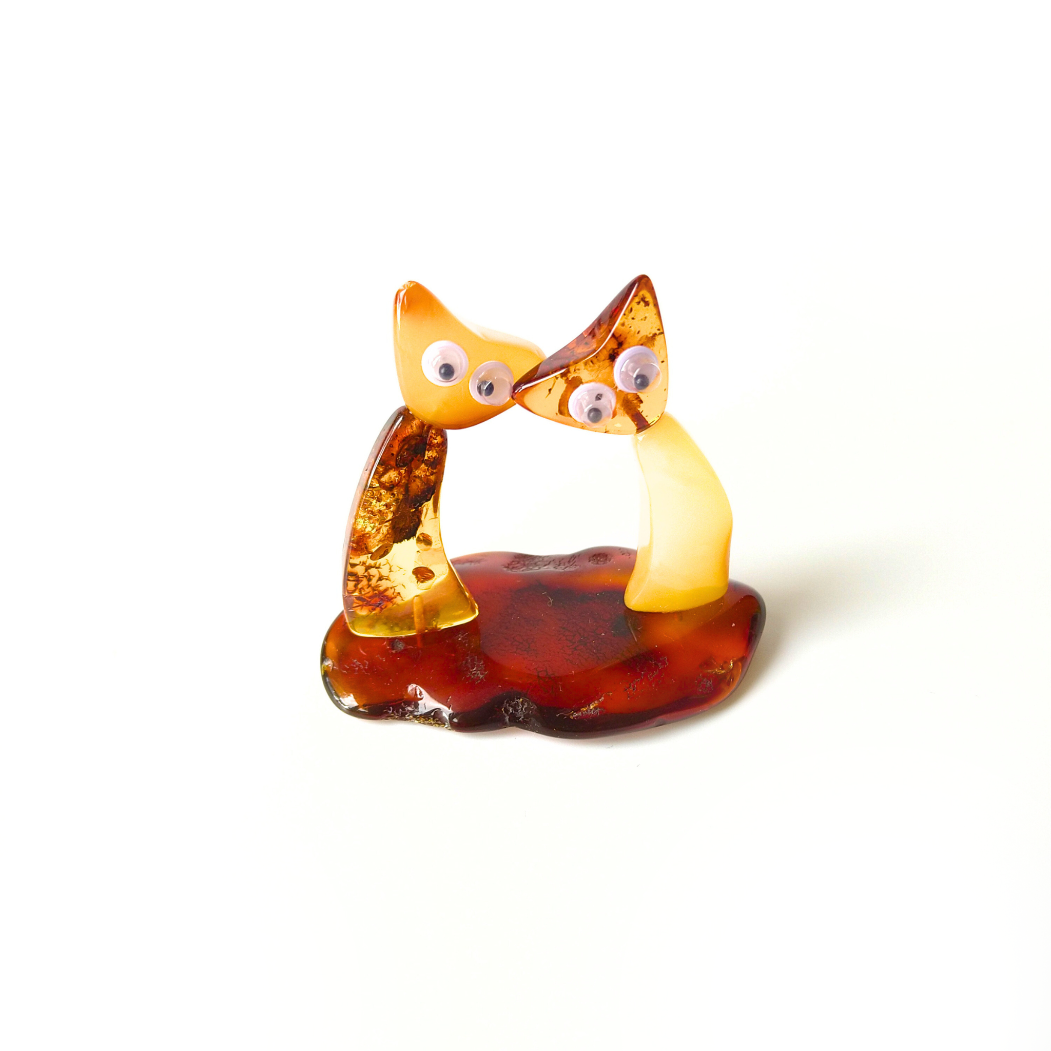 Dekoratyvinė gintarinė figūrėlė du kačiukai. Figūrėlėje susipina unikalios spalvų kombinacijos nuo švelnios medaus geltonos iki sodrios karamelės. Judančios kačiukų akytės figūrėlei priduoda žaismingumo.