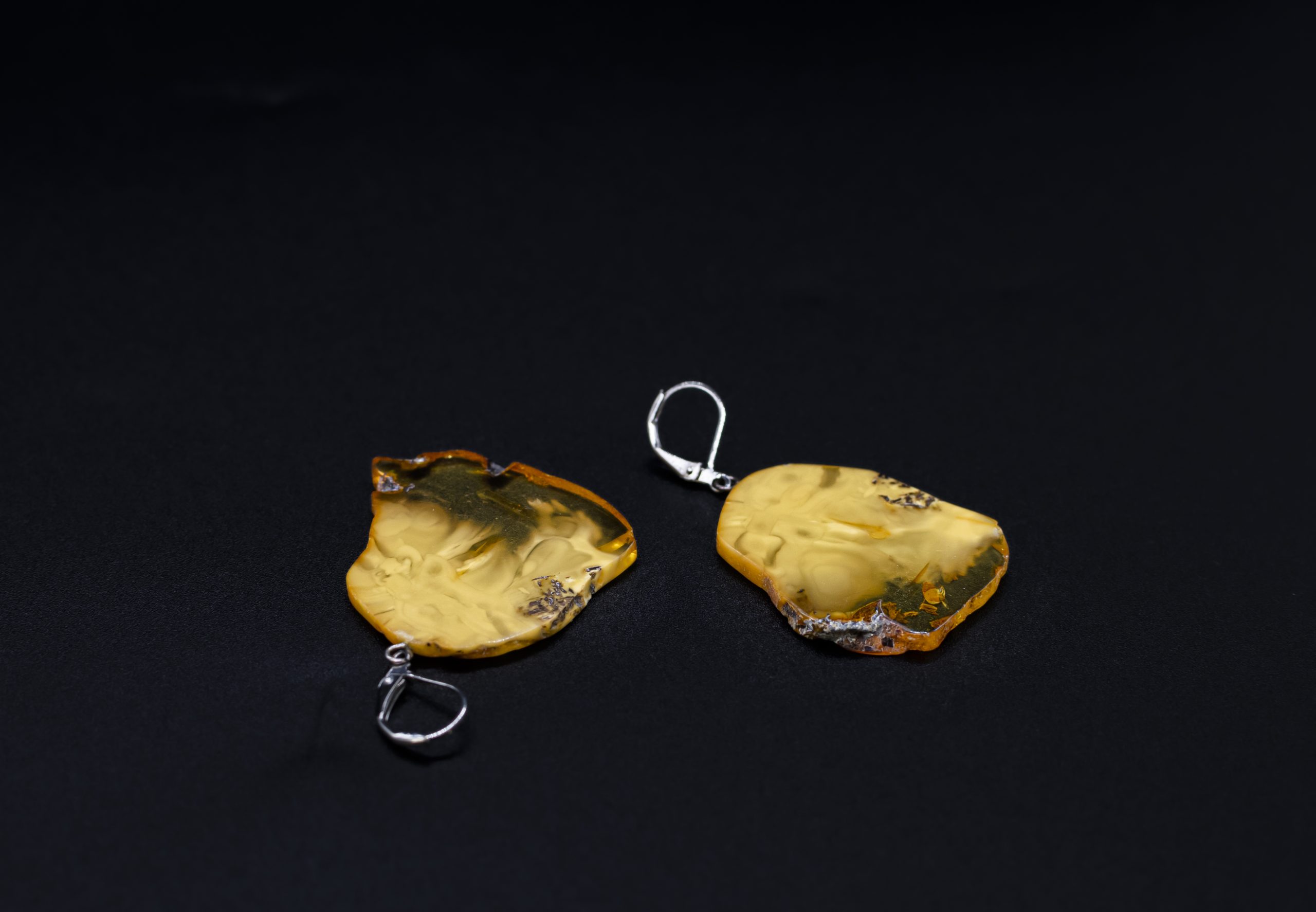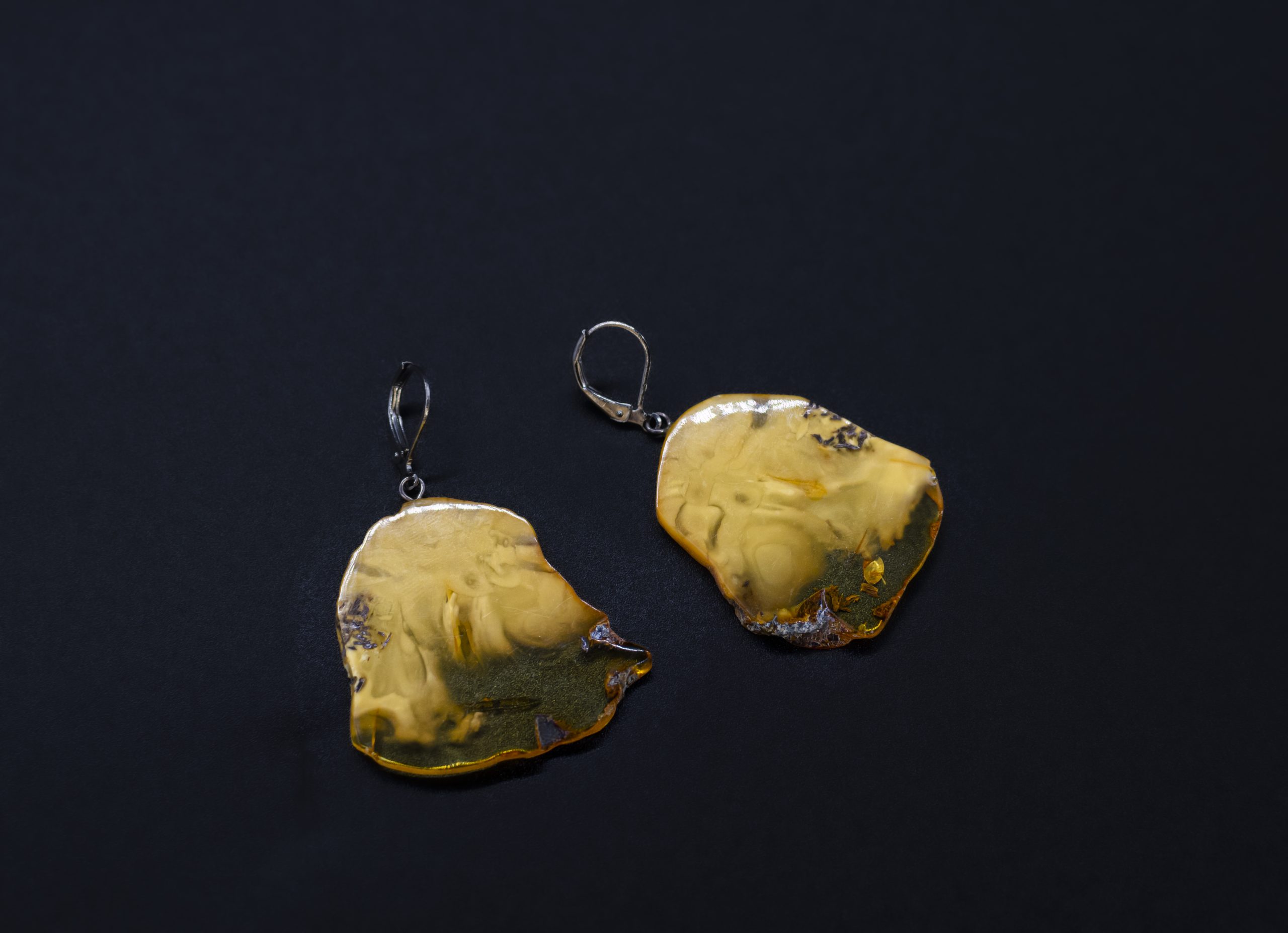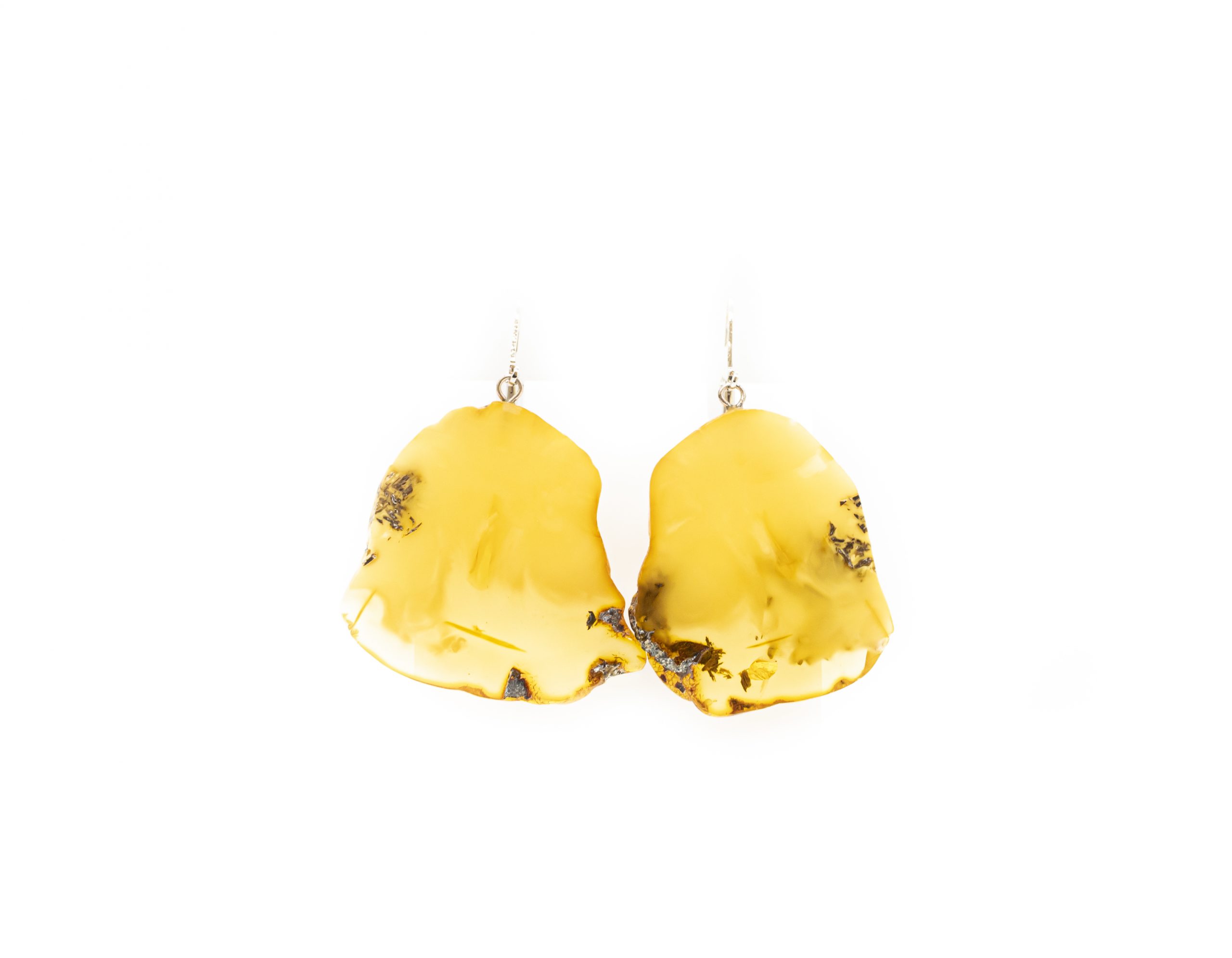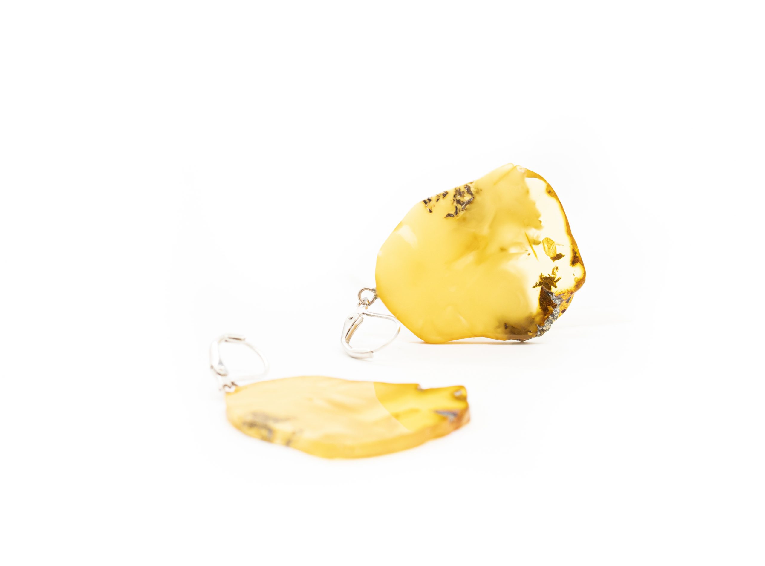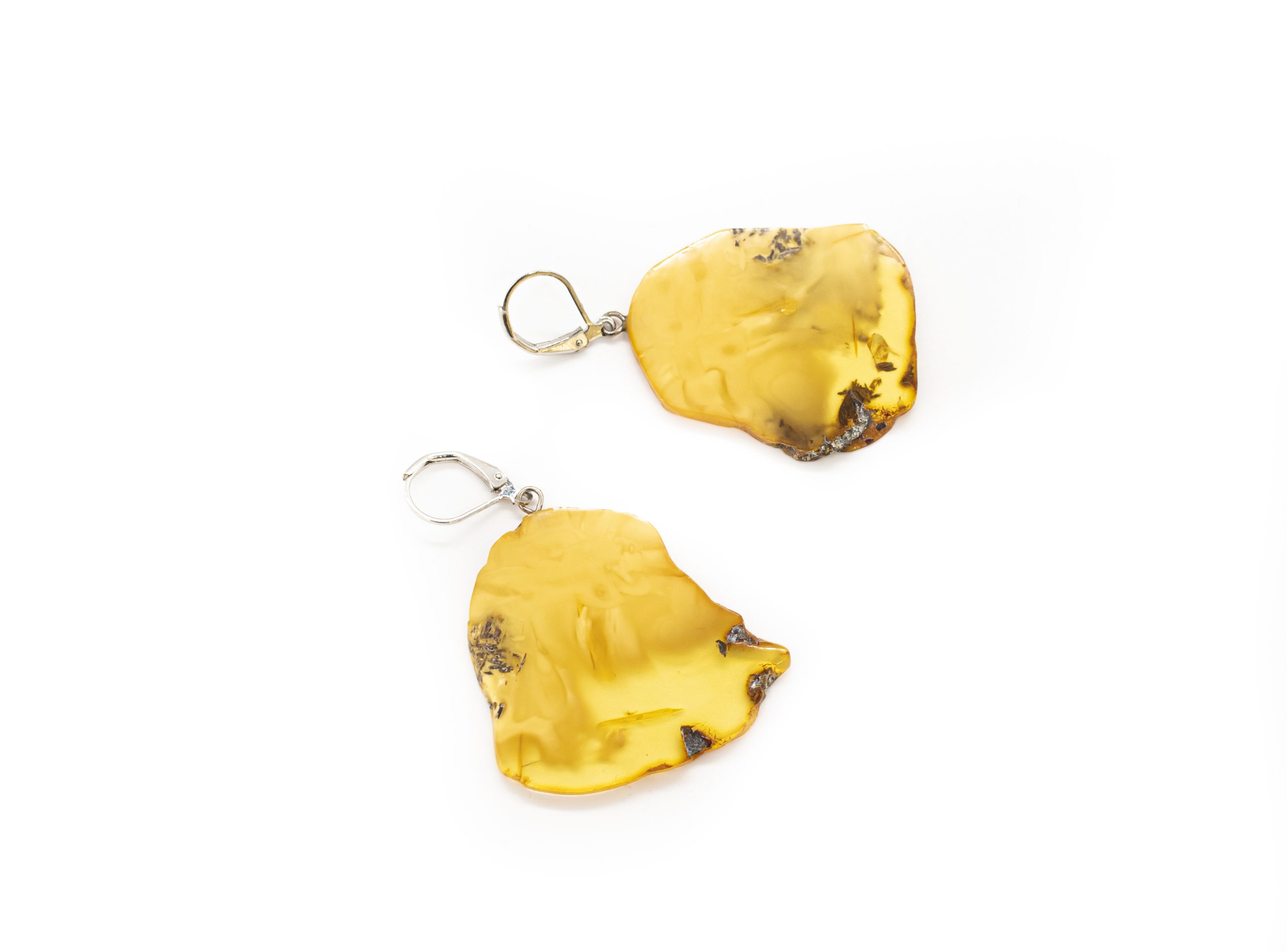 Lengvi ir originalūs gintariniai auskarai – plokštelės. Gintaro spalva pereinanti iš matinės geltonos į permatomą šviesią. Melchioro užsegimai.