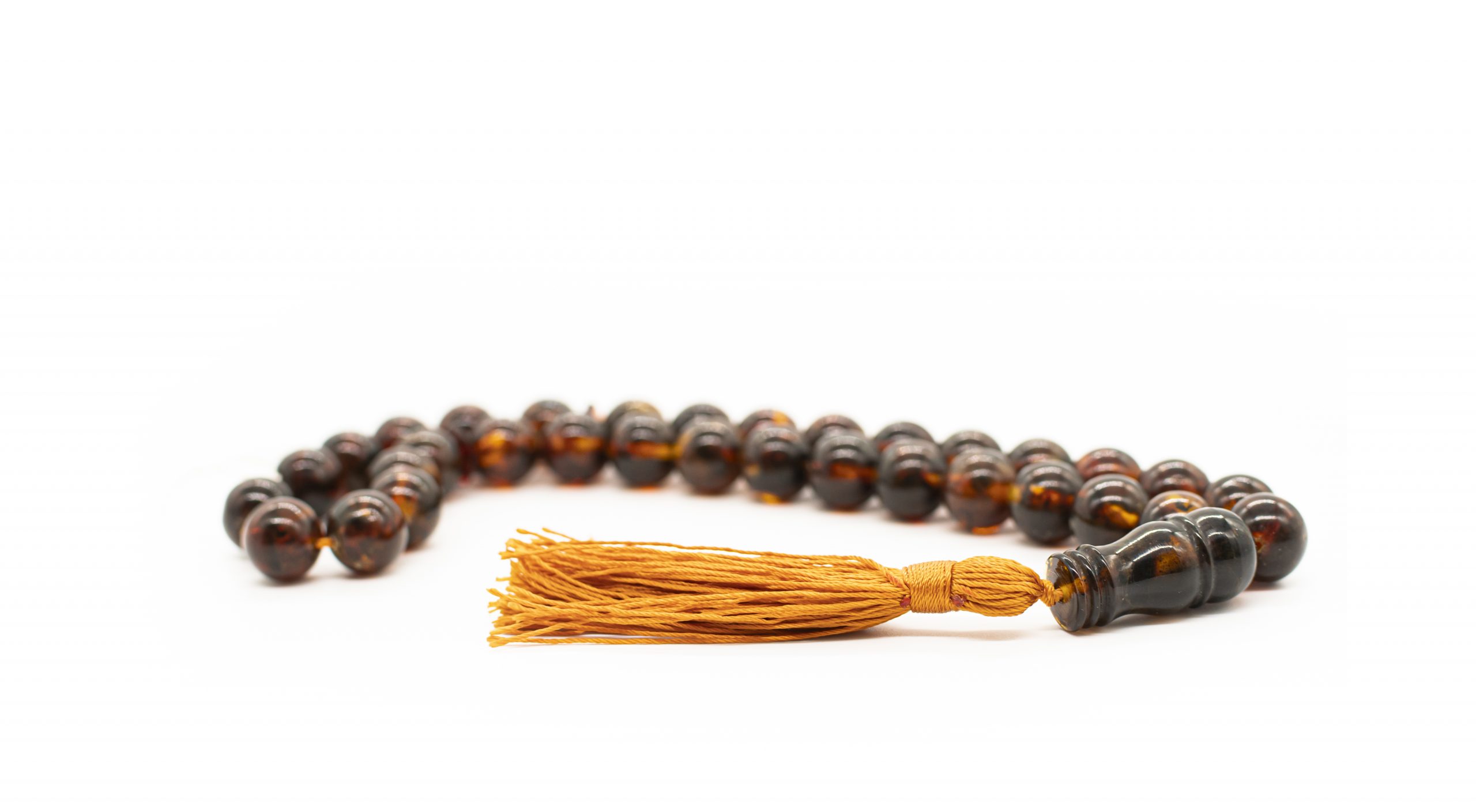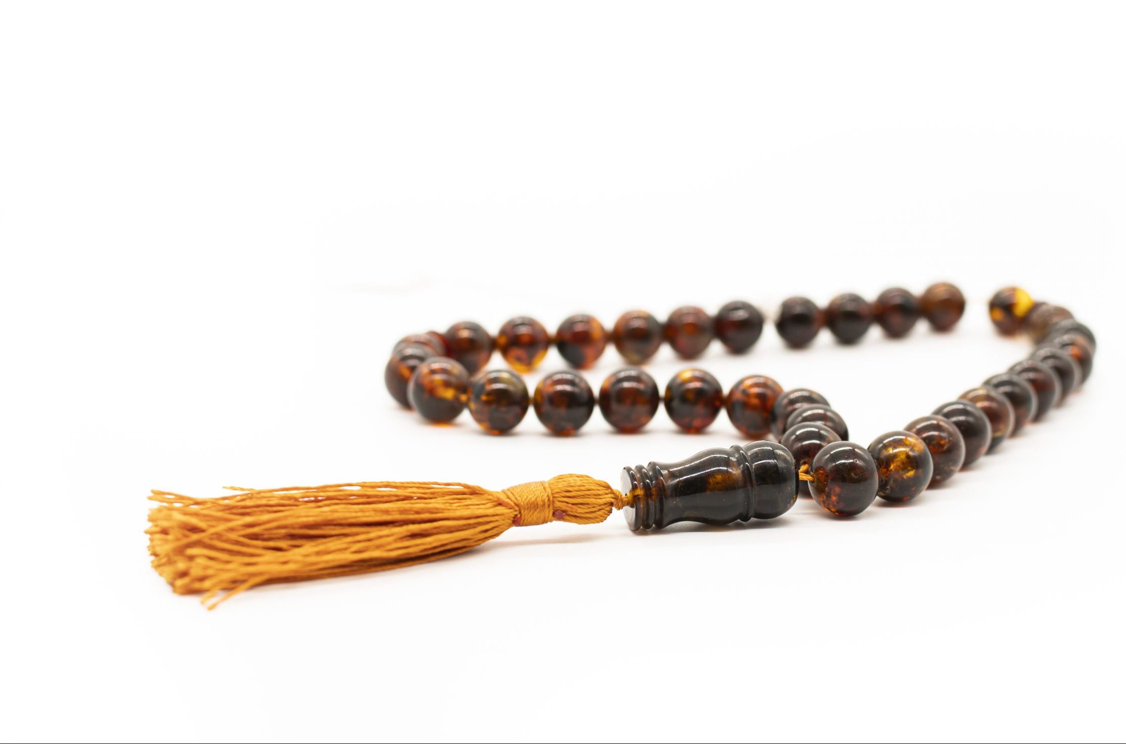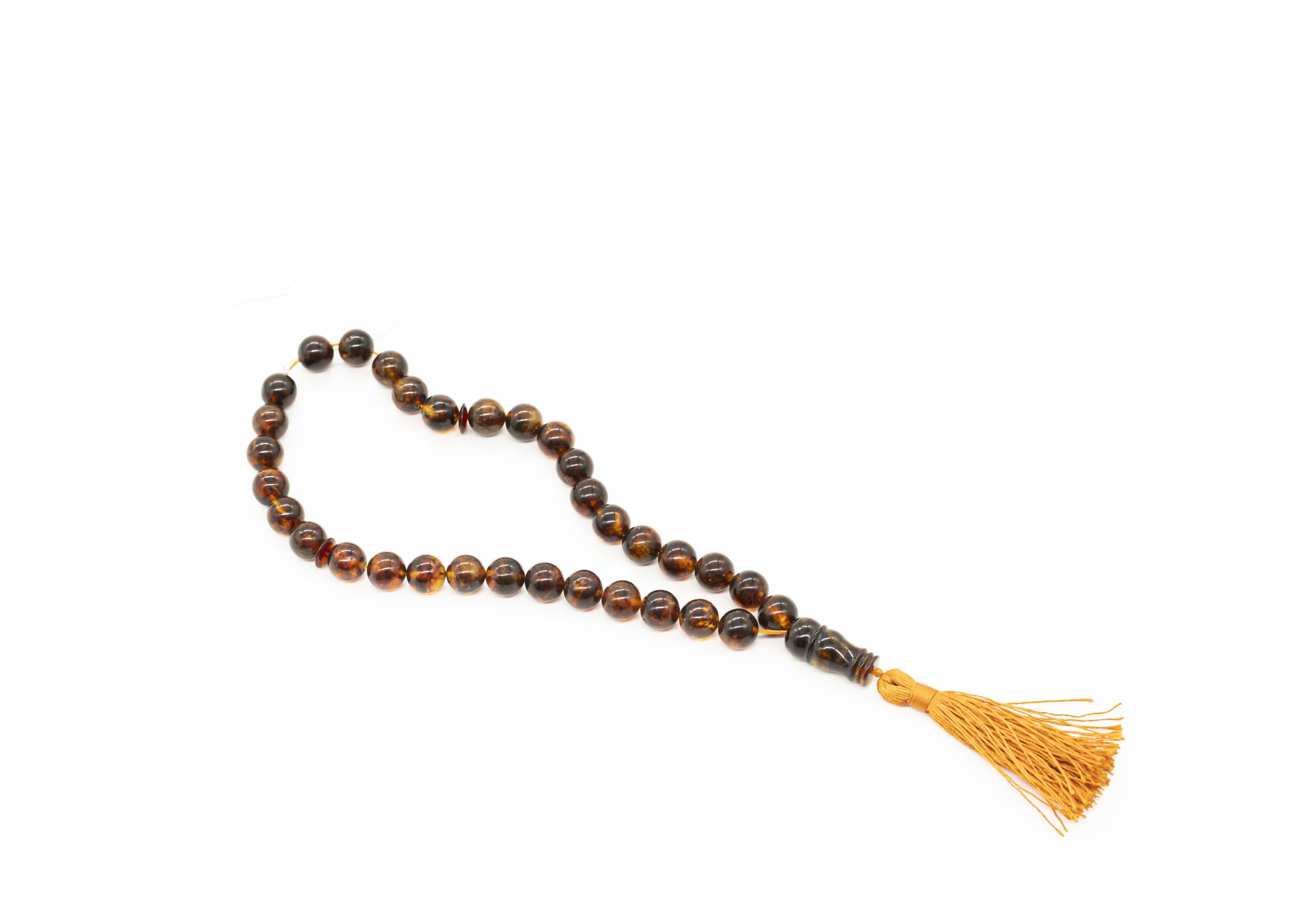 Gintarinis tamsios konjako spalvos gintaro musulmoniškas rožančius, suvertas ant šilkinės virvelės, sudarytas iš 33 burbuliukų bei šilkinio kuto.