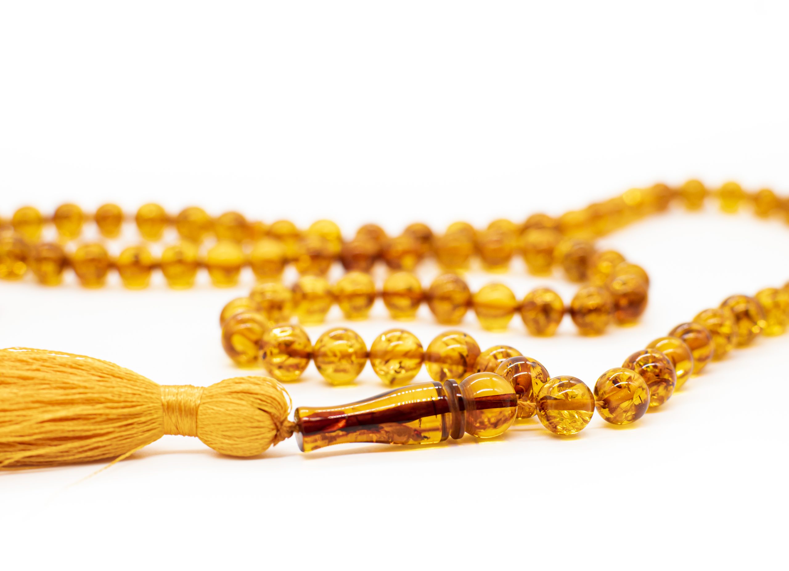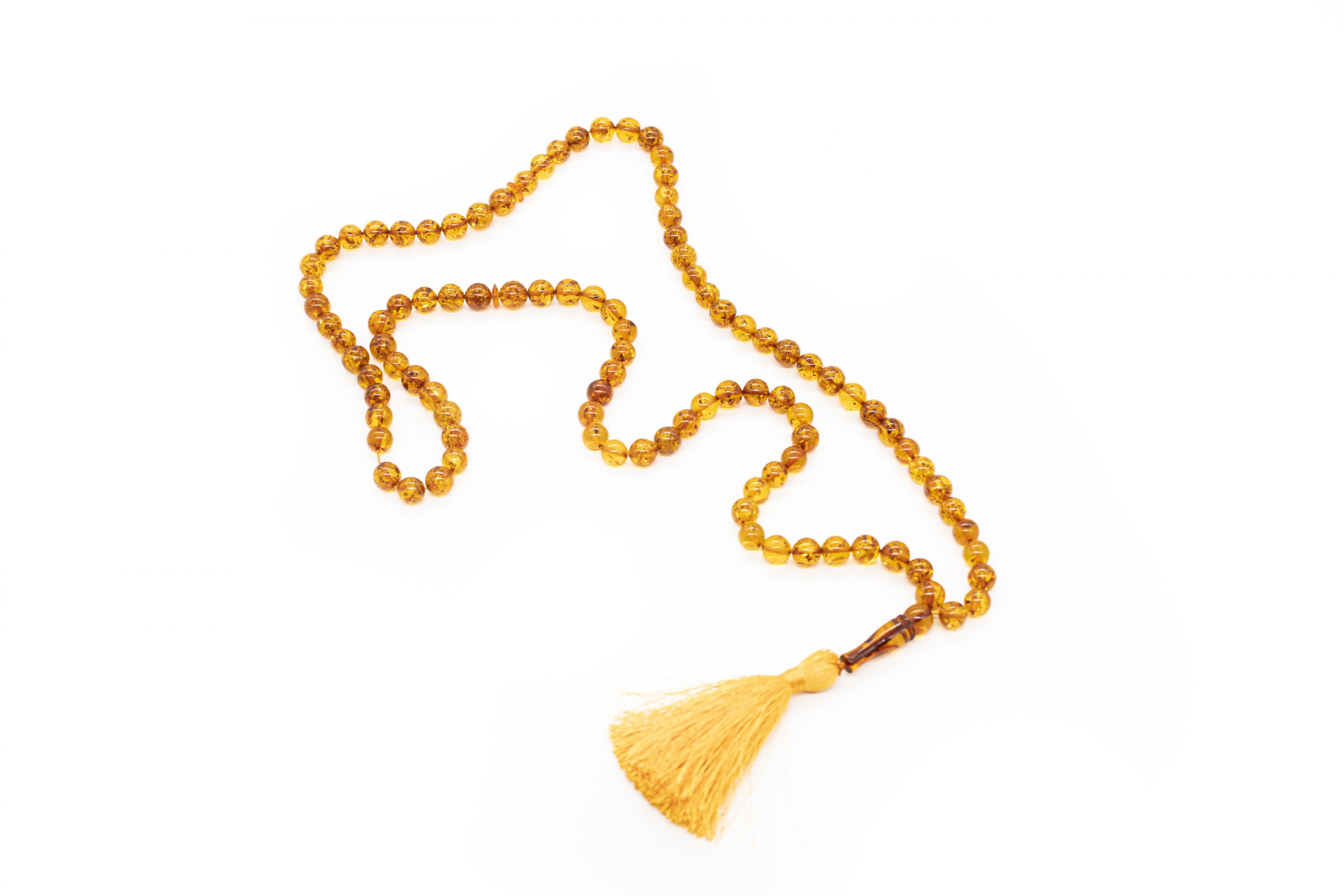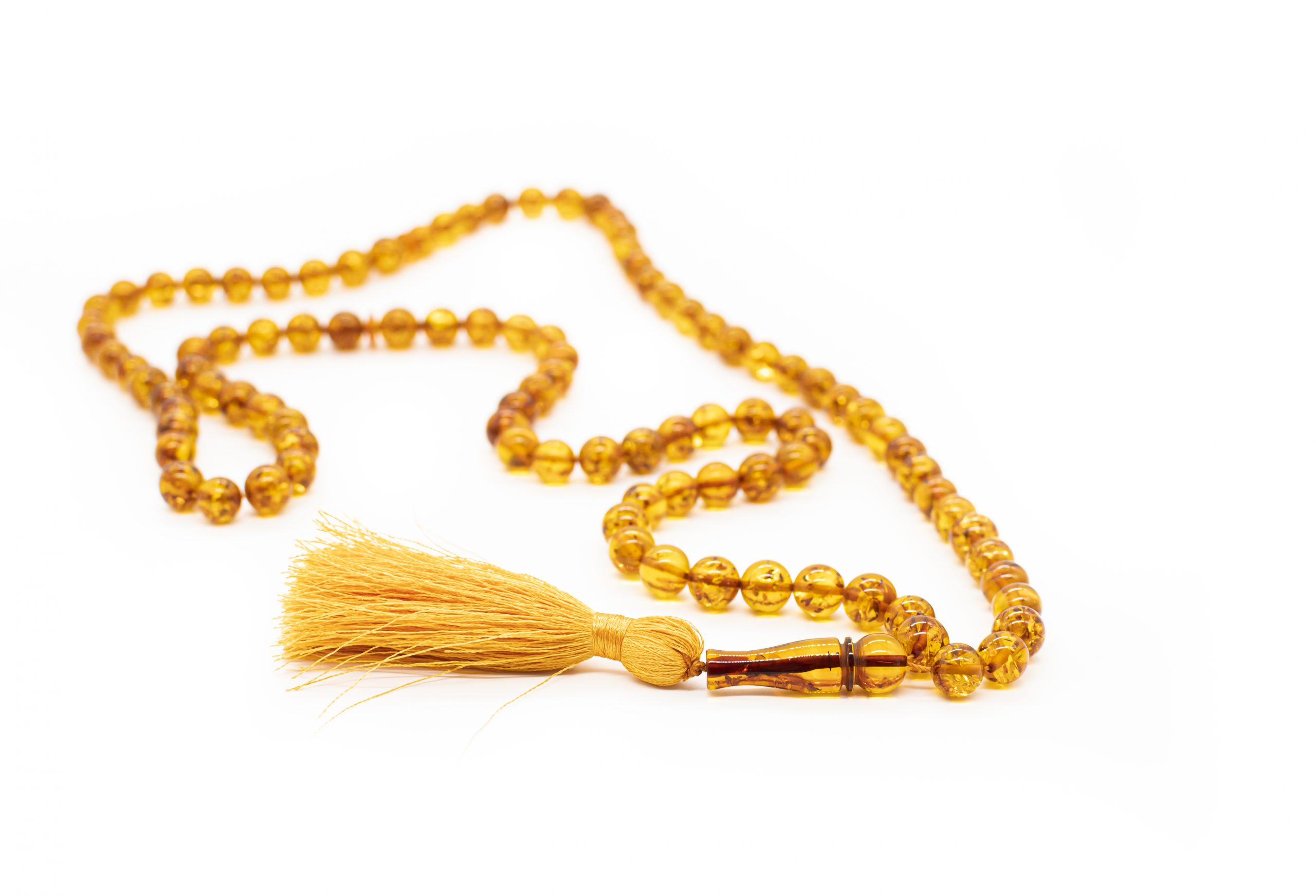 Ilgas tradicinės spalvos gintaro musulmoniškas rožančius iš 99 burbuliukų bei šilkinio kuto.