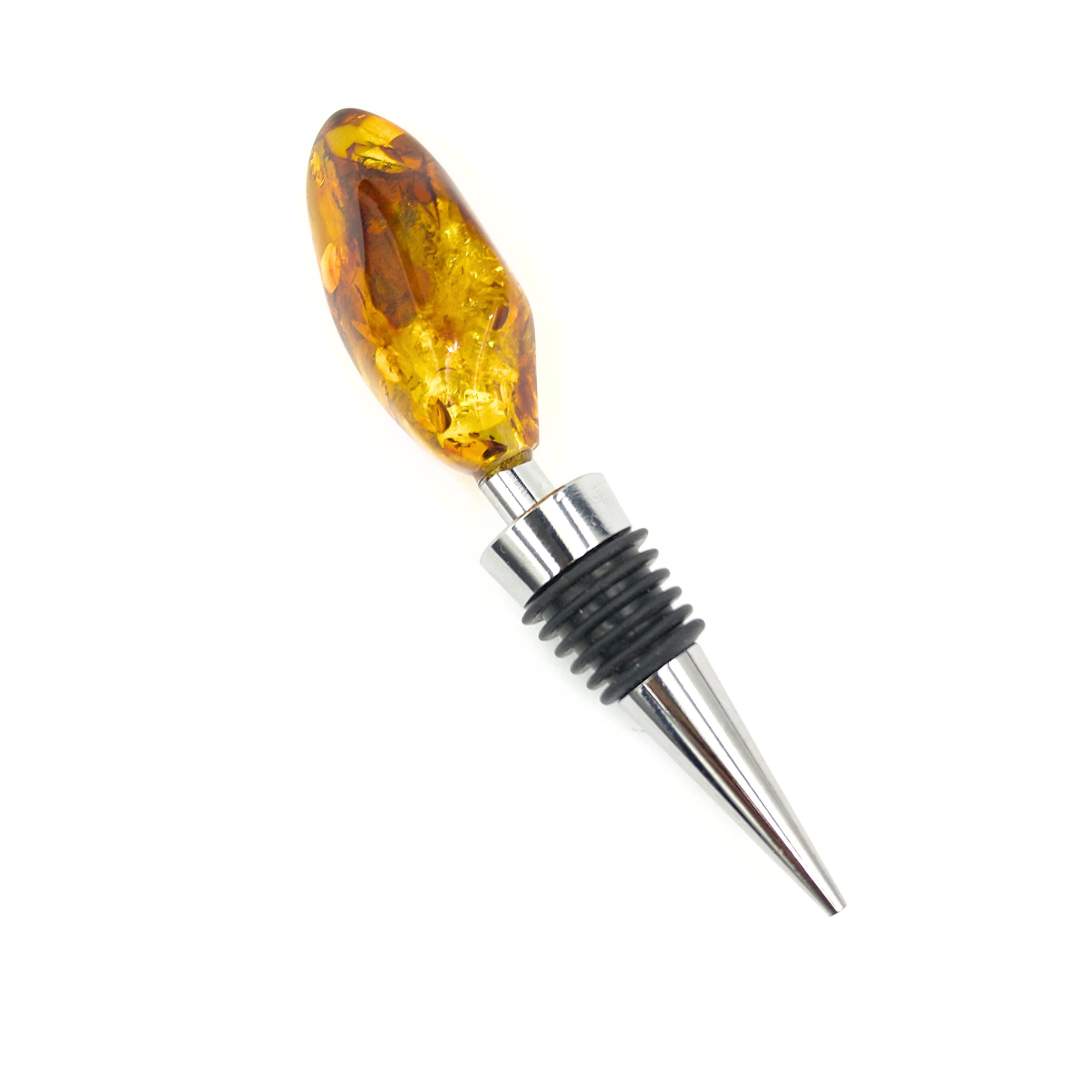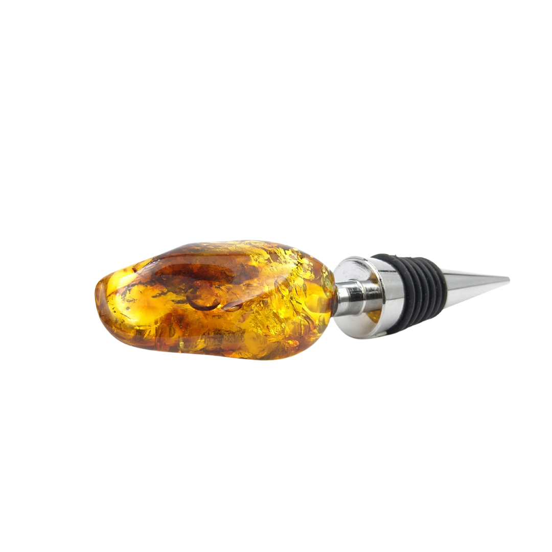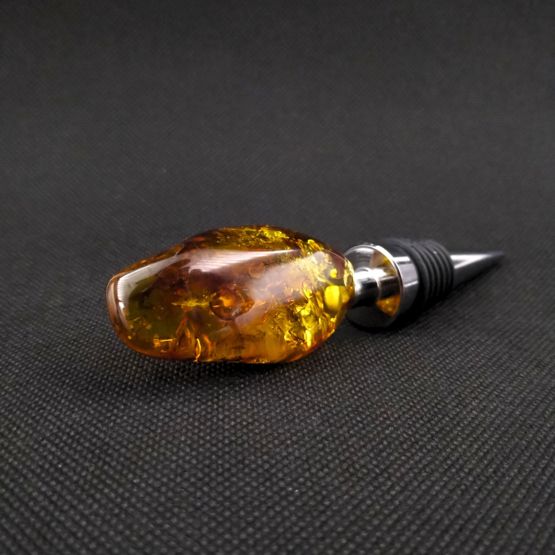 Vyno kamštis dekoruotas skaidriu medaus spalvo gintaru.