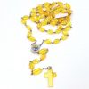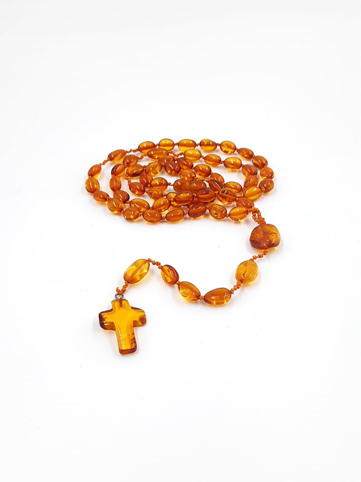 Gintarinis rožinis konjako spalvos su gintariniu kryželiu. Karokiukai netaisyklingos pupelės formos. Suvertas ant siūlo. Gale jungtas užsuktuku.