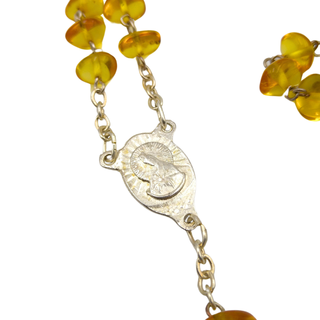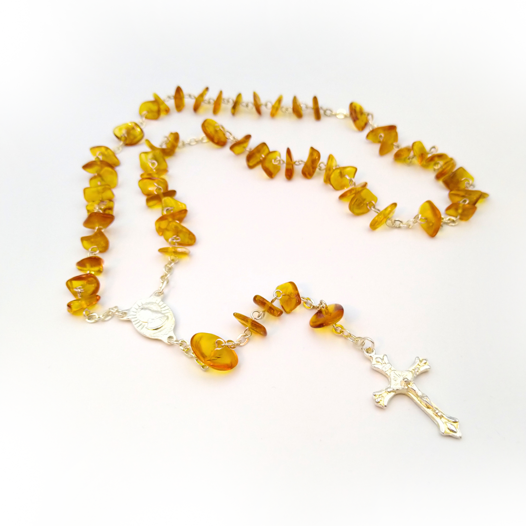 Katalikiškas rožinis medaus spalvos. Švelniai nugludinti netaisyklingos formos gintariukai sujungti melchioro detalėmis. Melchioras pasižymi sidabriškai balta spalva ir yra gana atsparus korozijai. Medaus spalvos karoliukai puikiai dera su sidabriškai baltu kryželiu, suteikiant rožiniui išskirtinį, šiltą ir elegantišką vaizdą. Rankų darbo katalikiškas rožinis ne tik atlieka savo pagrindinę funkciją maldai, bet ir tampa gražia relikvija, kuri gali būti perduodama iš kartos į kartą.