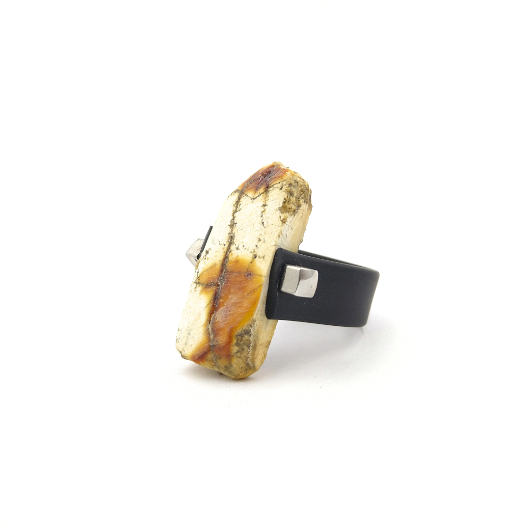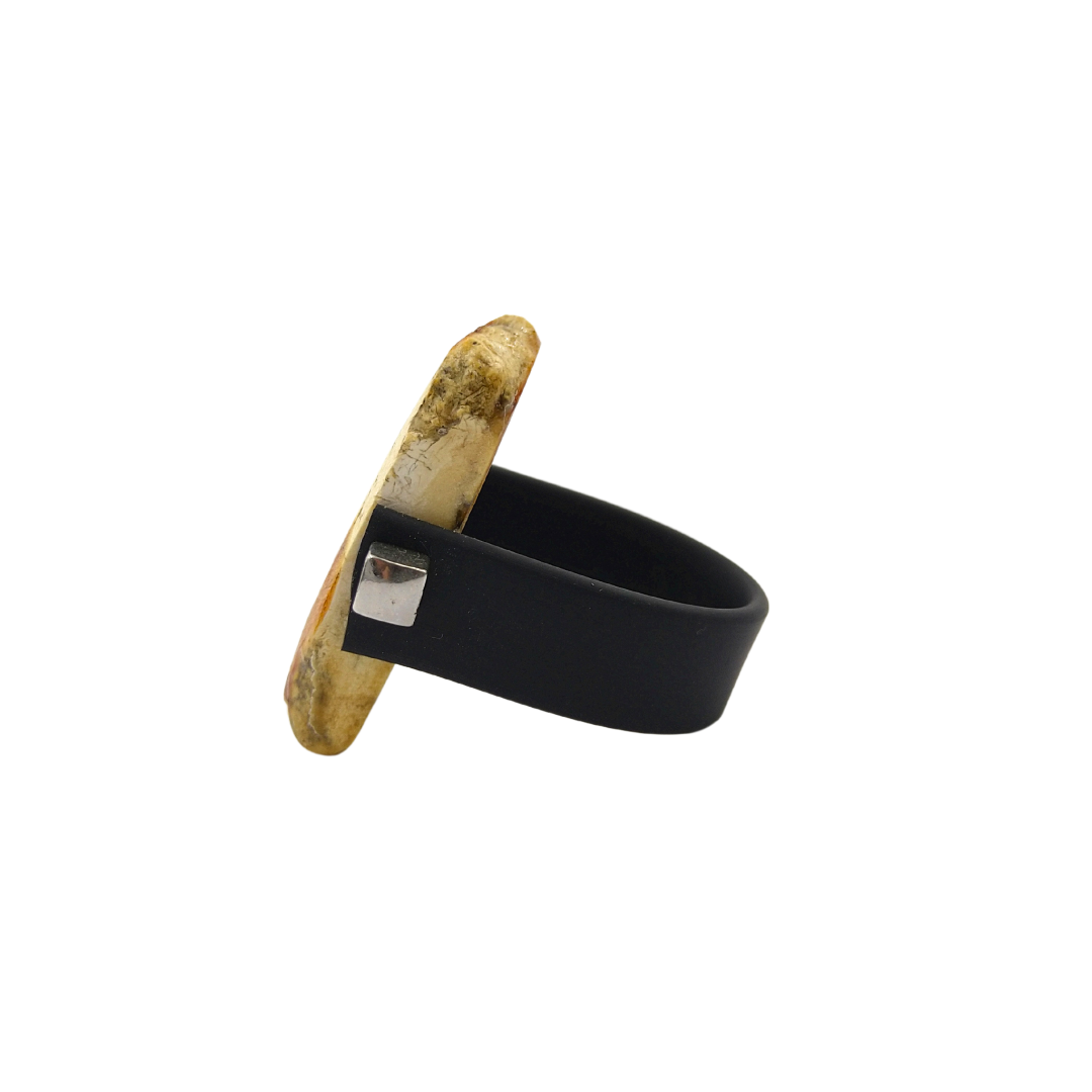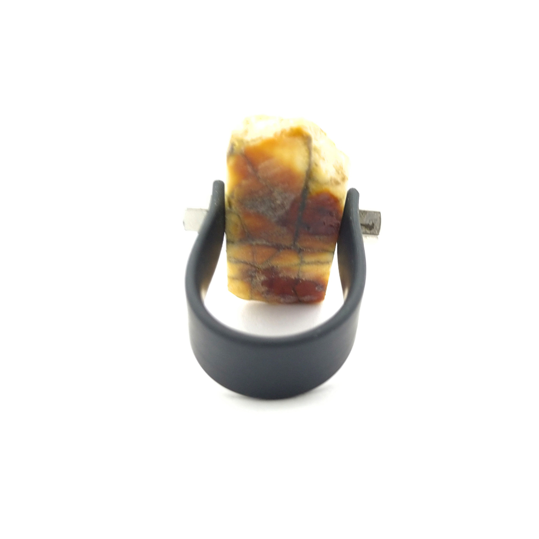 Kaučiukinis žiedas puoštas matine gintaro plokštele.