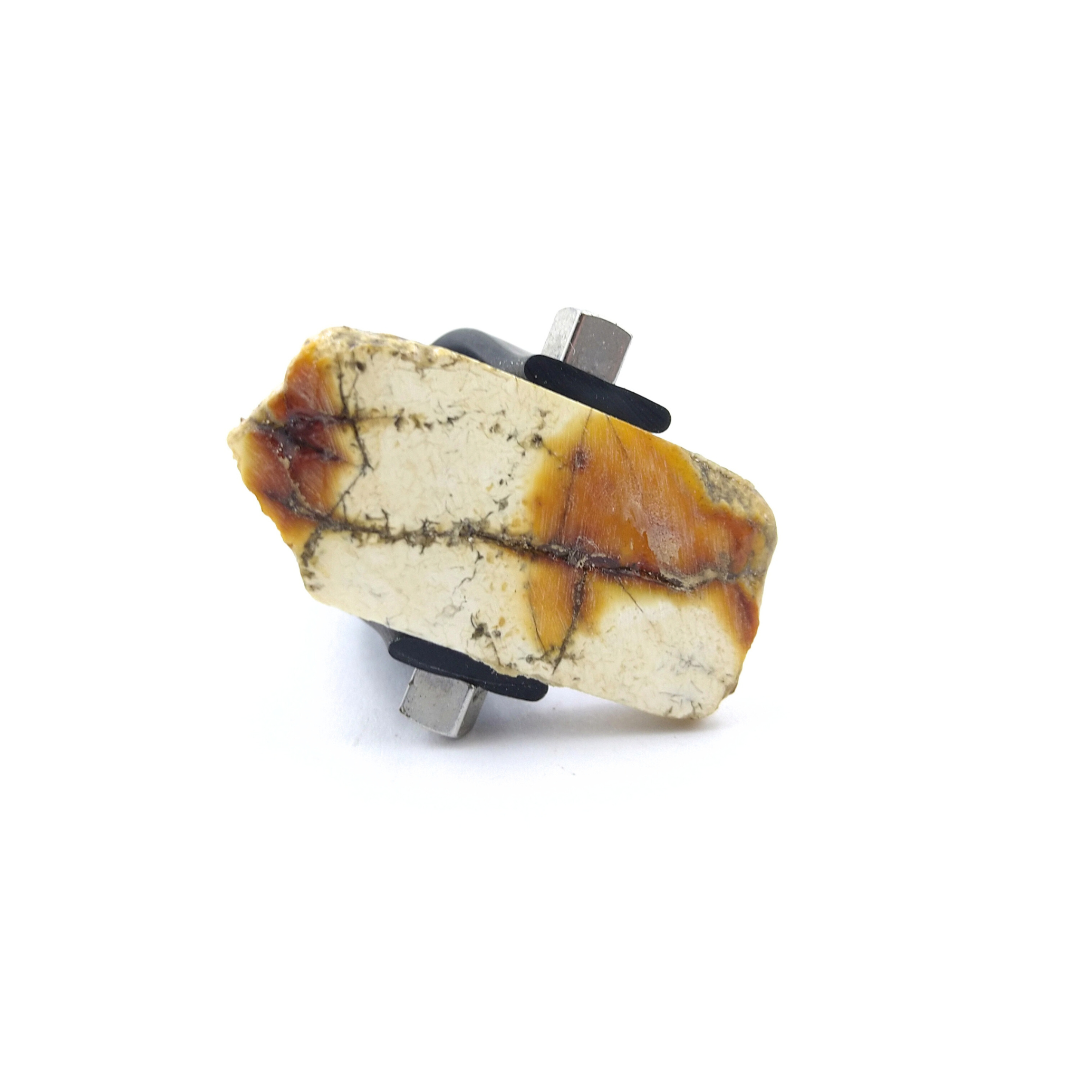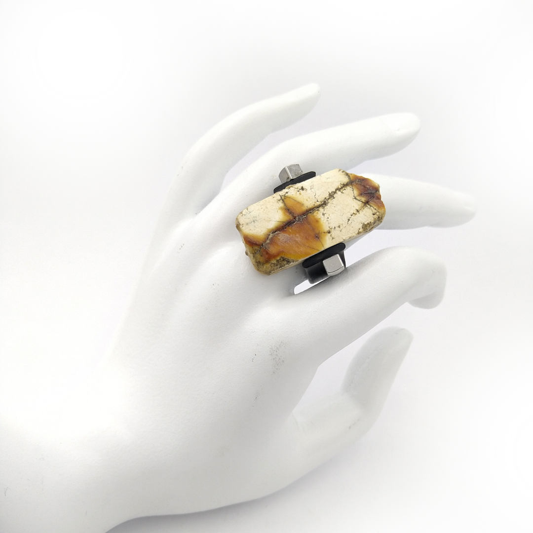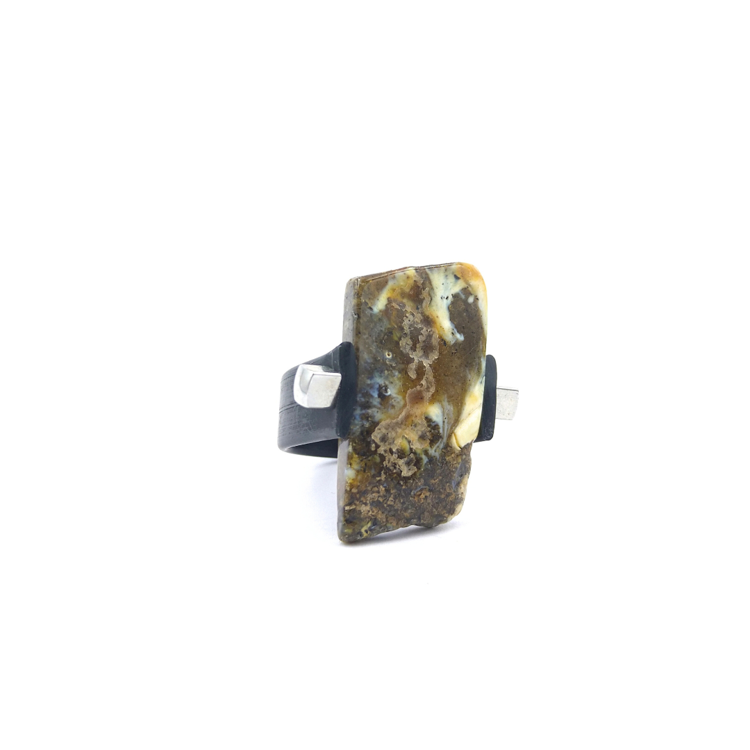 Kaučiukinis žiedas puoštas matine gintaro plokštele.