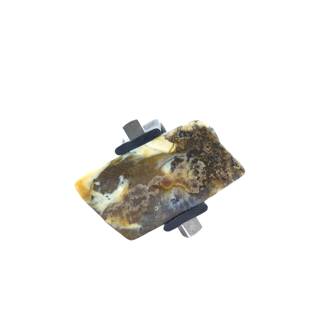 Kaučiukinis žiedas puoštas matine gintaro plokštele.