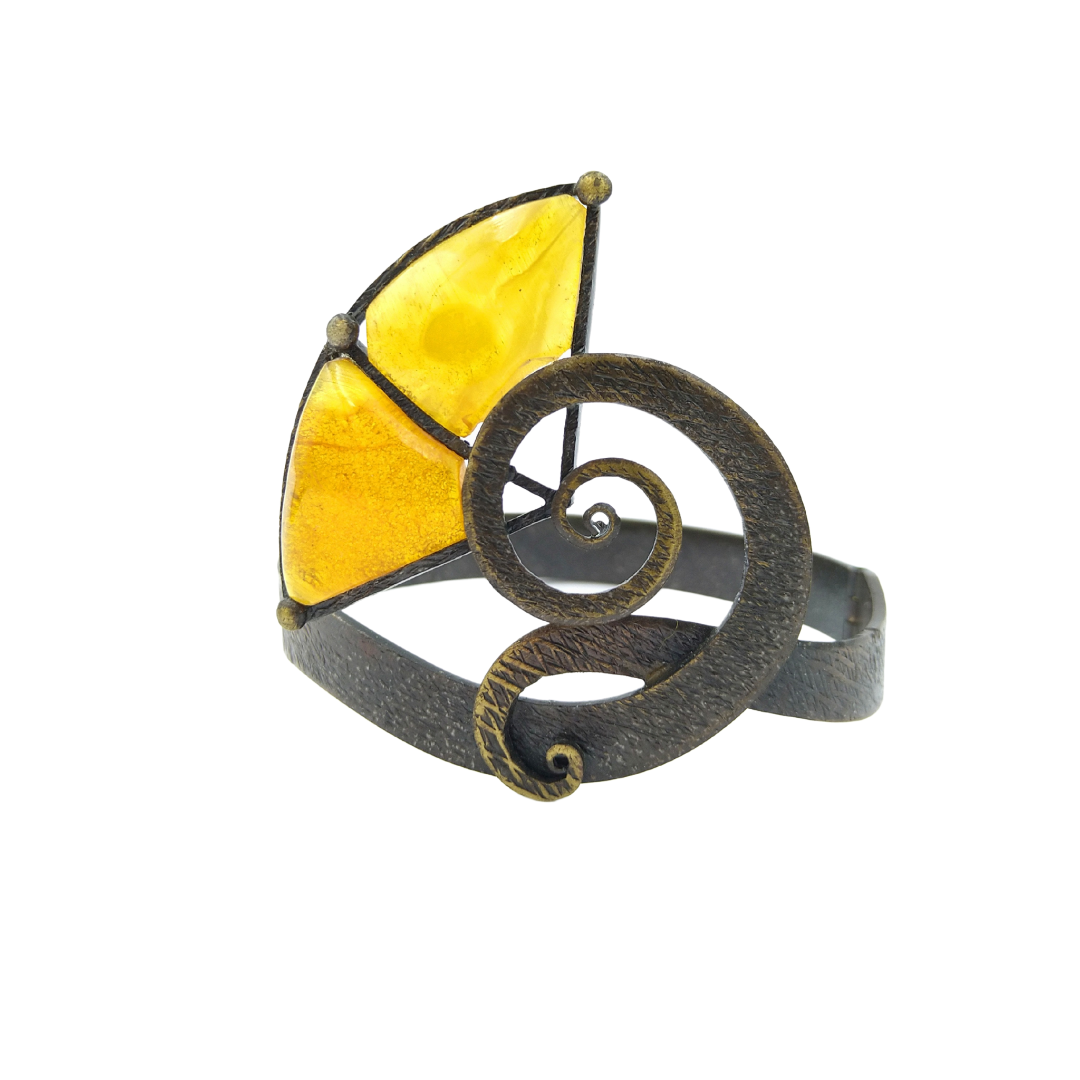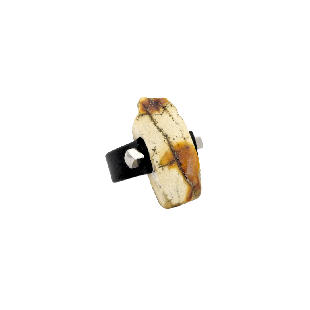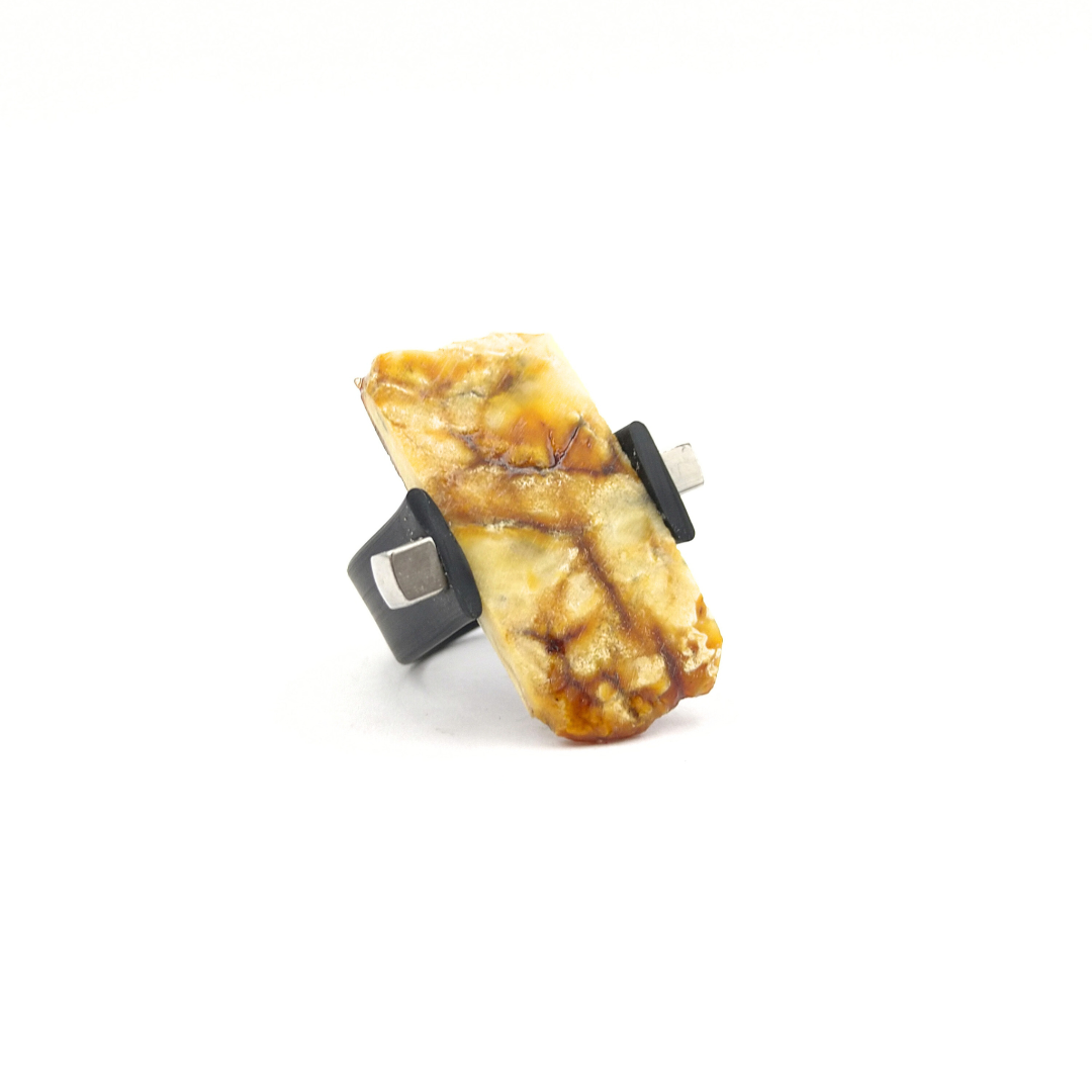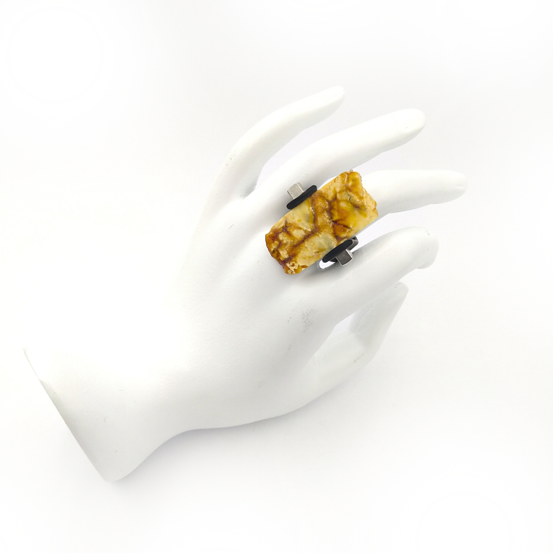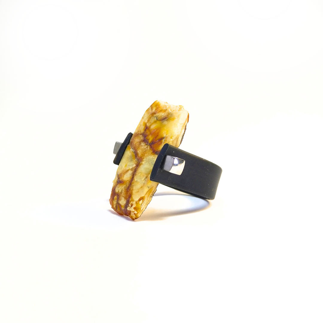 Kaučiukinis žiedas puoštas matine gintaro plokštele.