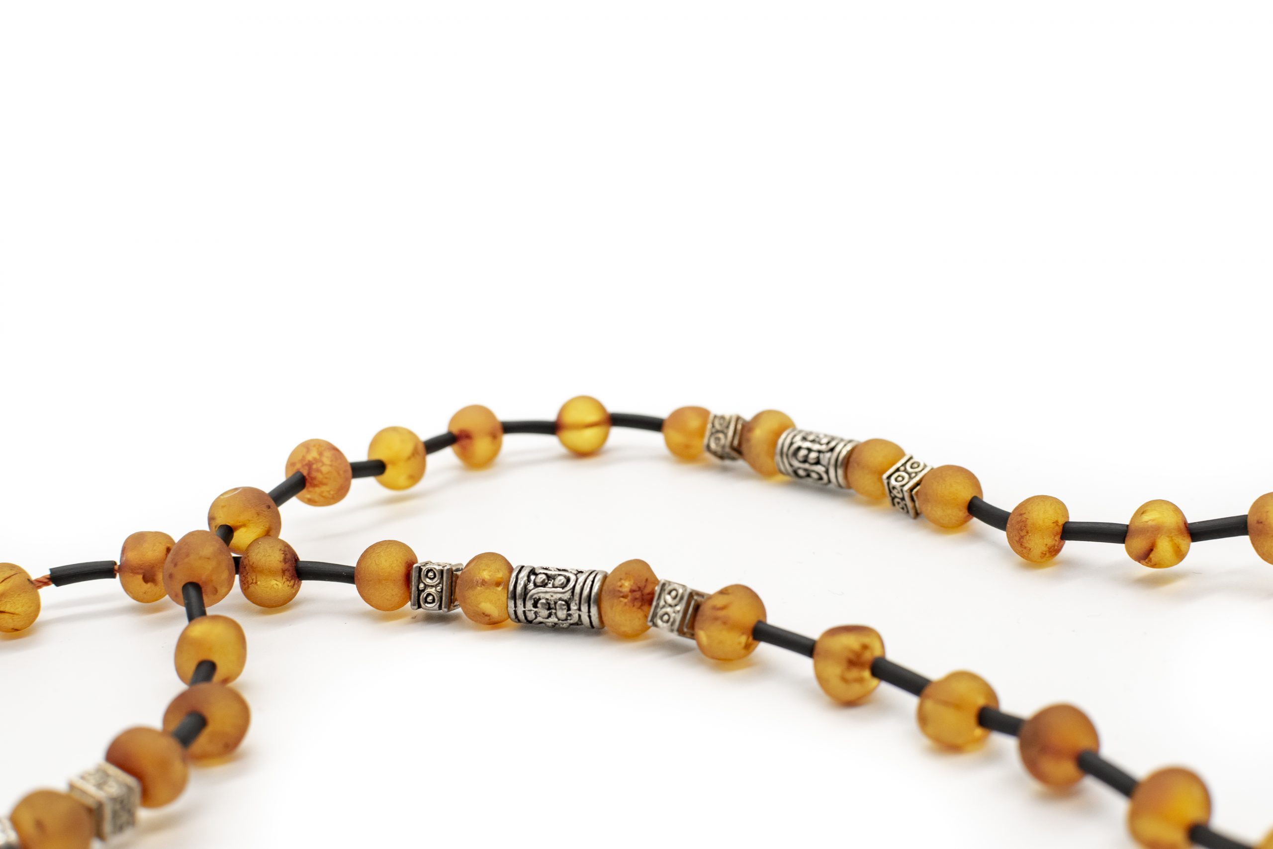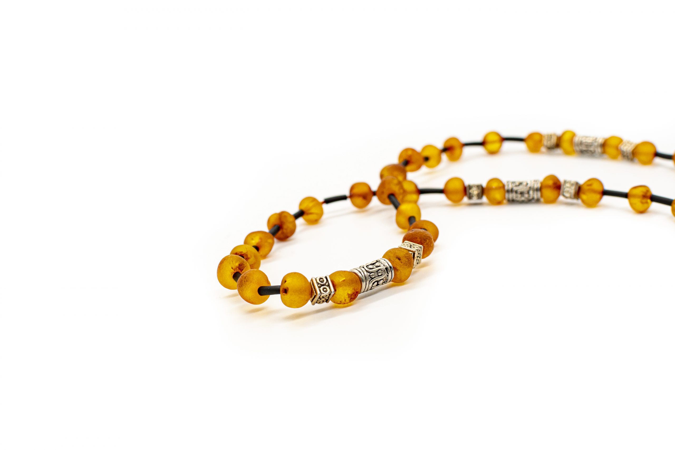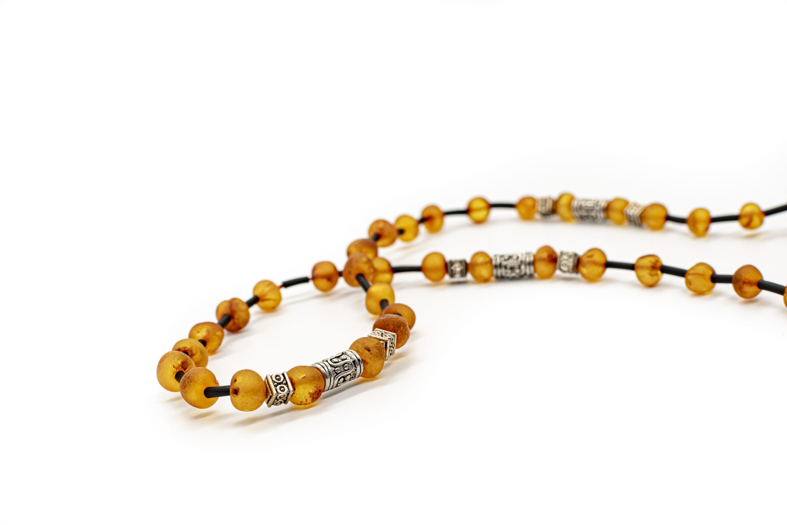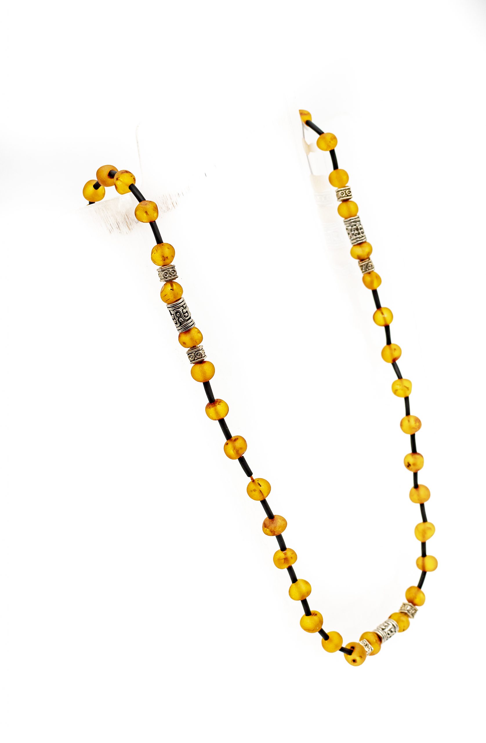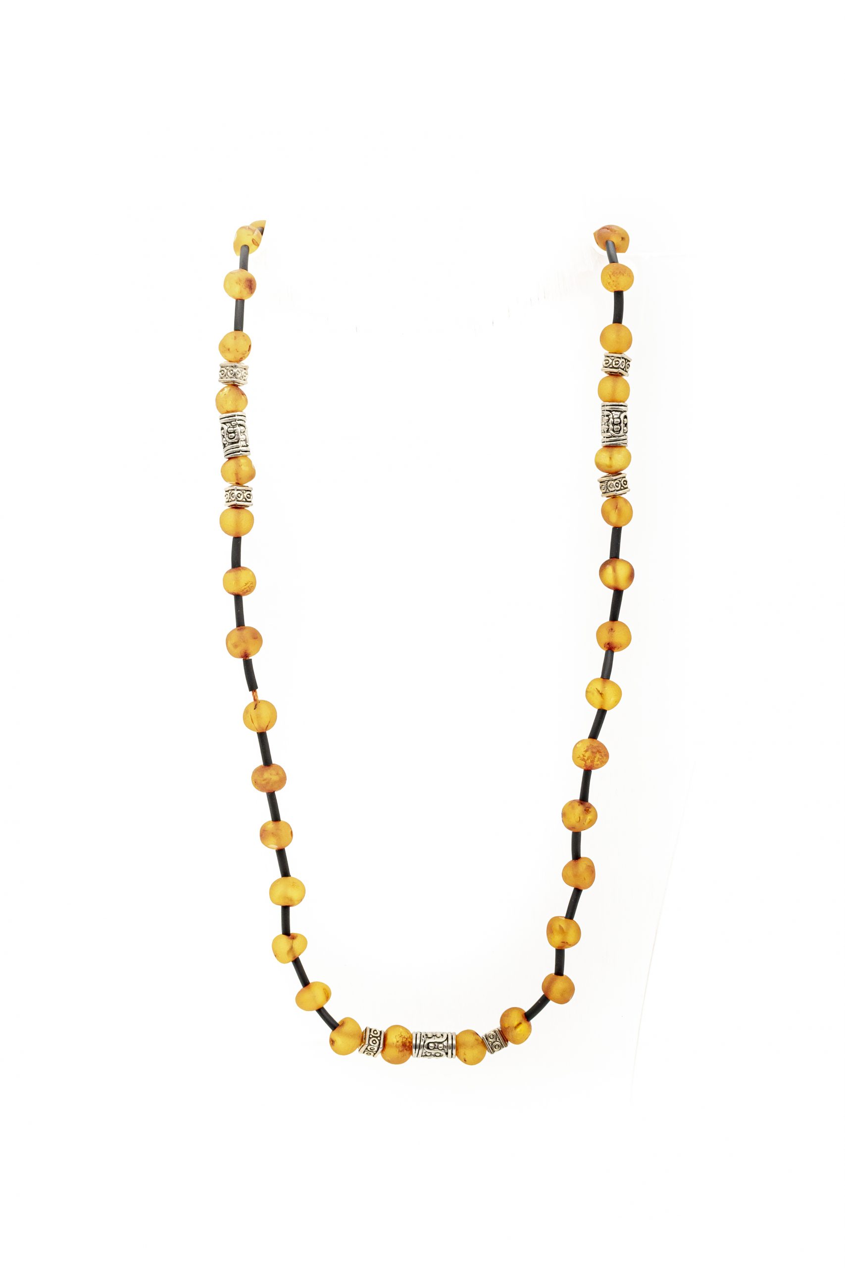 Šviesaus konjako spalvos vyriški gintaro karoliai su stilingomis metalinėmis detalėmis ir kaučiuku. Švelniai matinis gintaras, netaisyklingos formos burbuliukai.