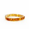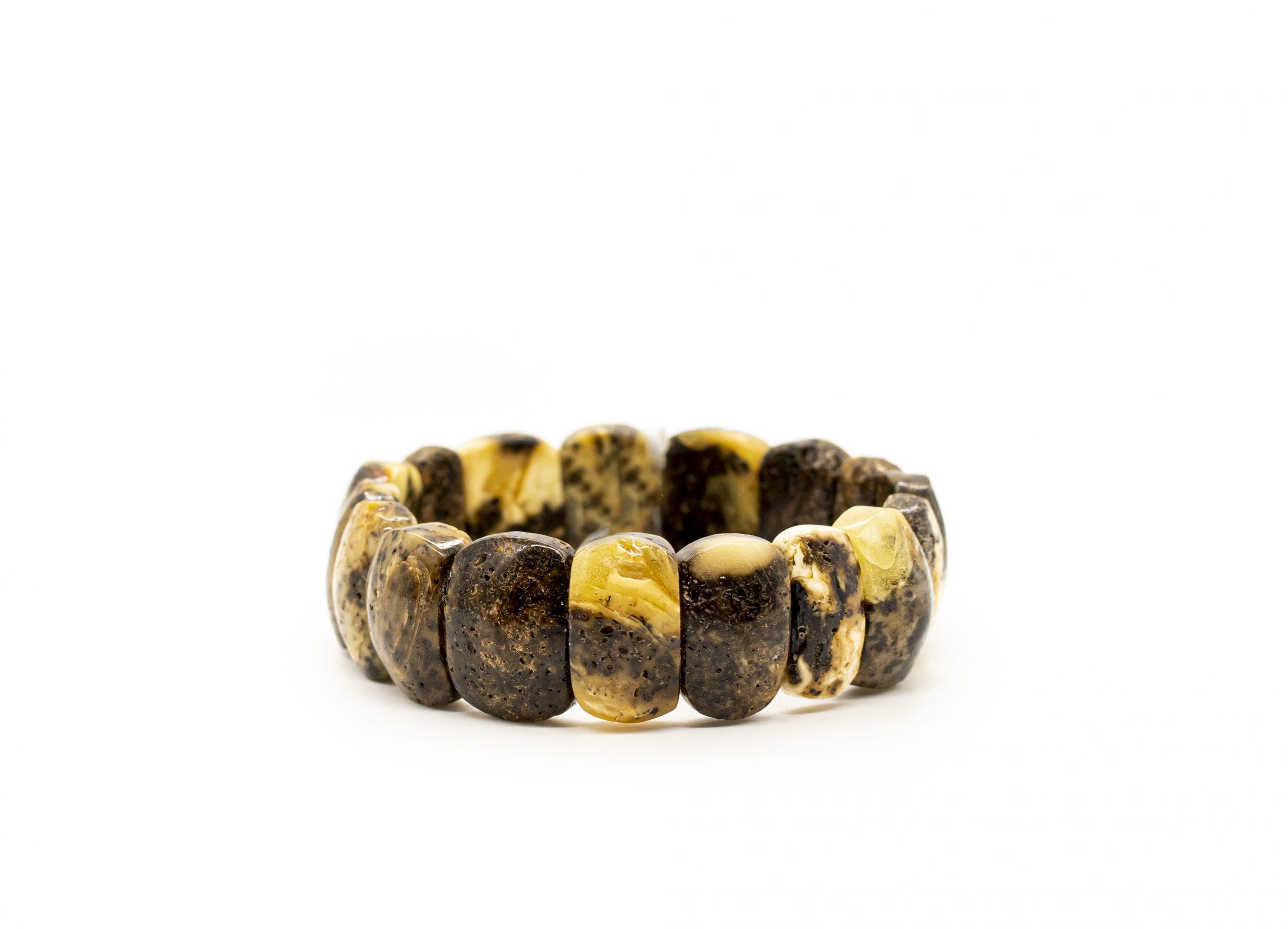 Vidutinio stambumo margo gintaro apyrankė iš plokštelių, kuriose originaliai maišomas juodas ir baltas gintaras. Apyrankė suverta ant gumytės.