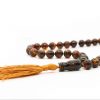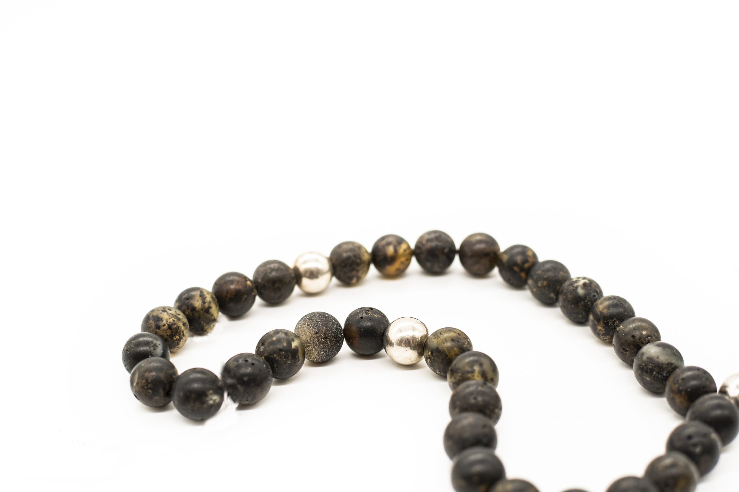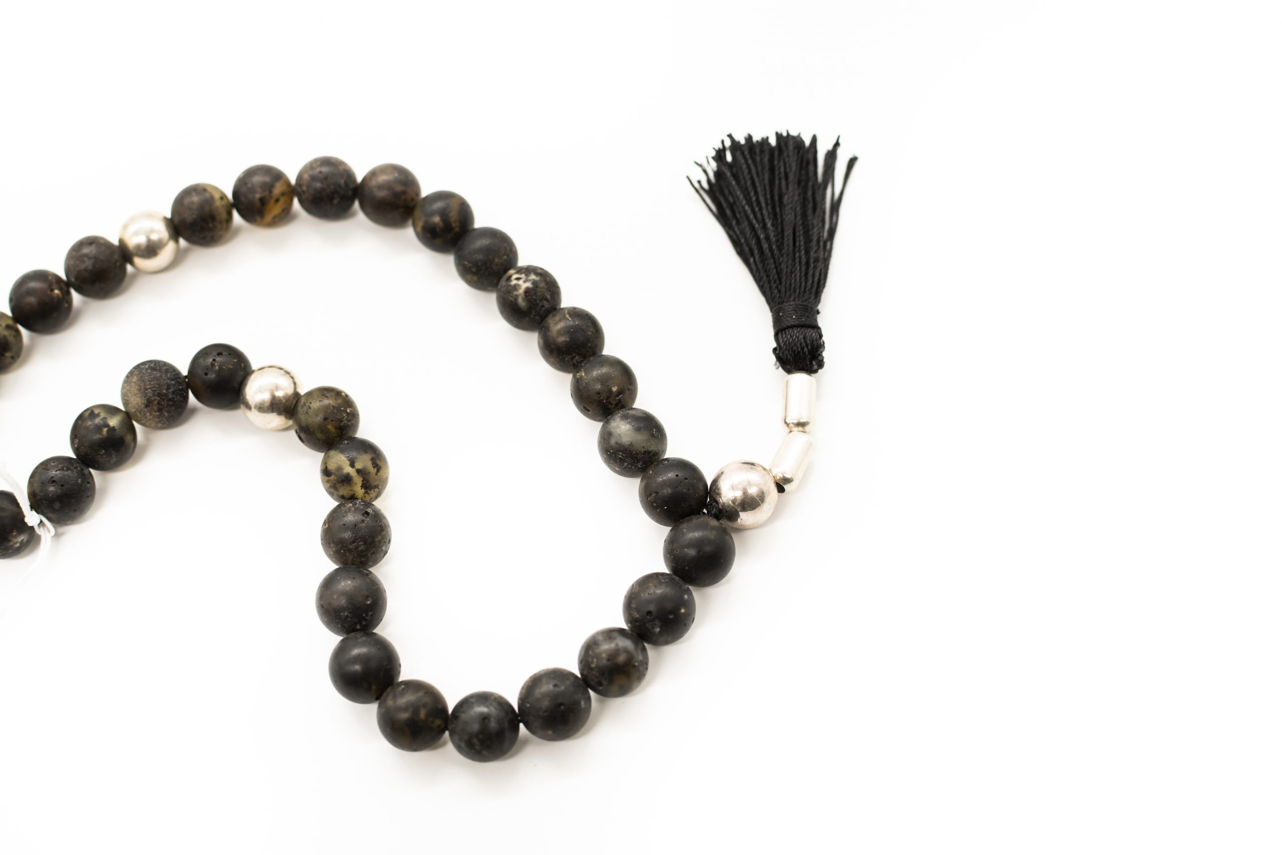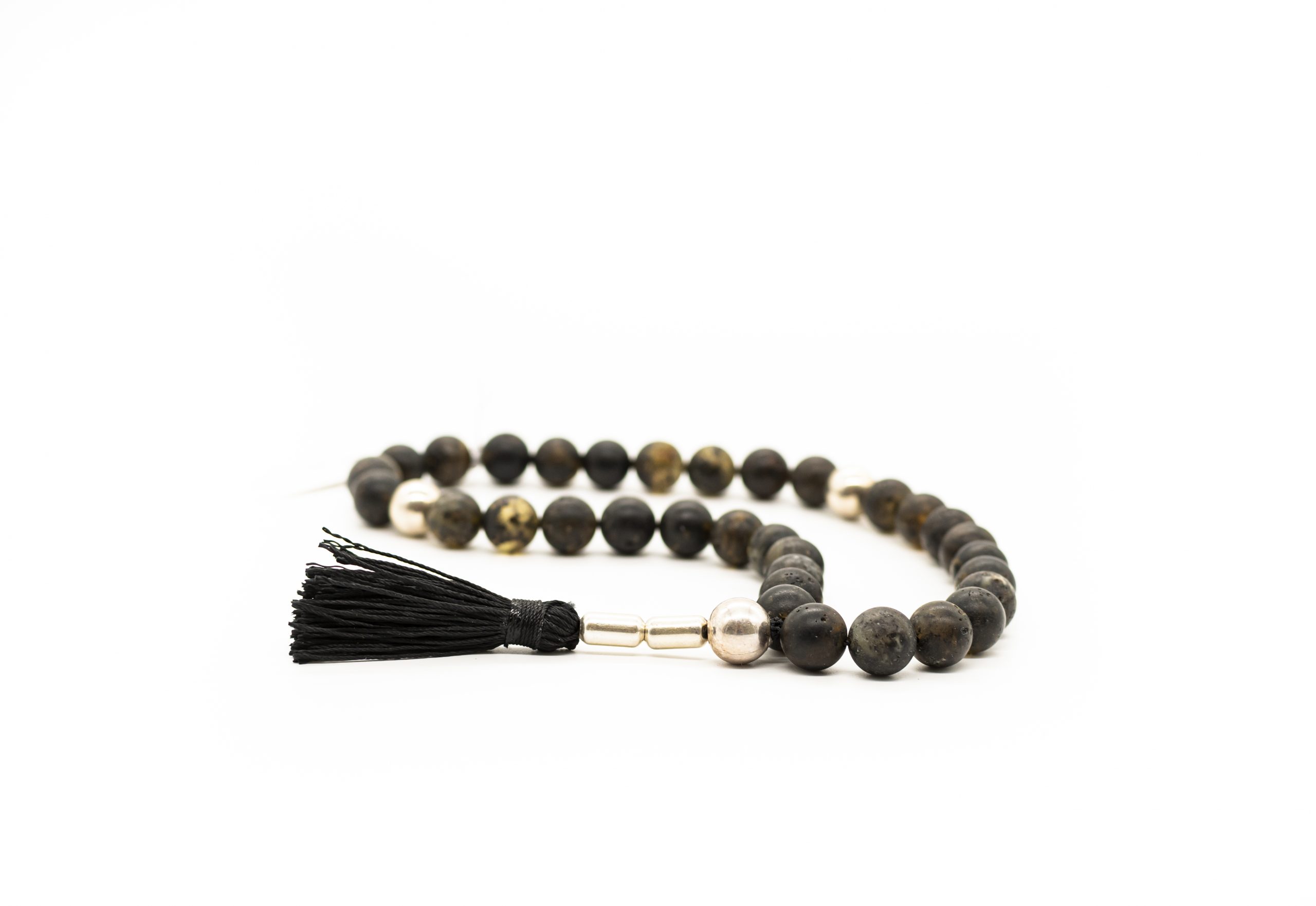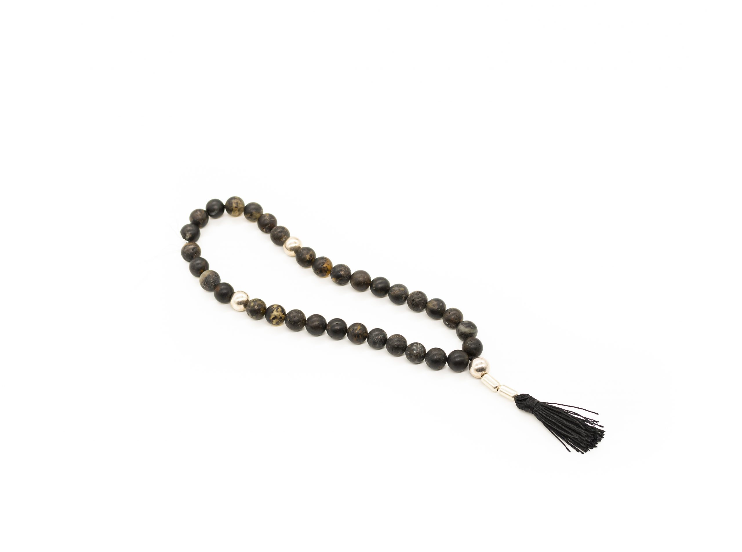 Tamsaus natūralaus matinio gintaro musulmoniškas rožančius su gydomojo sidabro detalėmis bei šilkiniu kutu. Rožančius sudarytas iš 33 gintarinių burbulų.