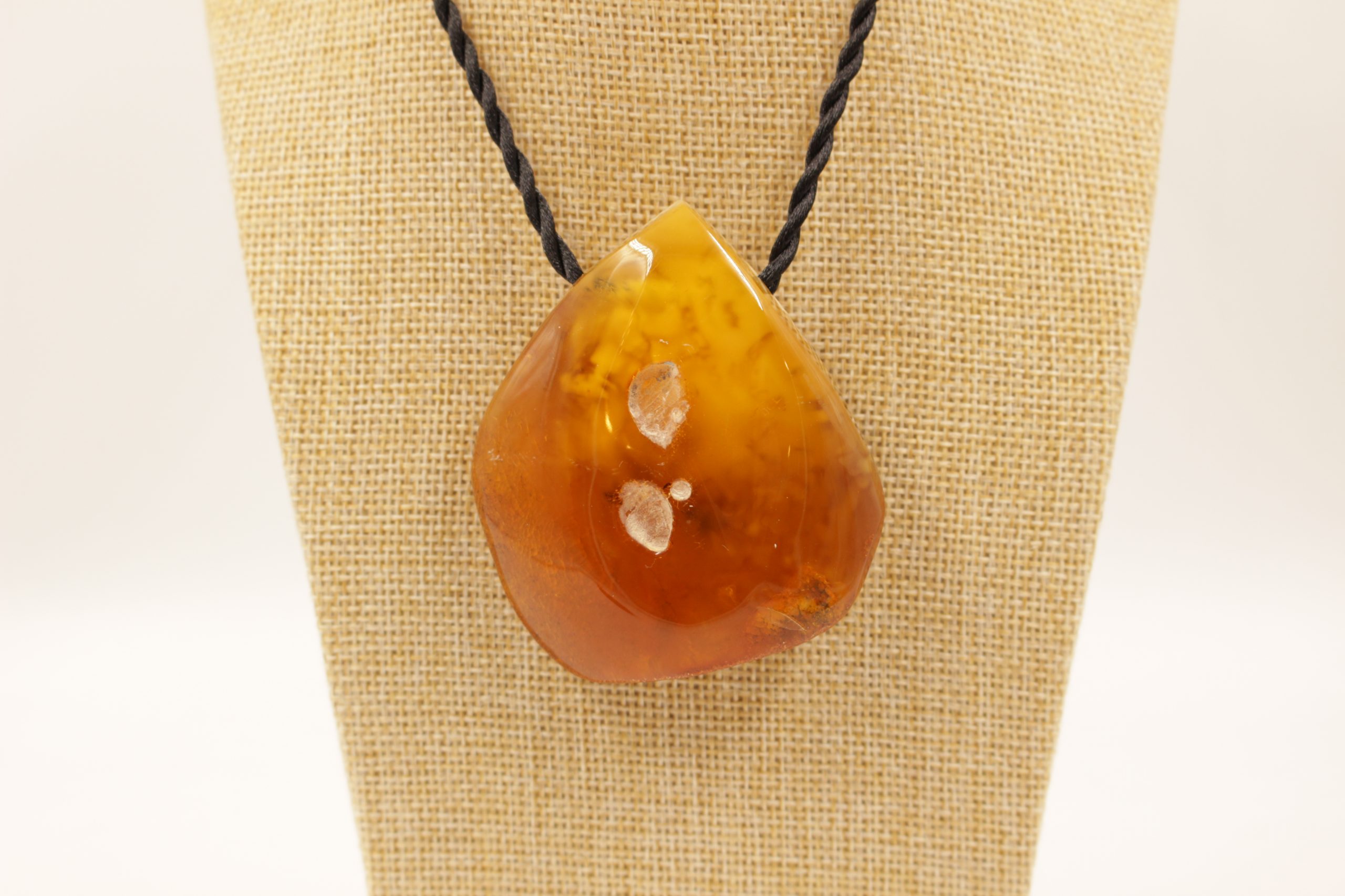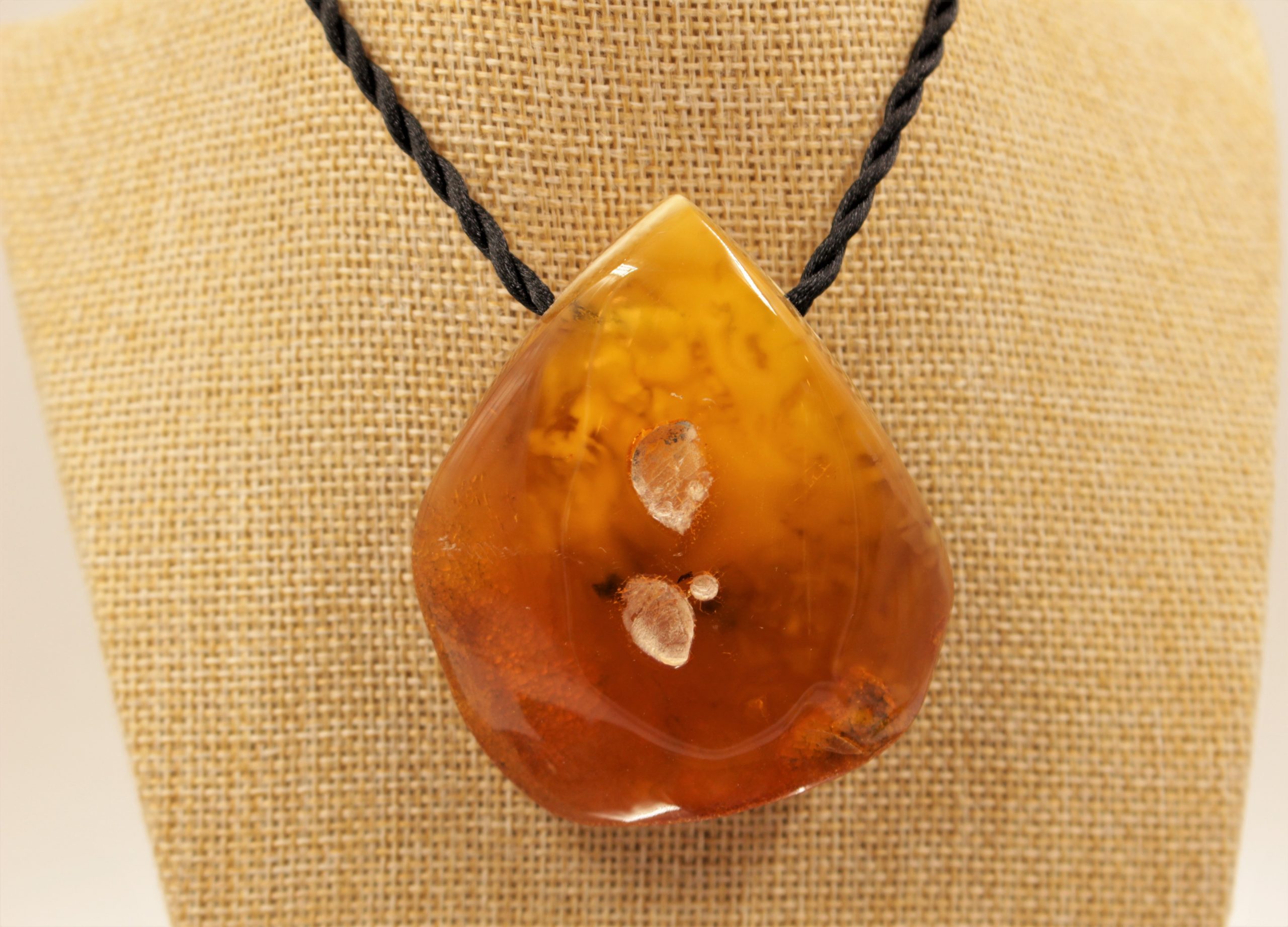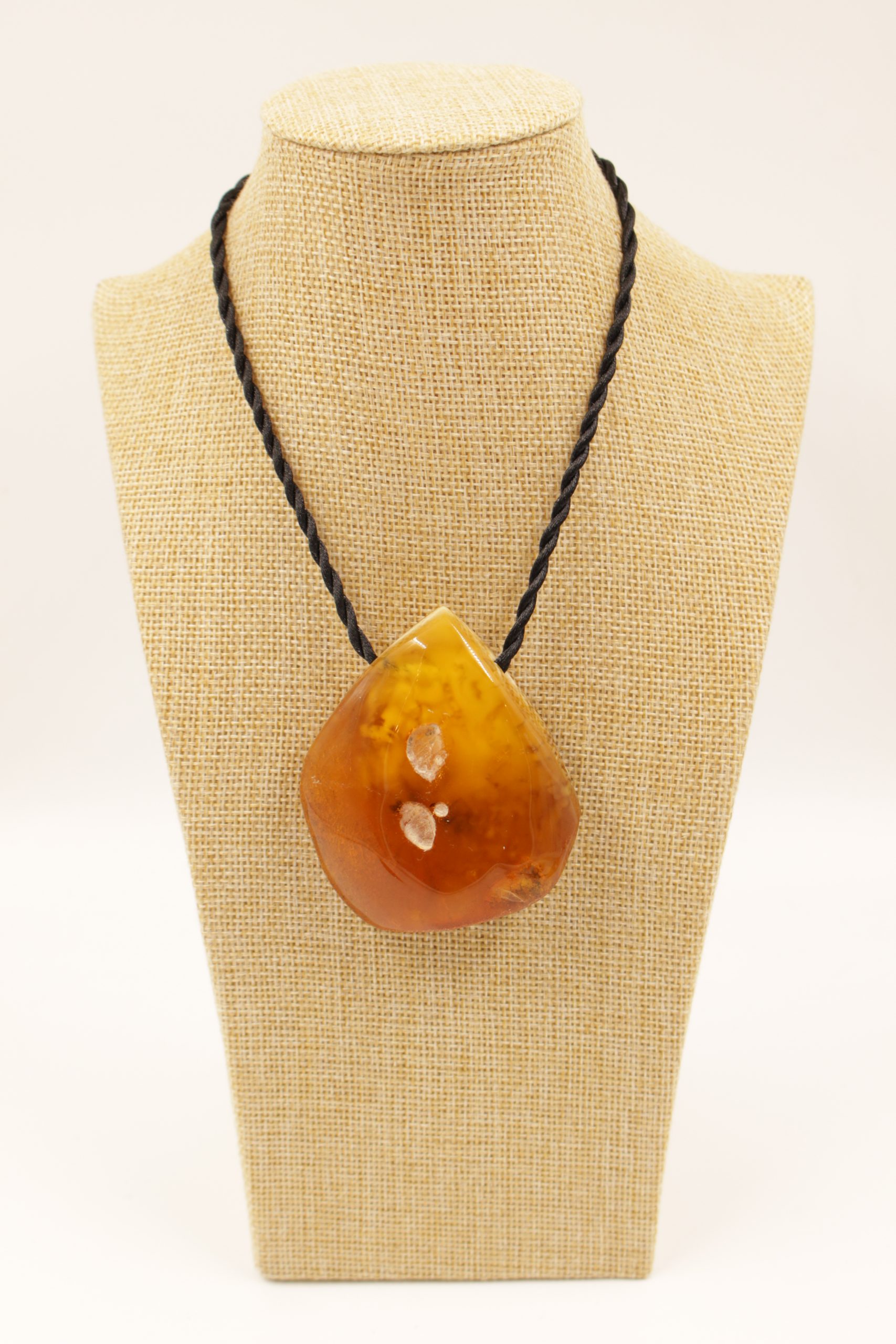 Natūralaus gintaro grynuolio kulonas, pakabintas ant virvutės, ilgis reguliuojamas. Gintaro viduje matosi dūminiai peizažai.