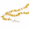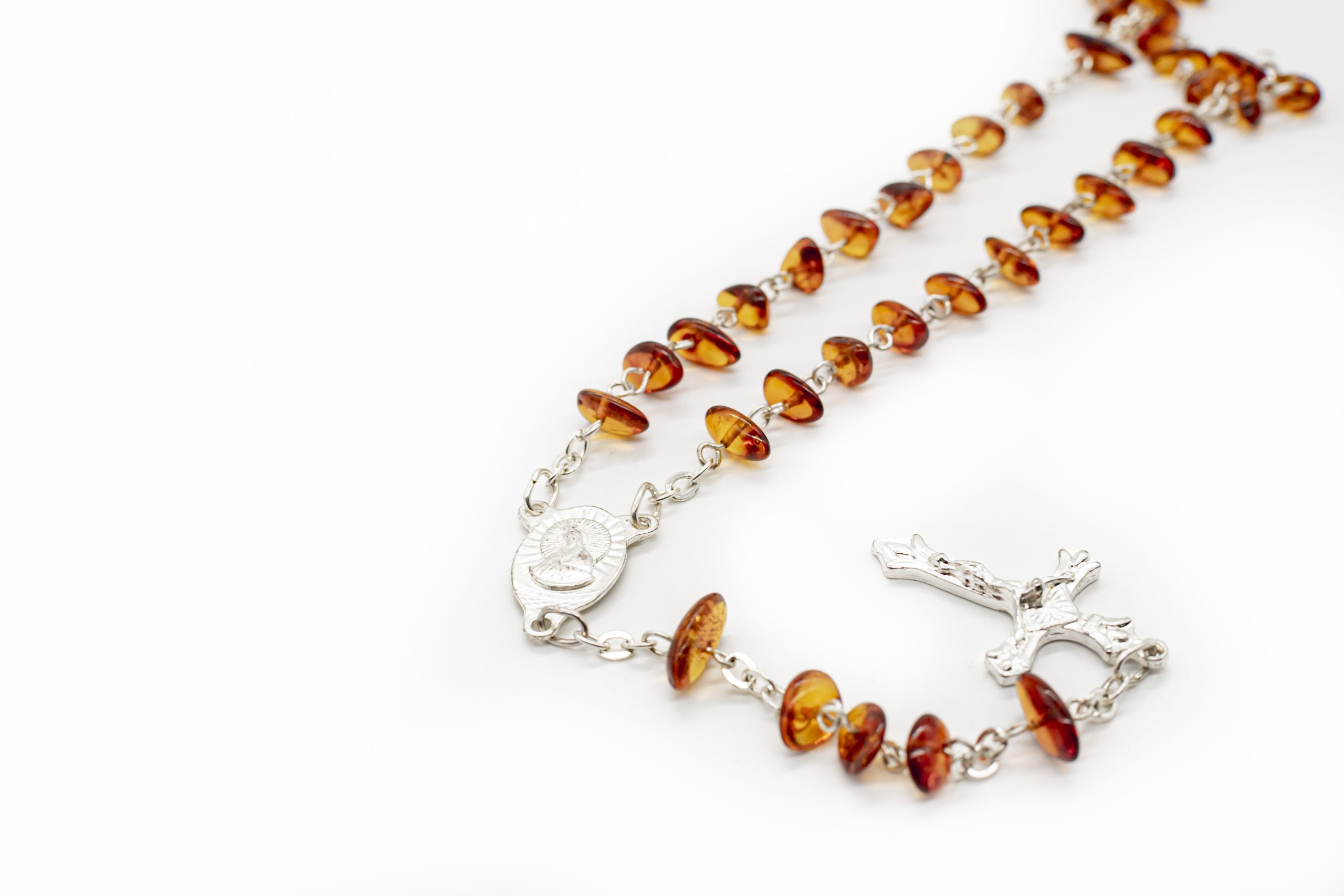 Natūralaus Baltijos gintaro rožančius, gamintas rankomis. Melchioro kryželis, pavaizduota Aušros Vartų Marija ir Jėzus.