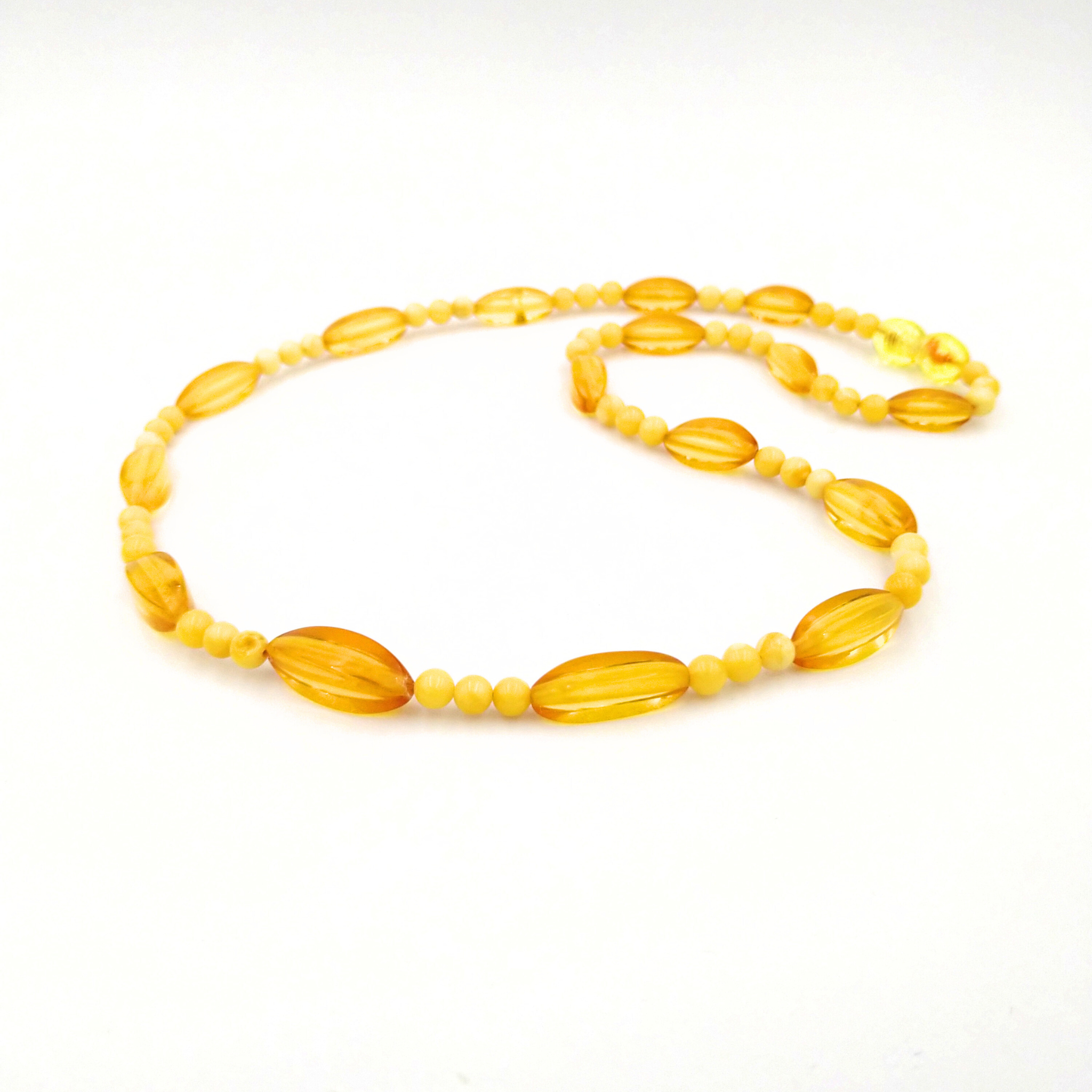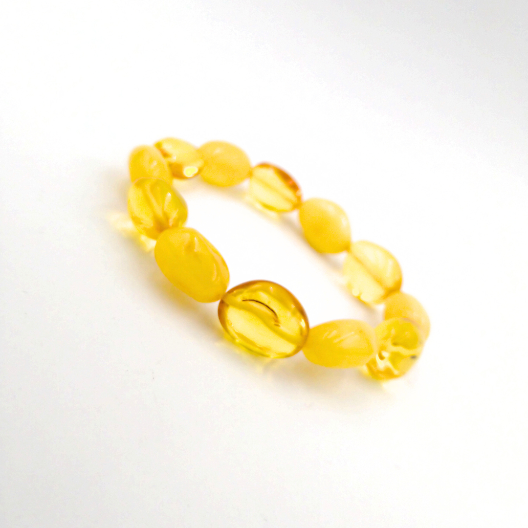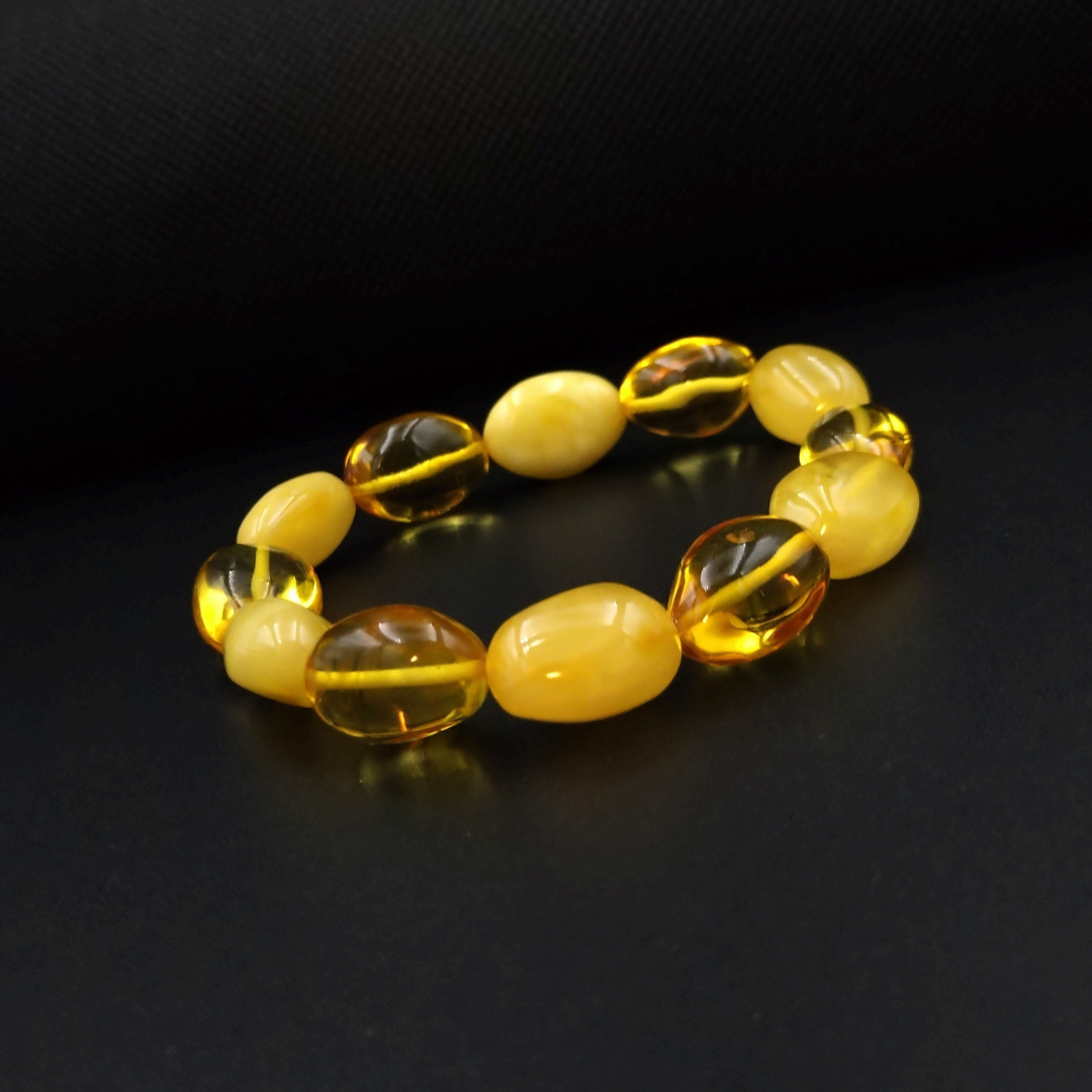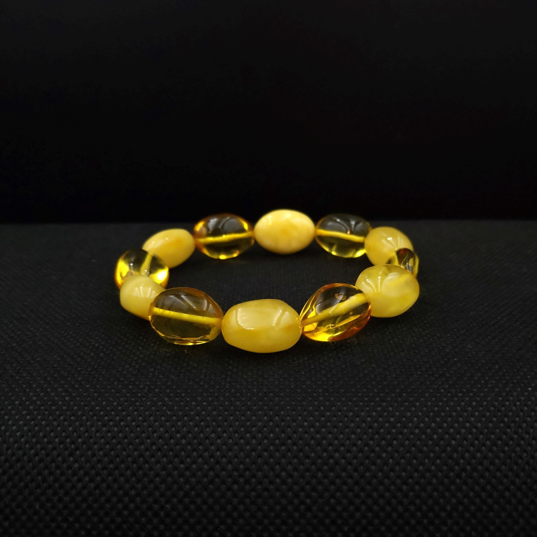 Netaisyklingos formos skaidraus ir matinio gintaro apyrankė ant gumos.