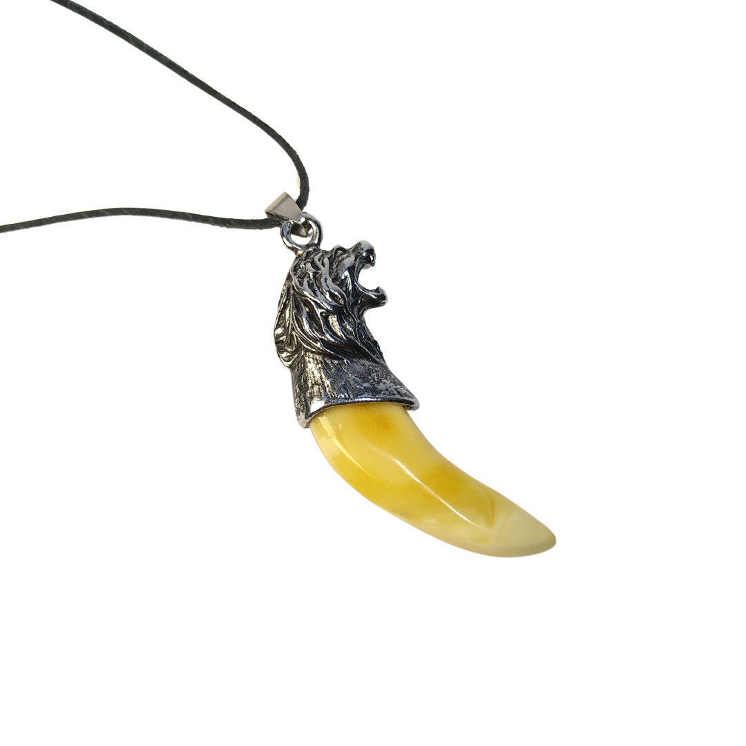 Balto gintaro „iltis” puošta nerūdyjančio plieno liūto atvaizdu. Parduodamas su odine virvele.