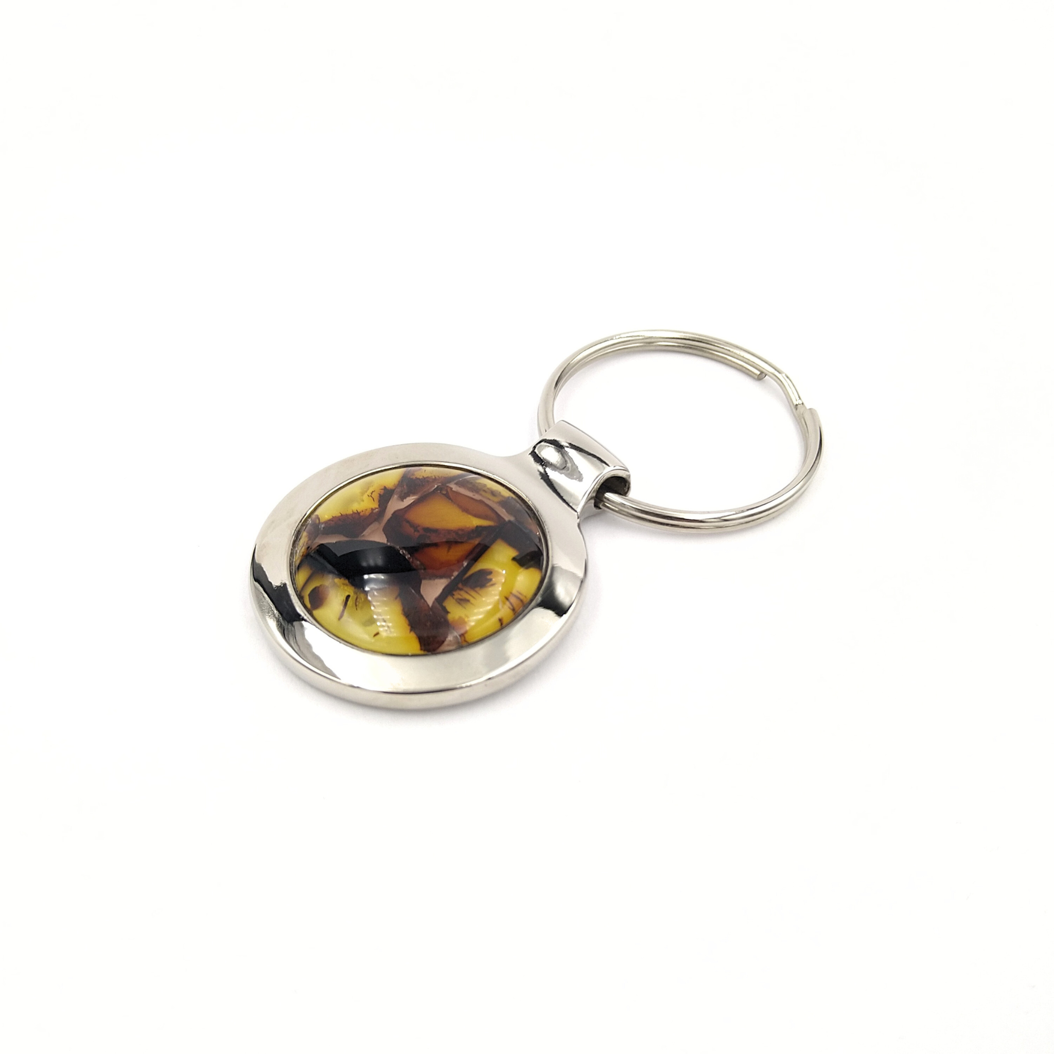 Raktų pakabukas apvalus su gintaru – elegantiškas ir stilingas aksesuaras. Melchioro rėmelis suteikia pakabukui rafinuotumo ir kontrasto. Šis sidabro spalvos metalas žinomas dėl savo atsparumo korozijai ir patvarumo. Gintaro plokštelė pagaminta iš natūralaus Baltijos gintaro, kurioje susilieja spalvų įvairovė nuo švelniai geltonos iki tamsiai rudos. Kiekviena gintaro plokštelė  su savita spalvine gama yra unikali, tai daro aksesuarą ypatingą ir išskirtinį.