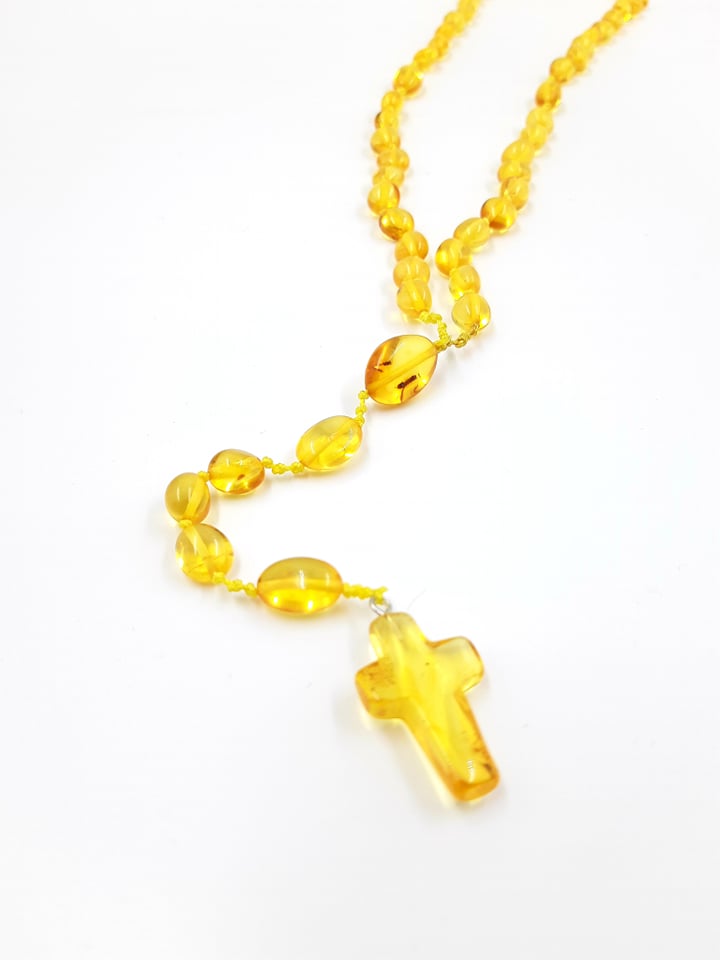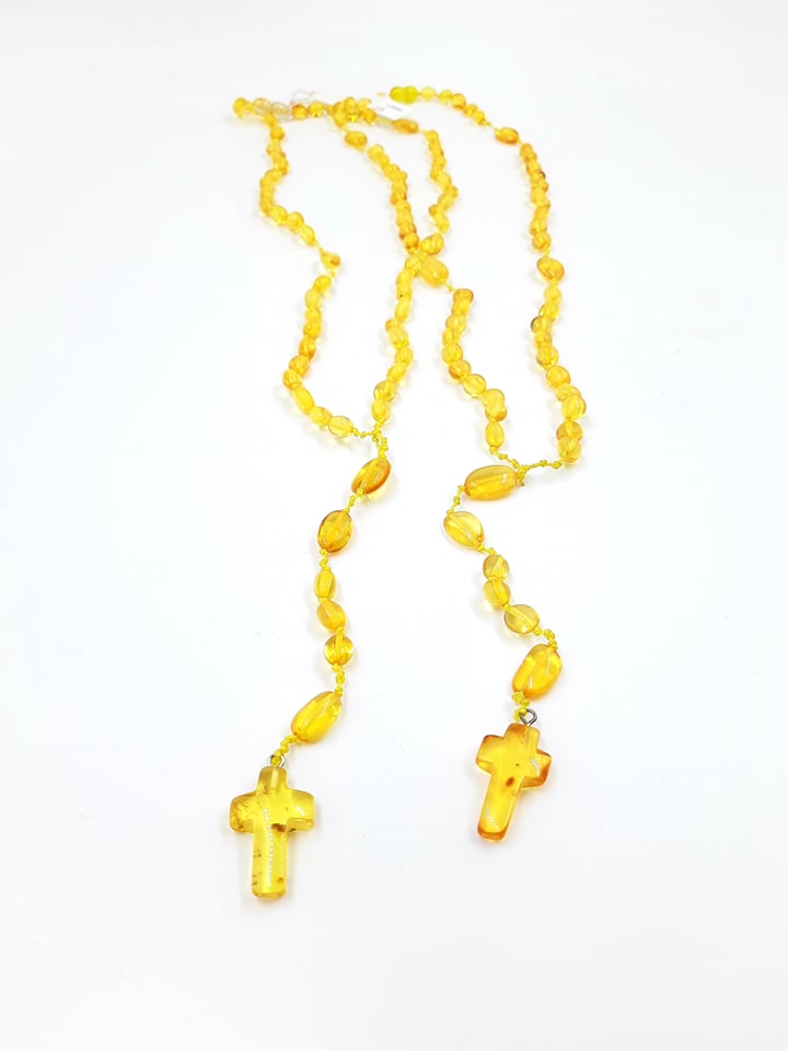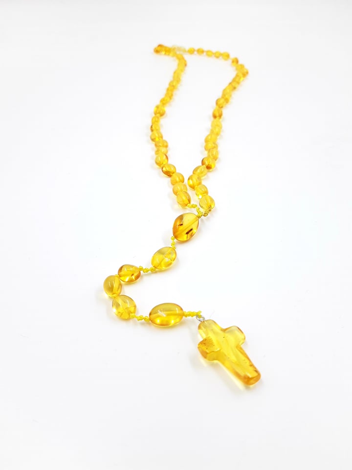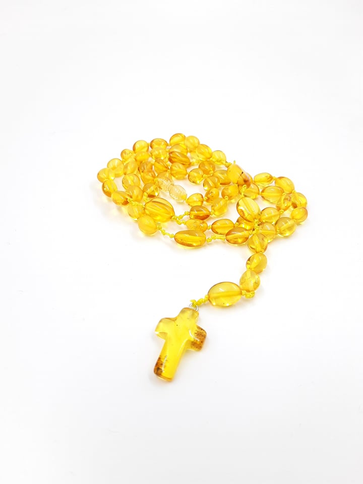 Rožinis šviesaus medaus spalvos su gintariniu kryželiu. Netaisyklingos formos skaidrūs burbuliukai. Gale su užsuktuku.