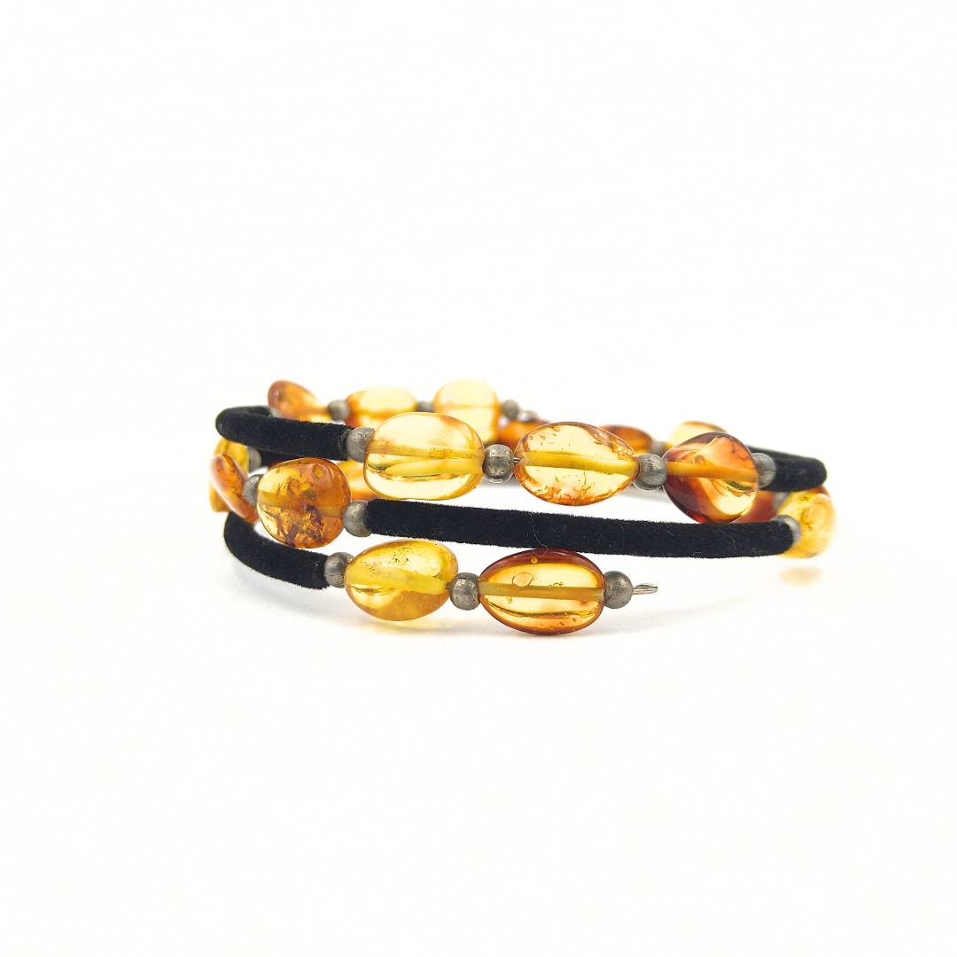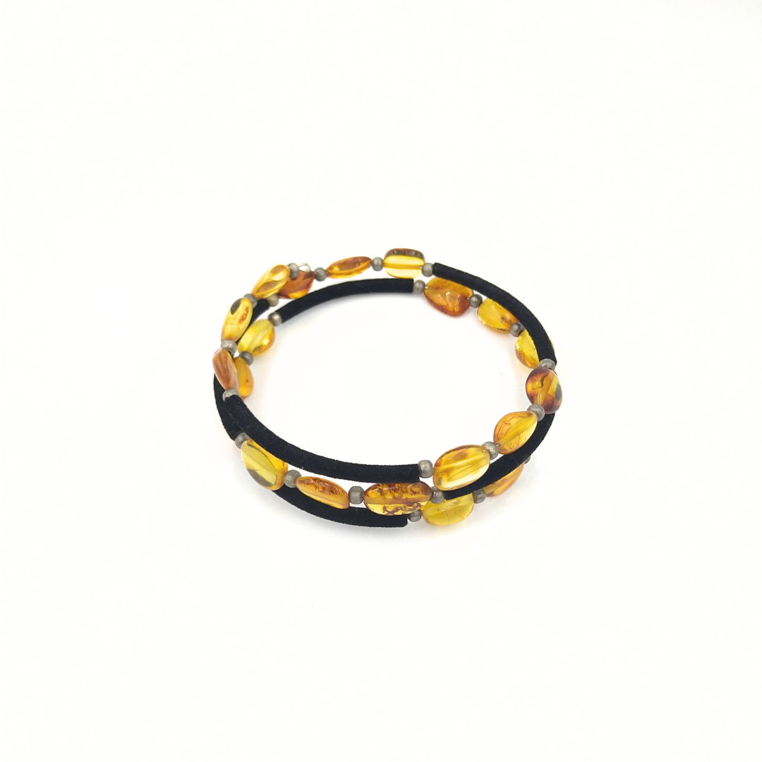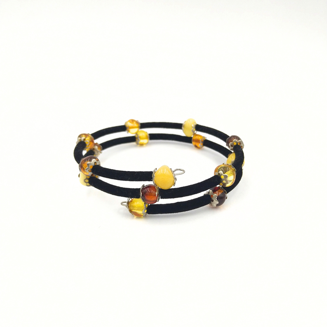 Savaime susisukanti apyrankė. Juodo veliūro intarpai su įvairaus dydžio ir spalvos plokščiais gintaro karoliukais. Puikiai tiks ir didesniam riešui.