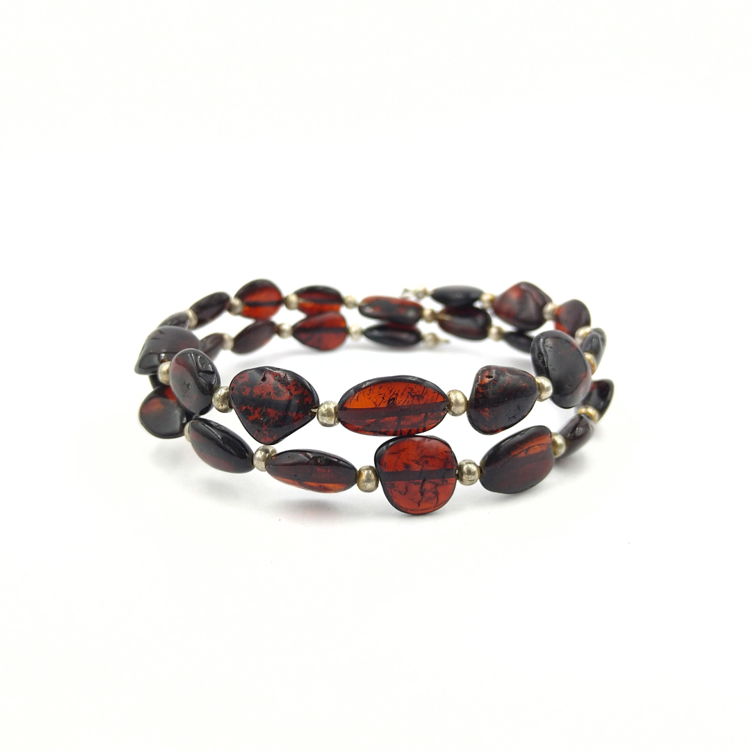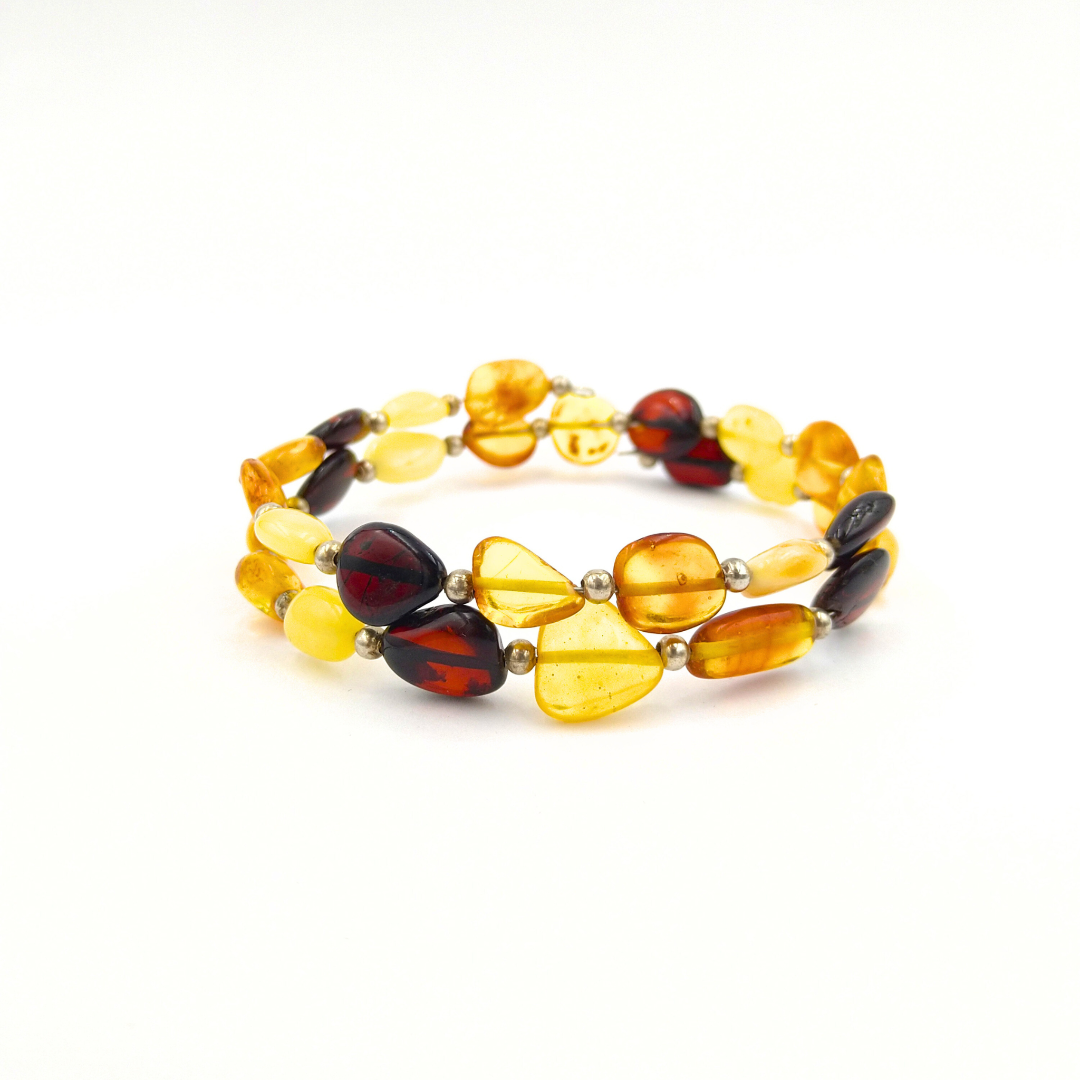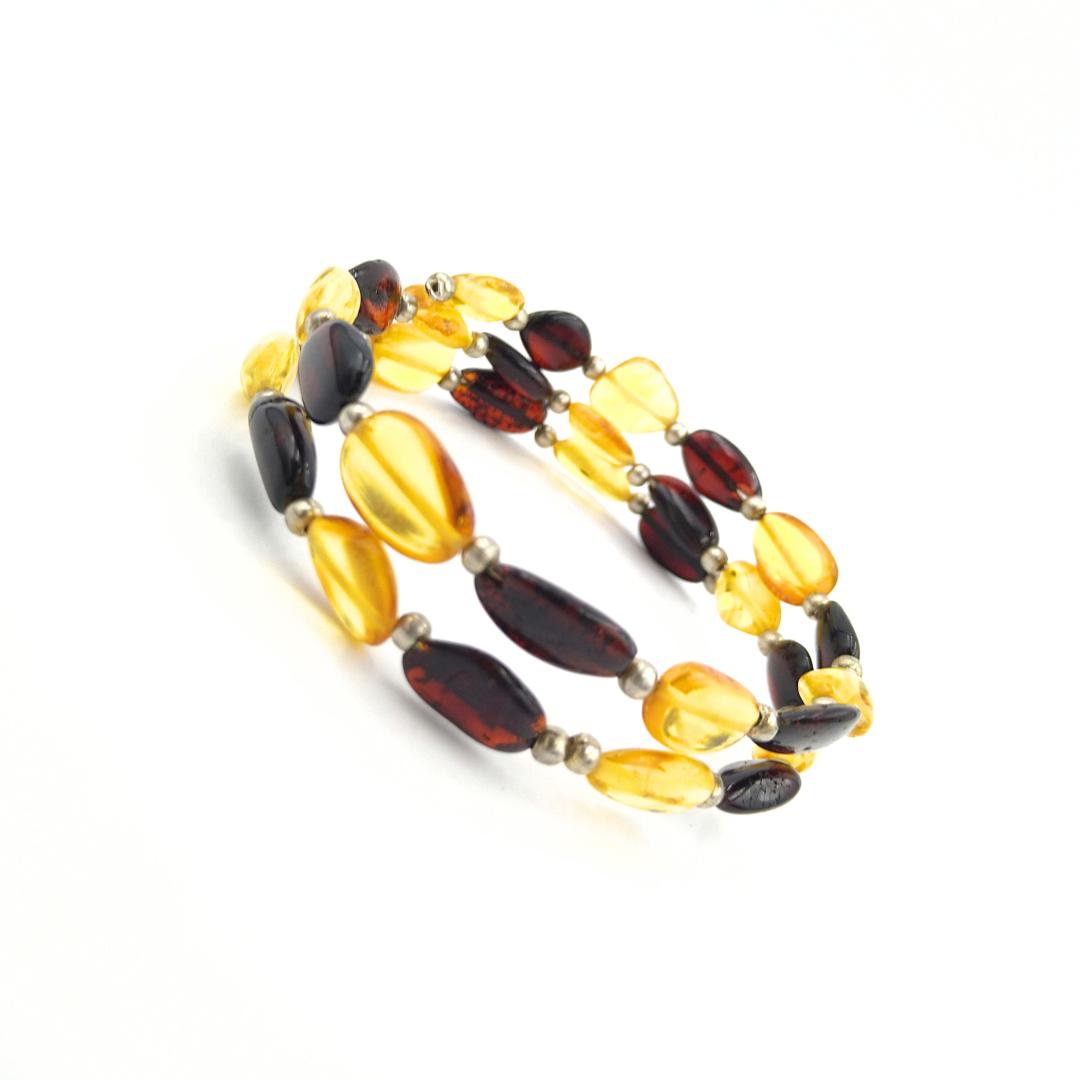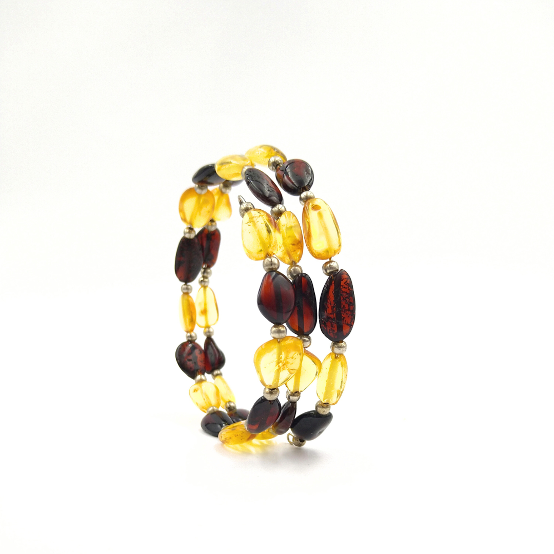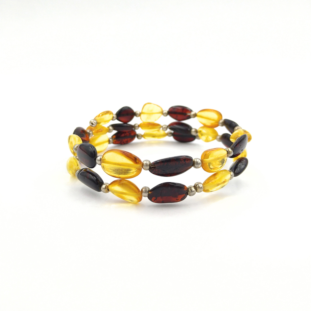 Savaime susisukanti apyrankė. Suverta iš įvairaus dydžio, dviejų spalvų, plokščių gintaro karoliukų. Puikiai tiks ir didesniam riešui.
