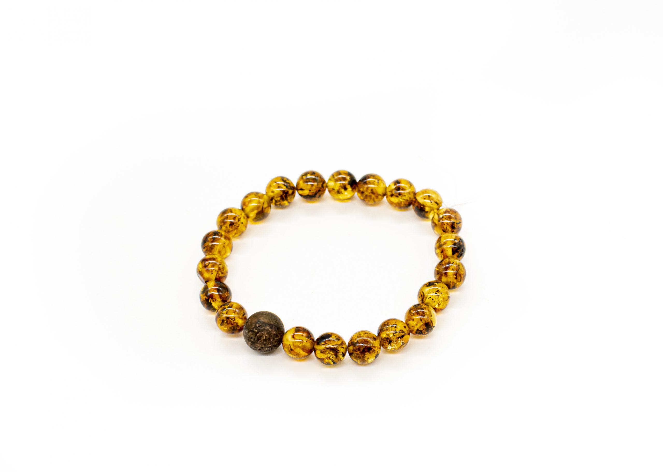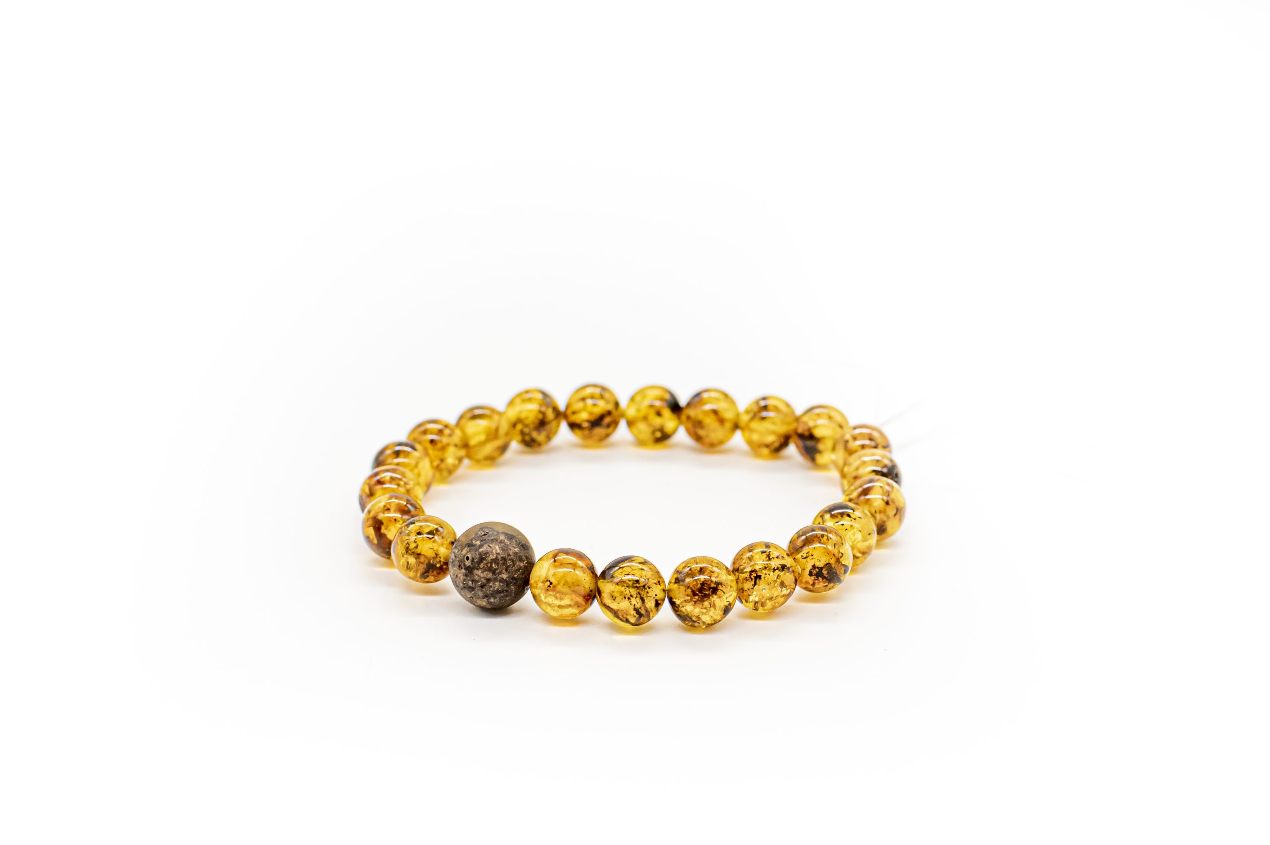 Smulki žalio apvalaus gintaro apyrankė moteriai ar merginai su juodo nešlifuoto gintaro intarpu, suverta ant silikoninės gumytės.