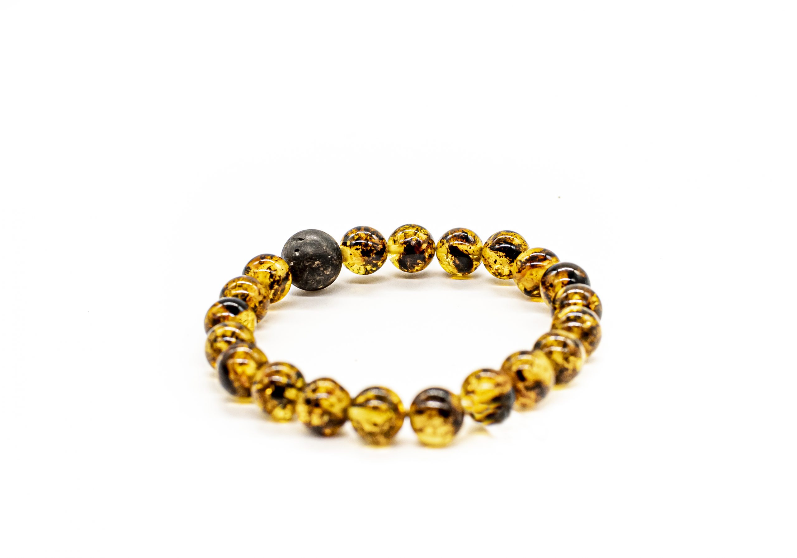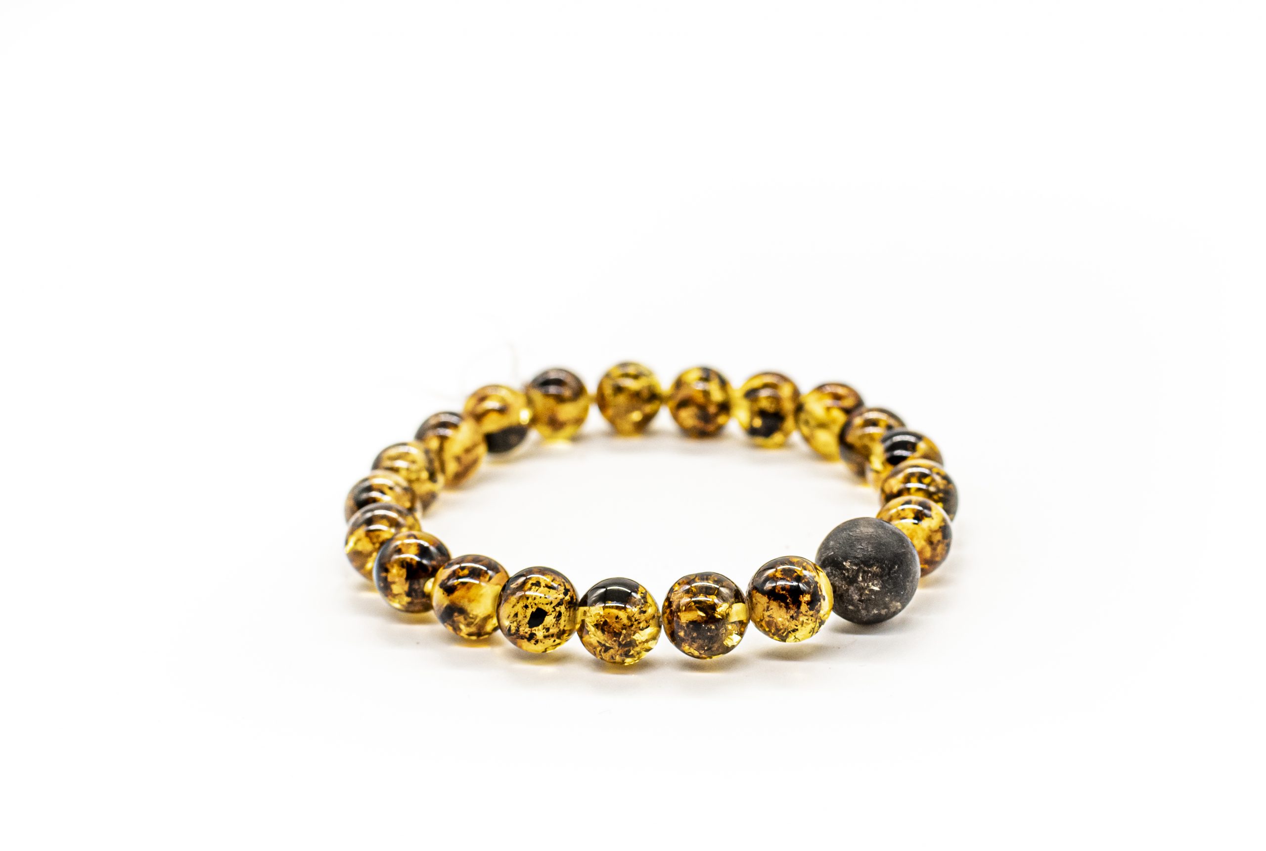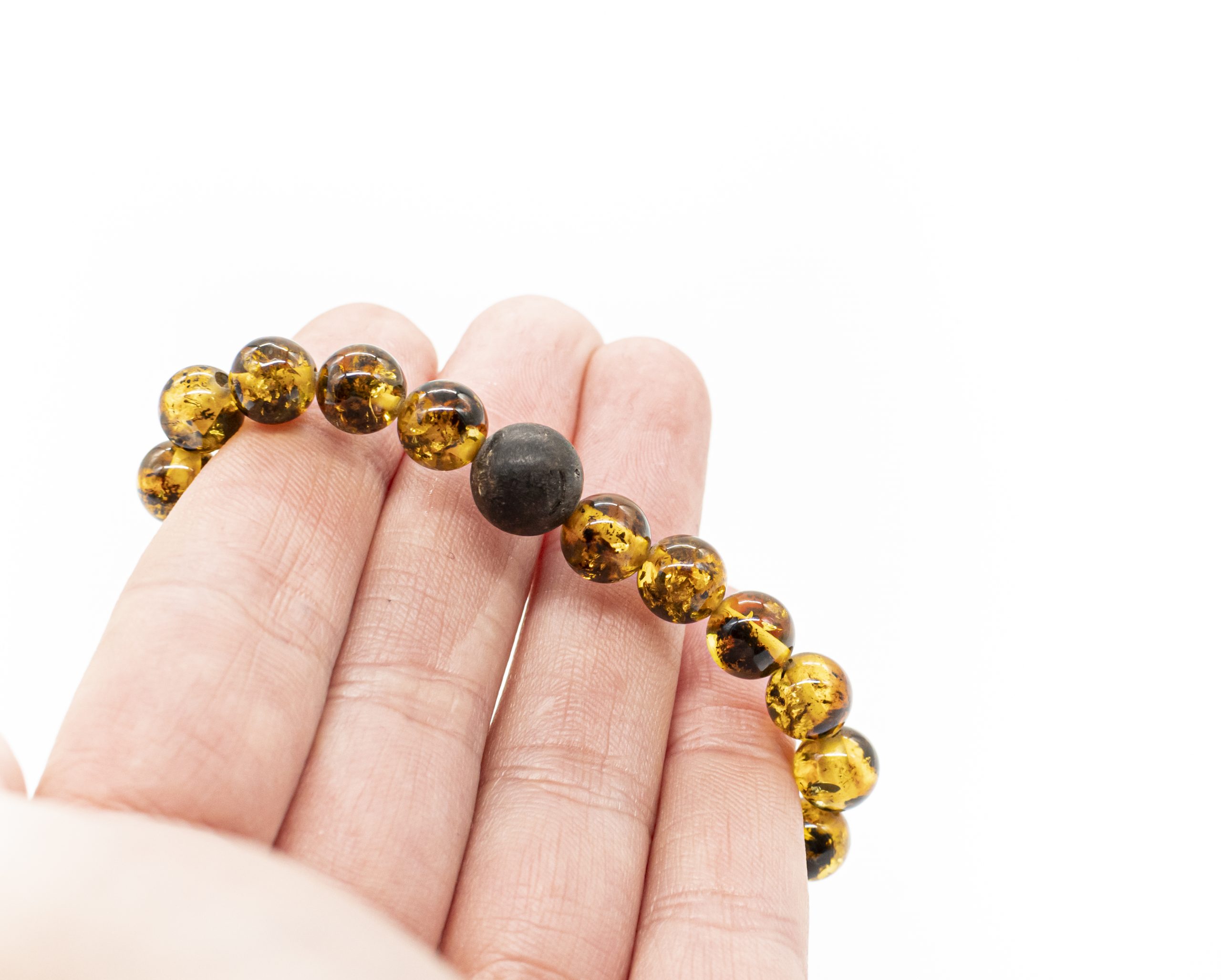 Smulki apvalių burbulų apyrankė iš žalio ir juodo nešlifuoto gintaro.