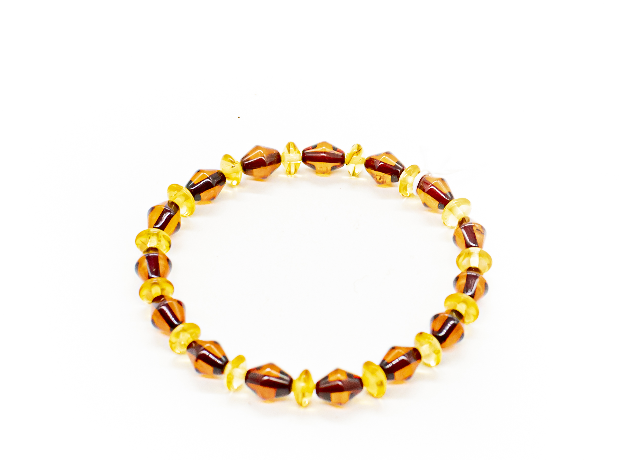 Smulki moteriška apyrankė iš tamsaus bei šviesaus gintaro detalių. Apyrankė suverta ant silikoninės gumytės.