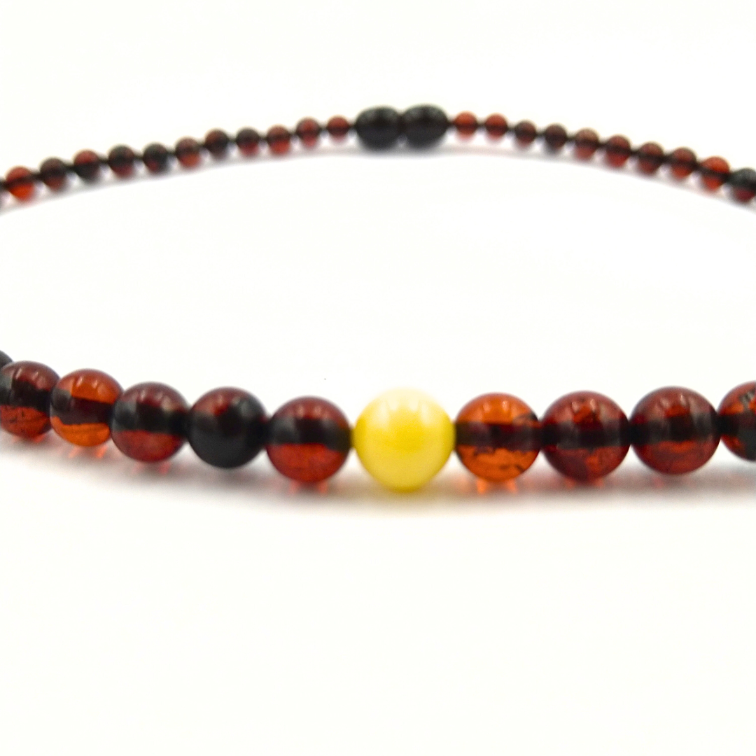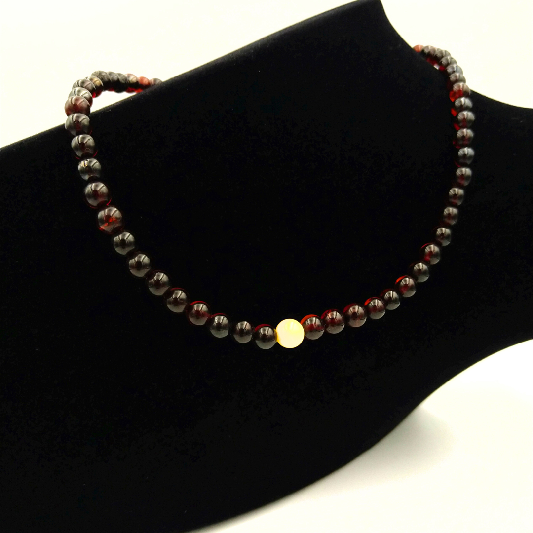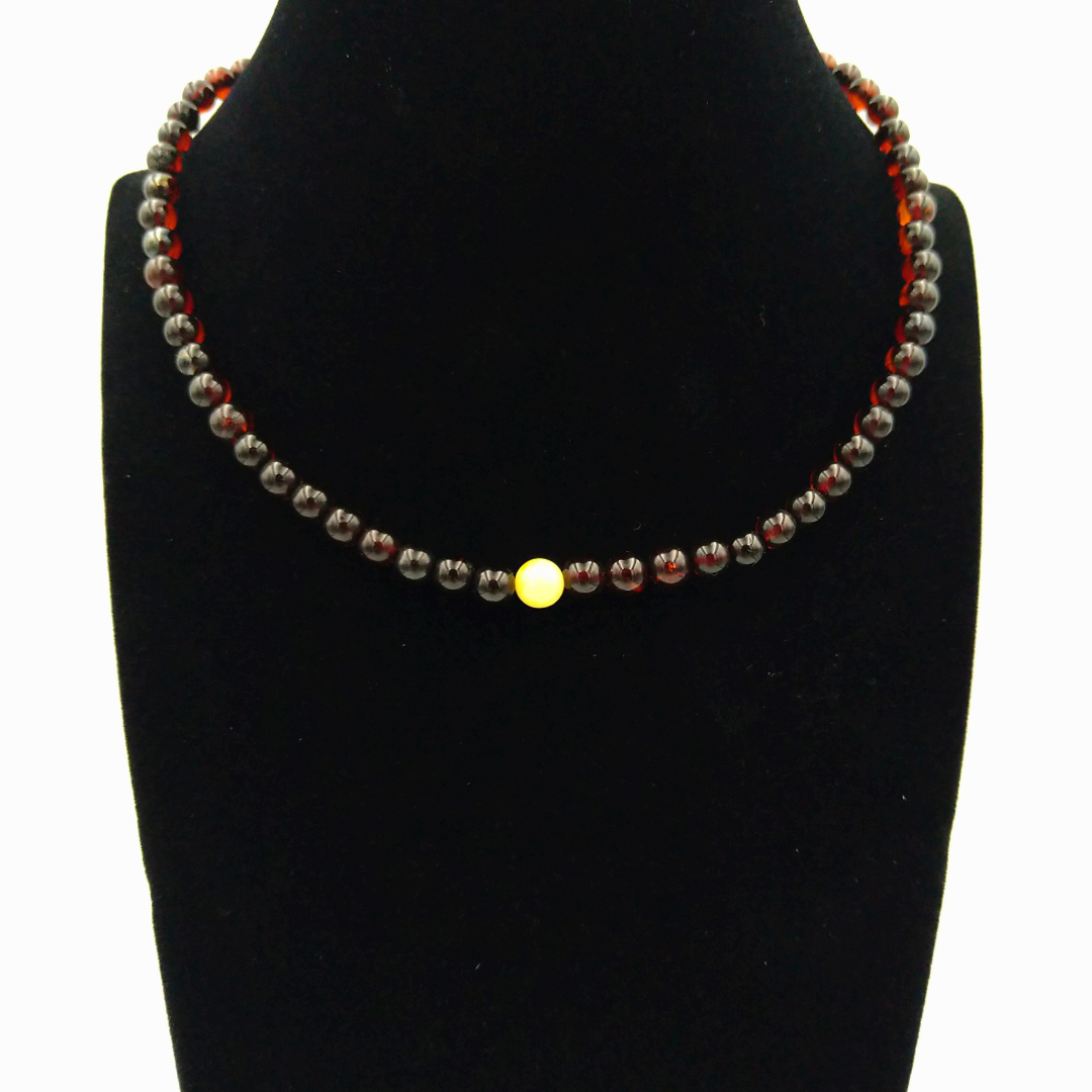 Granato spalvos smulkių gintaro karoliukų vėrinys. Centre puoštas geltonu matiniu gintaru. Puikiai tiks paaugliams.