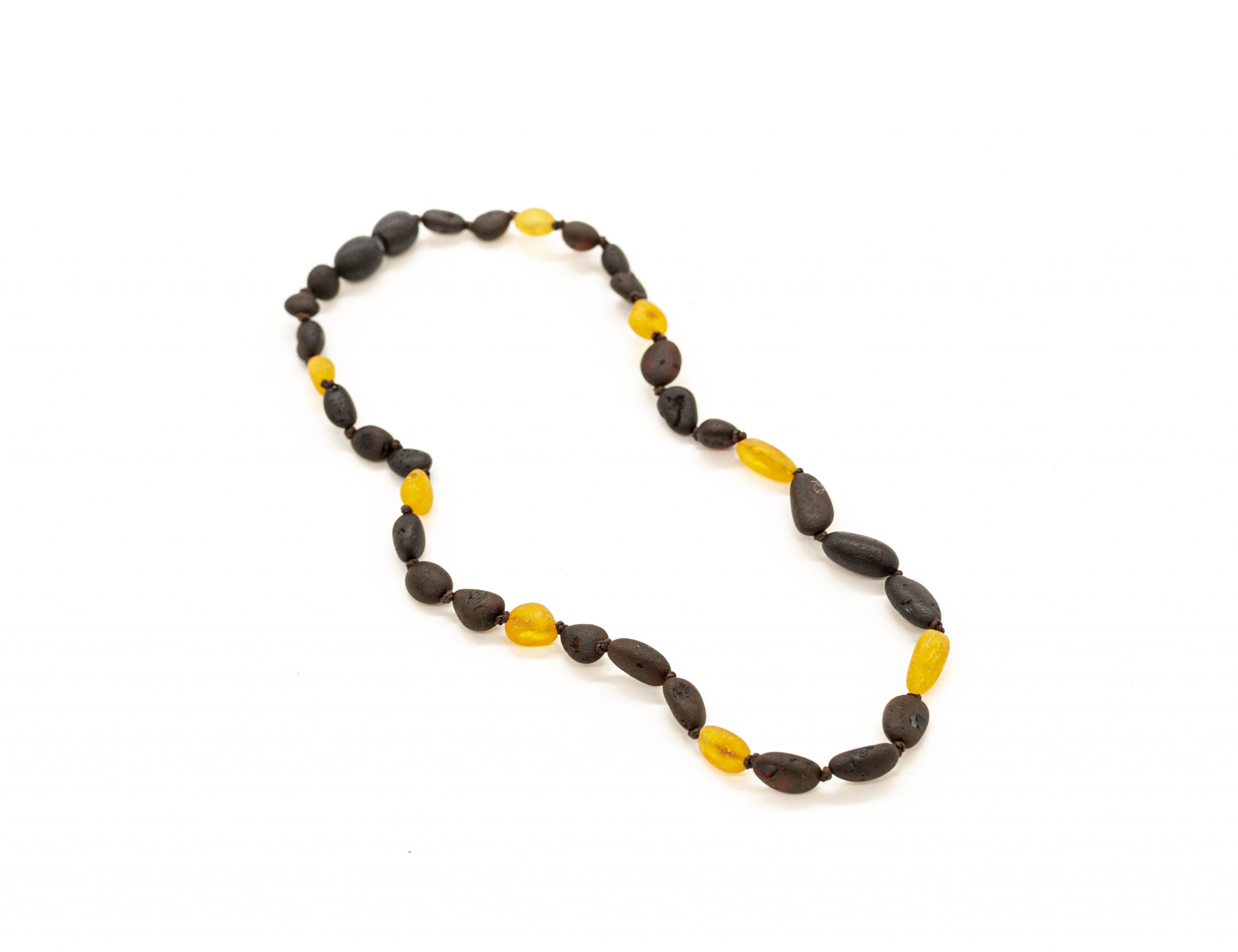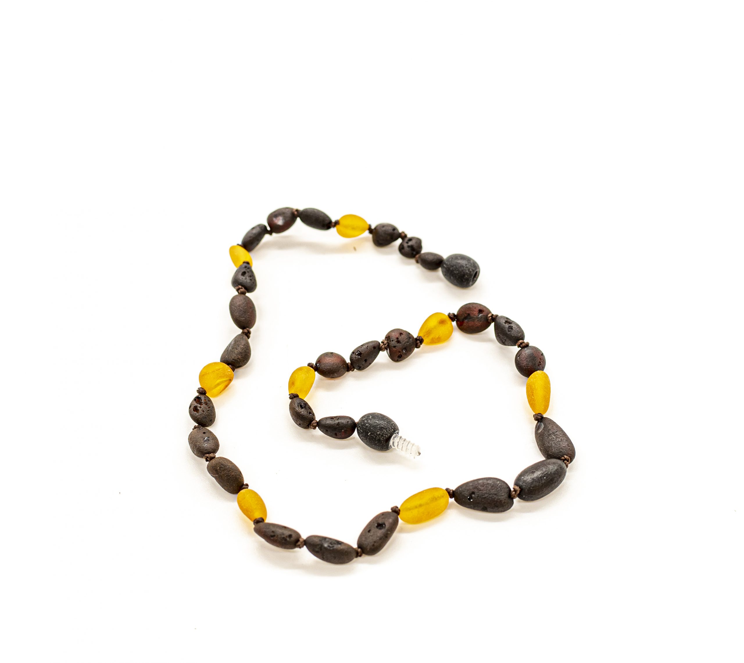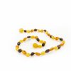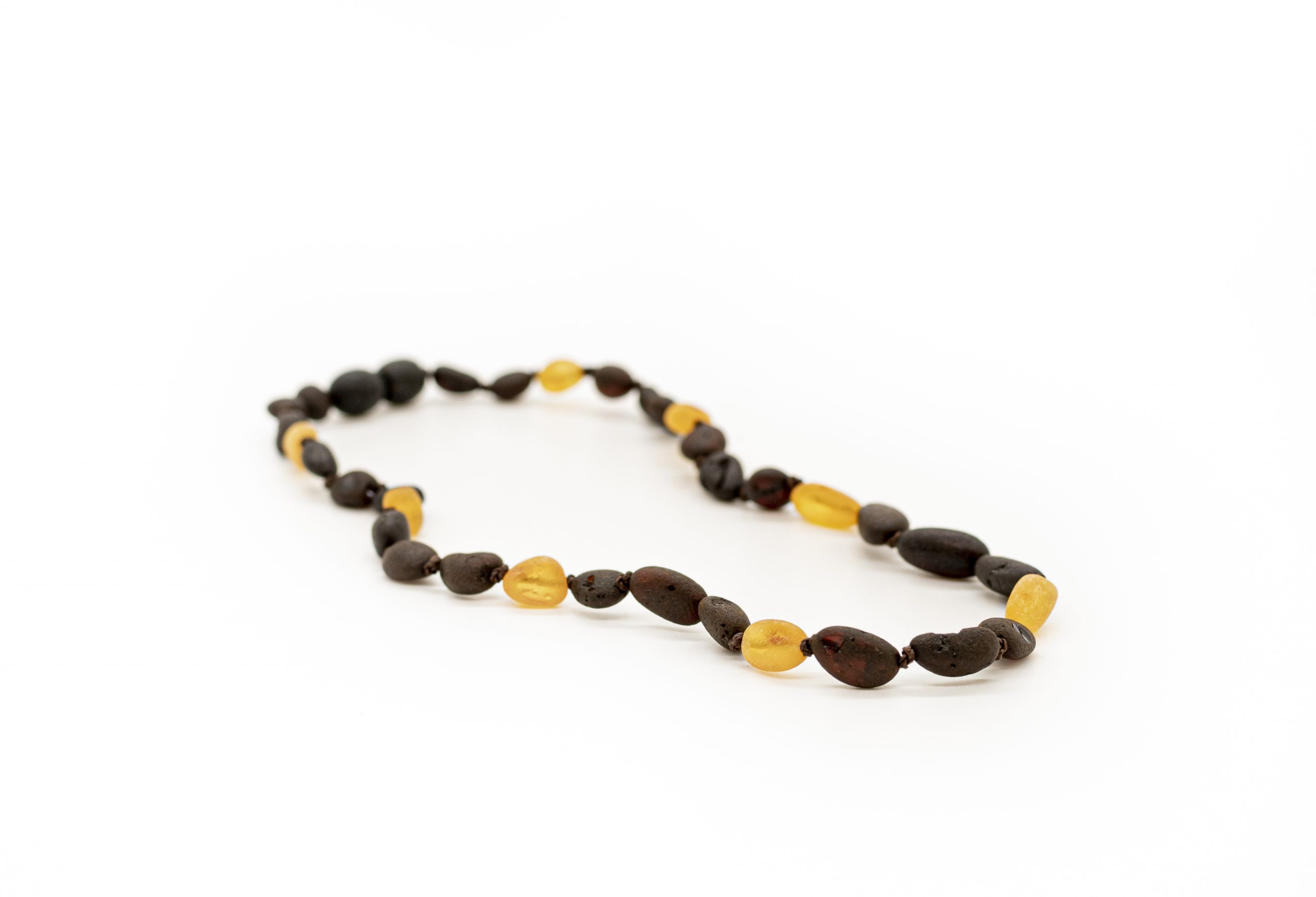 Smulkūs, dailūs karoliukai kūdikiams ir vaikams. Natūralus Baltijos gintaras, užsukamas plastikinis užsegimas. Slyvos formos nešlifuoto gintaro burbuliukai, tamsus ir medaus spalvos gintaras.