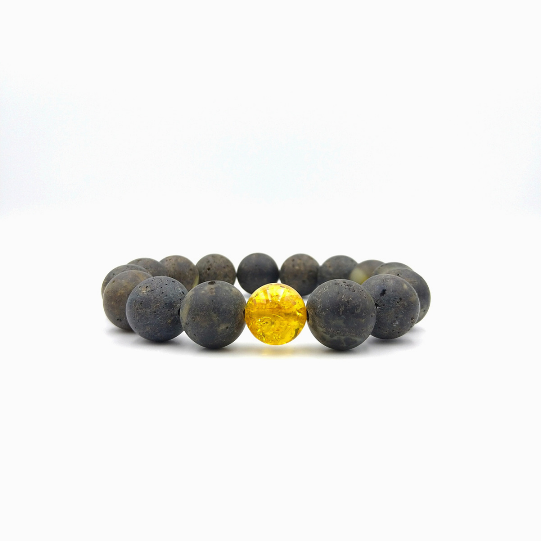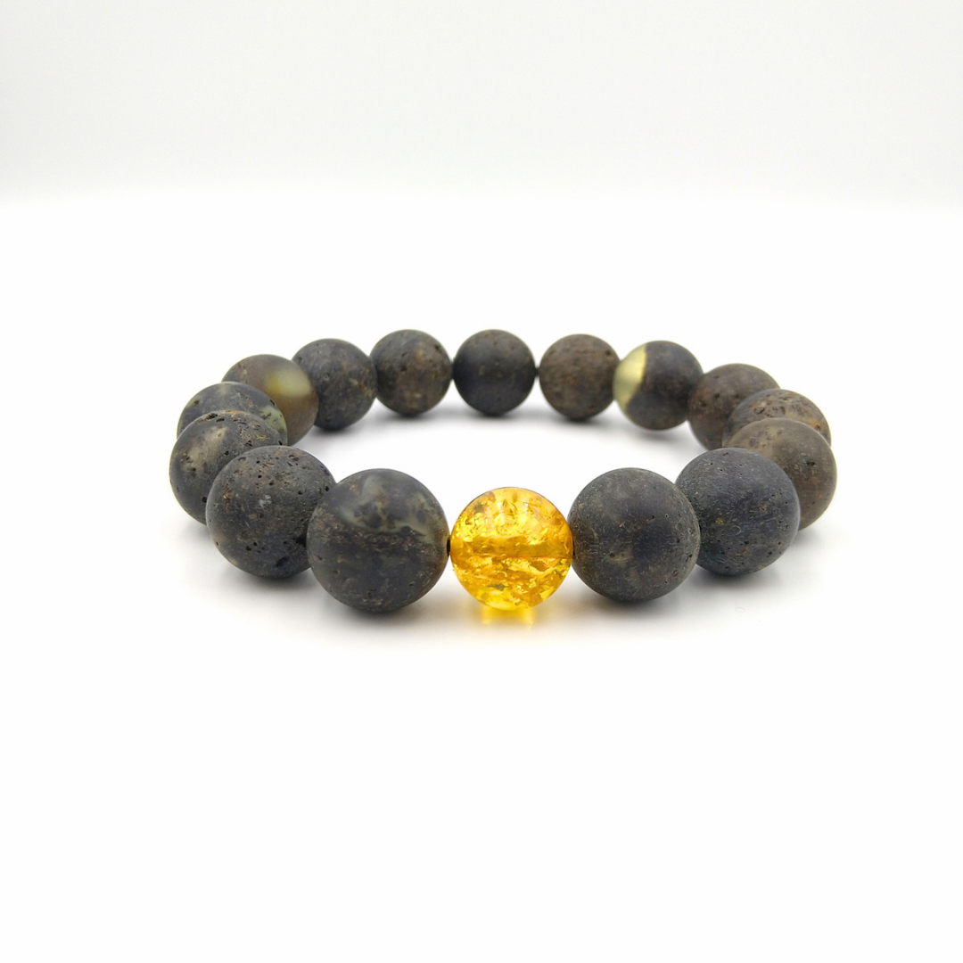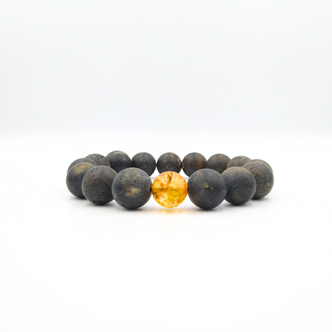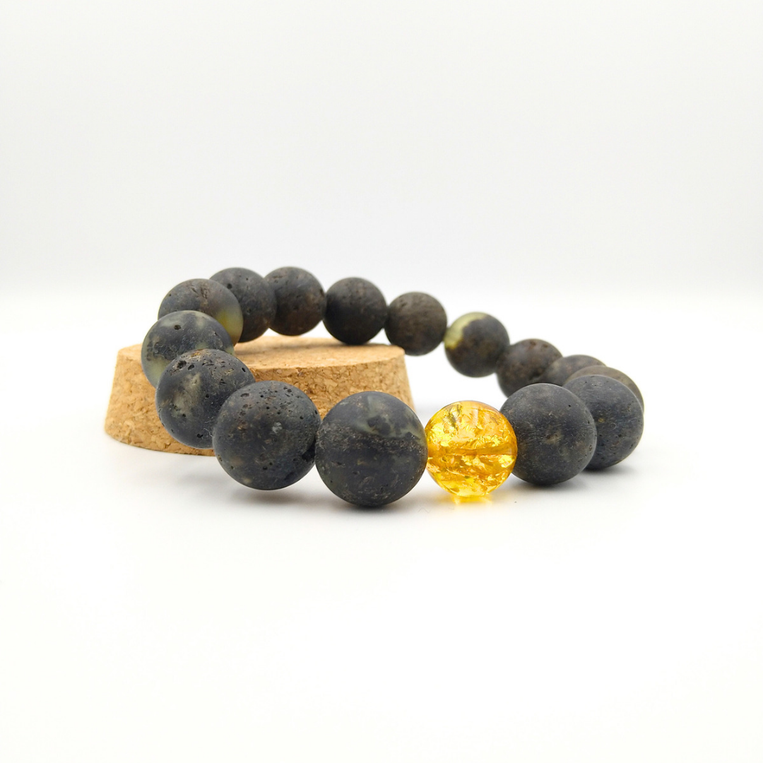 Stambi gintaro apyrankė. Suverta iš didesnių, matinės tekstūros gintaro burbuliukų, kurių tamsi spalva suteikia apyrankei solidumo ir išraiškingumo. Pagrindinis akcentas – vienas skaidrus, ryškiai geltonos spalvos gintaro intarpas, kuris išryškėja tarp matinių karoliukų ir suteikia apyrankei švytėjimo bei lengvumo. Apyrankė suverta ant elastingos gumytės, užtikrinančios patogų prigludimą prie riešo. Tai puikus pasirinkimas tiems, kurie vertina natūralias medžiagas ir unikalius akcentus.