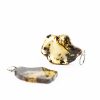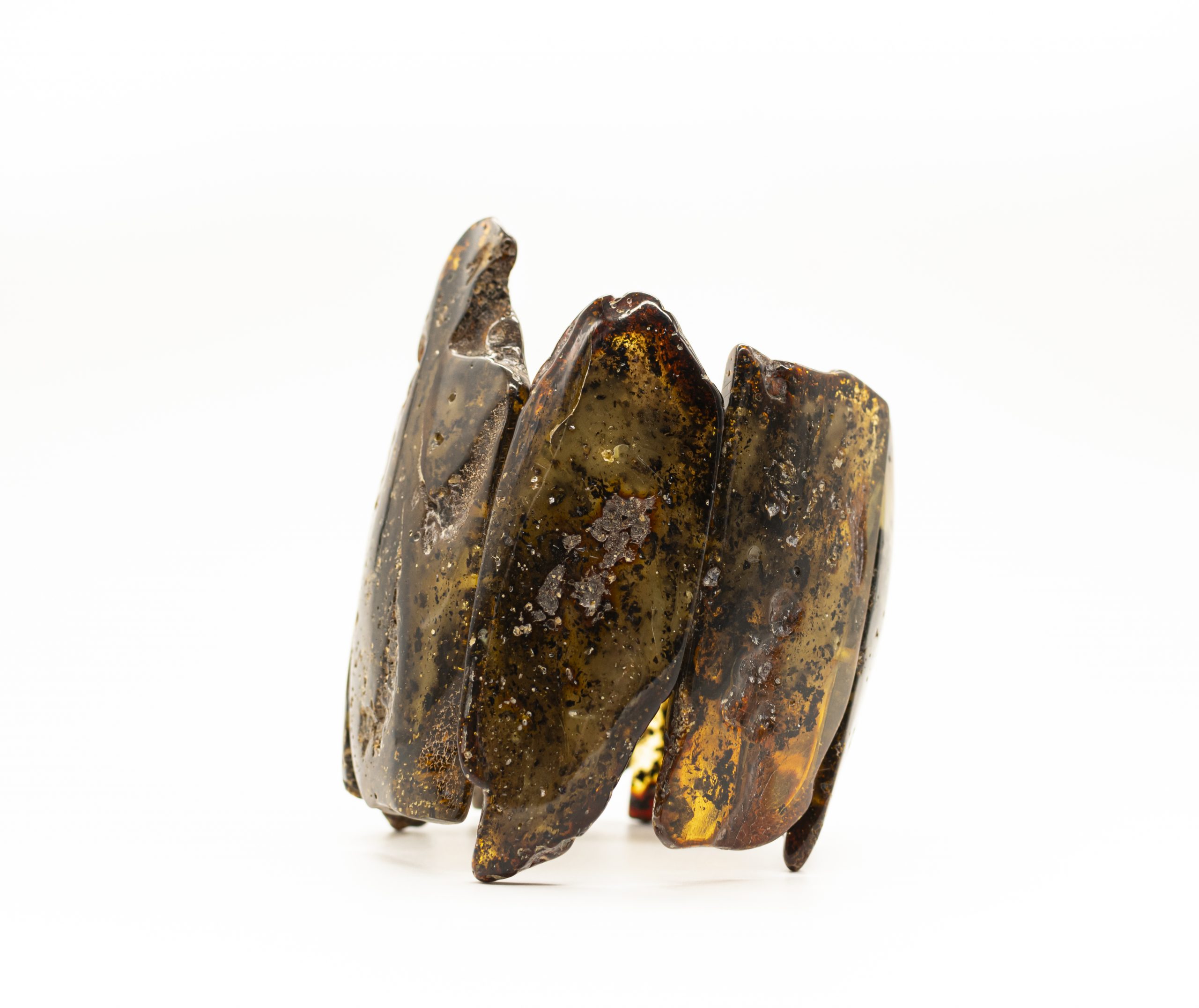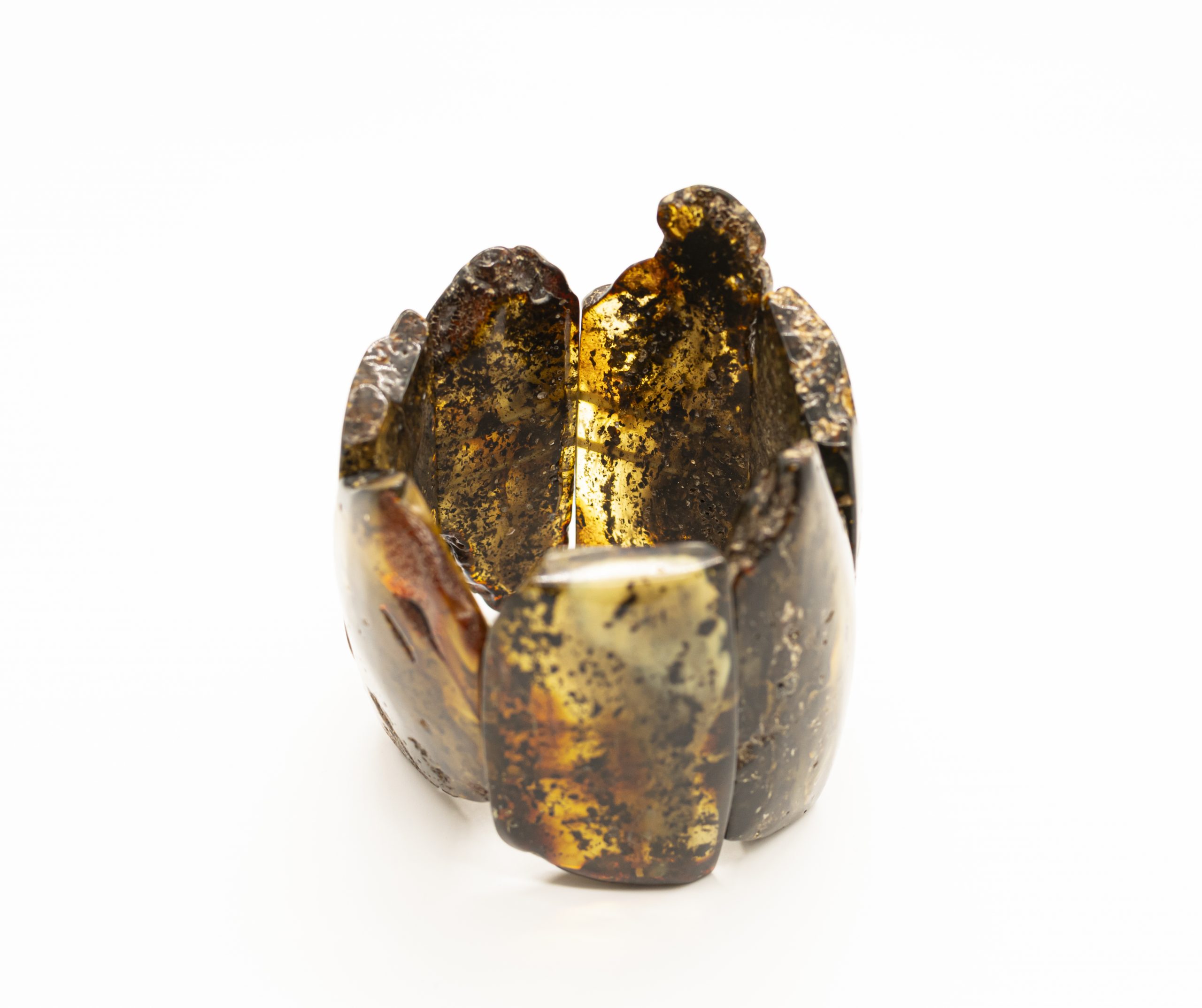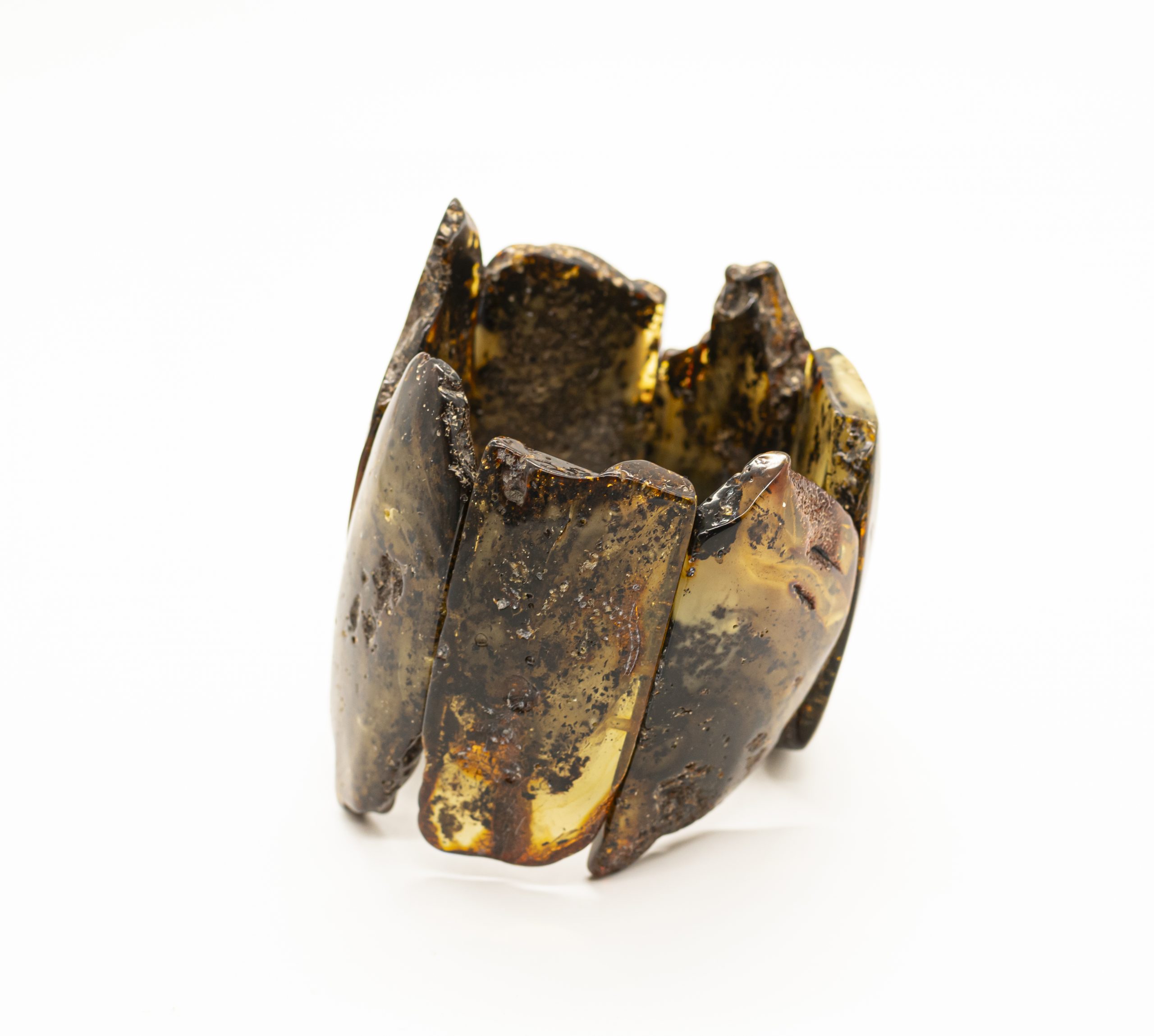 Stami margo gintaro apyrankė, suverta ant gumyčių. Gintaro plokštelės iš žalio, balto ir tamsaus gintaro.