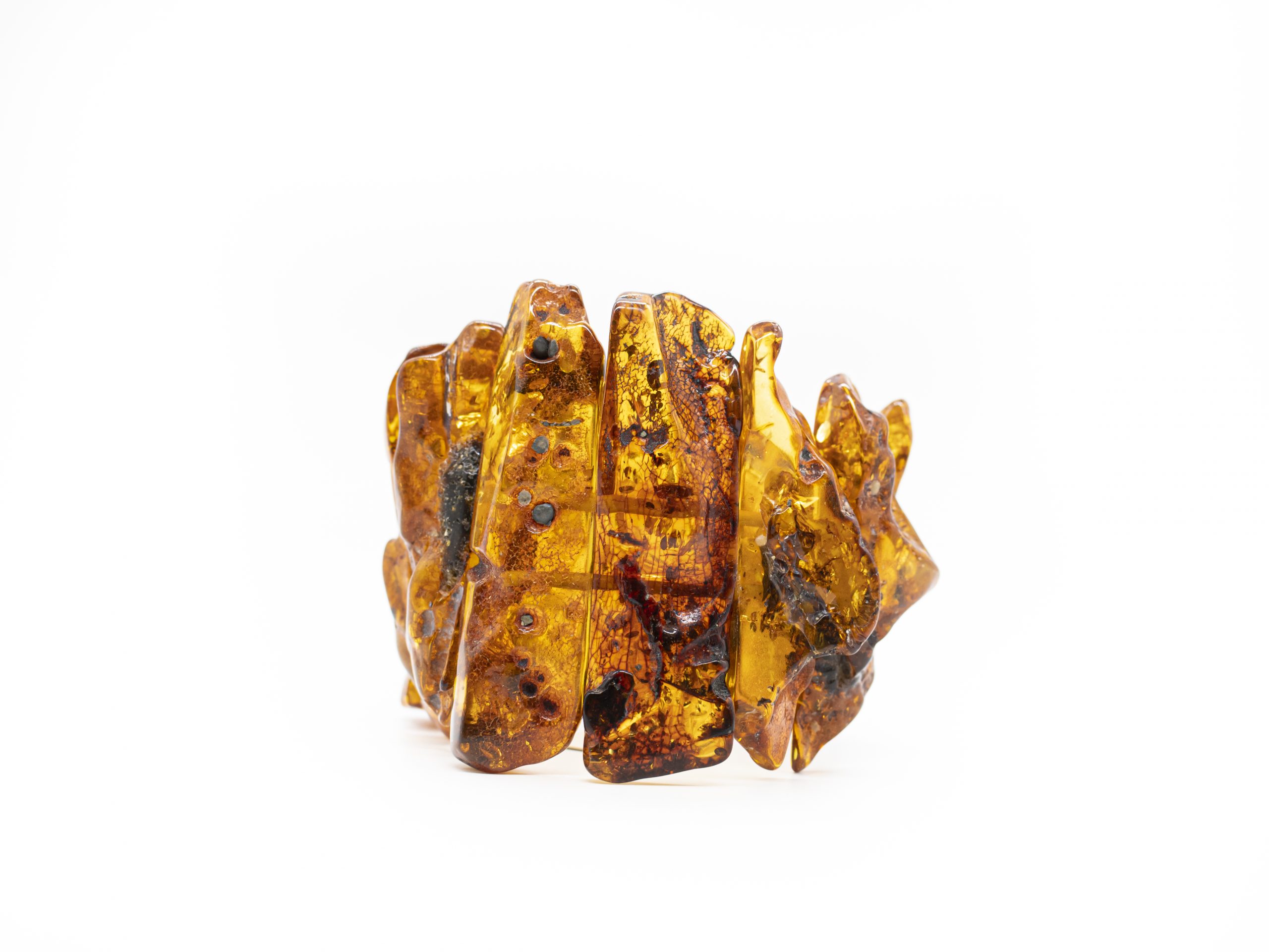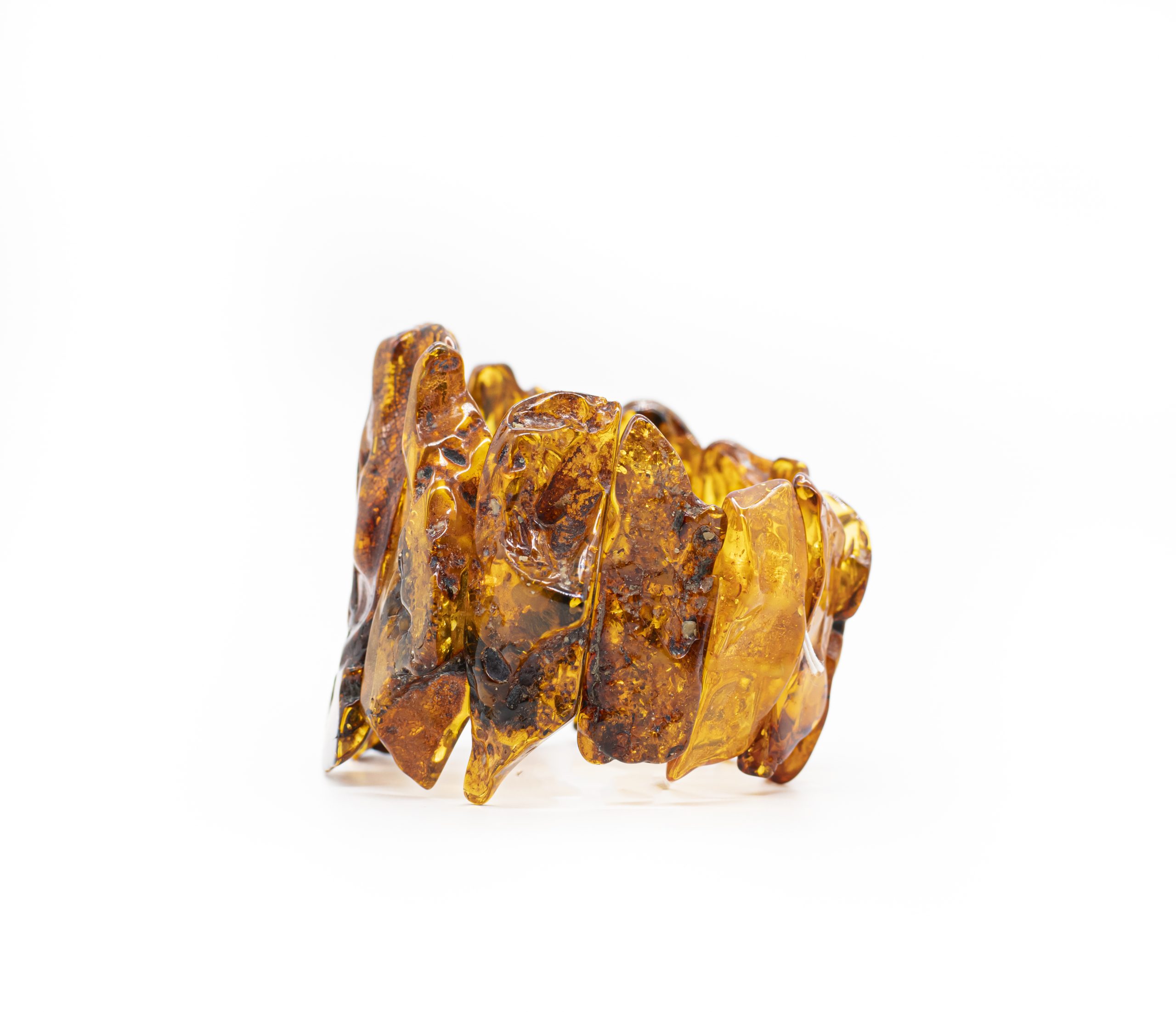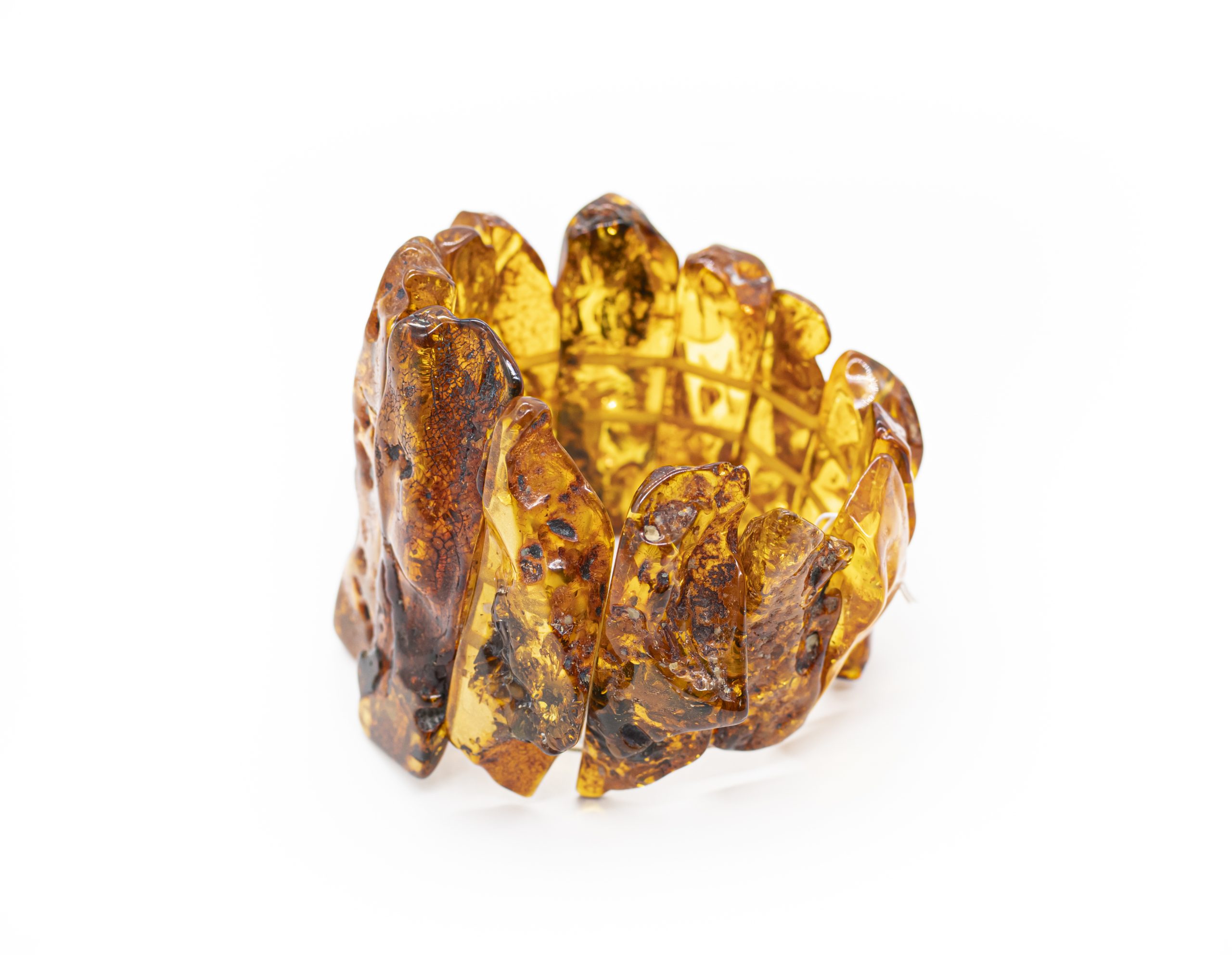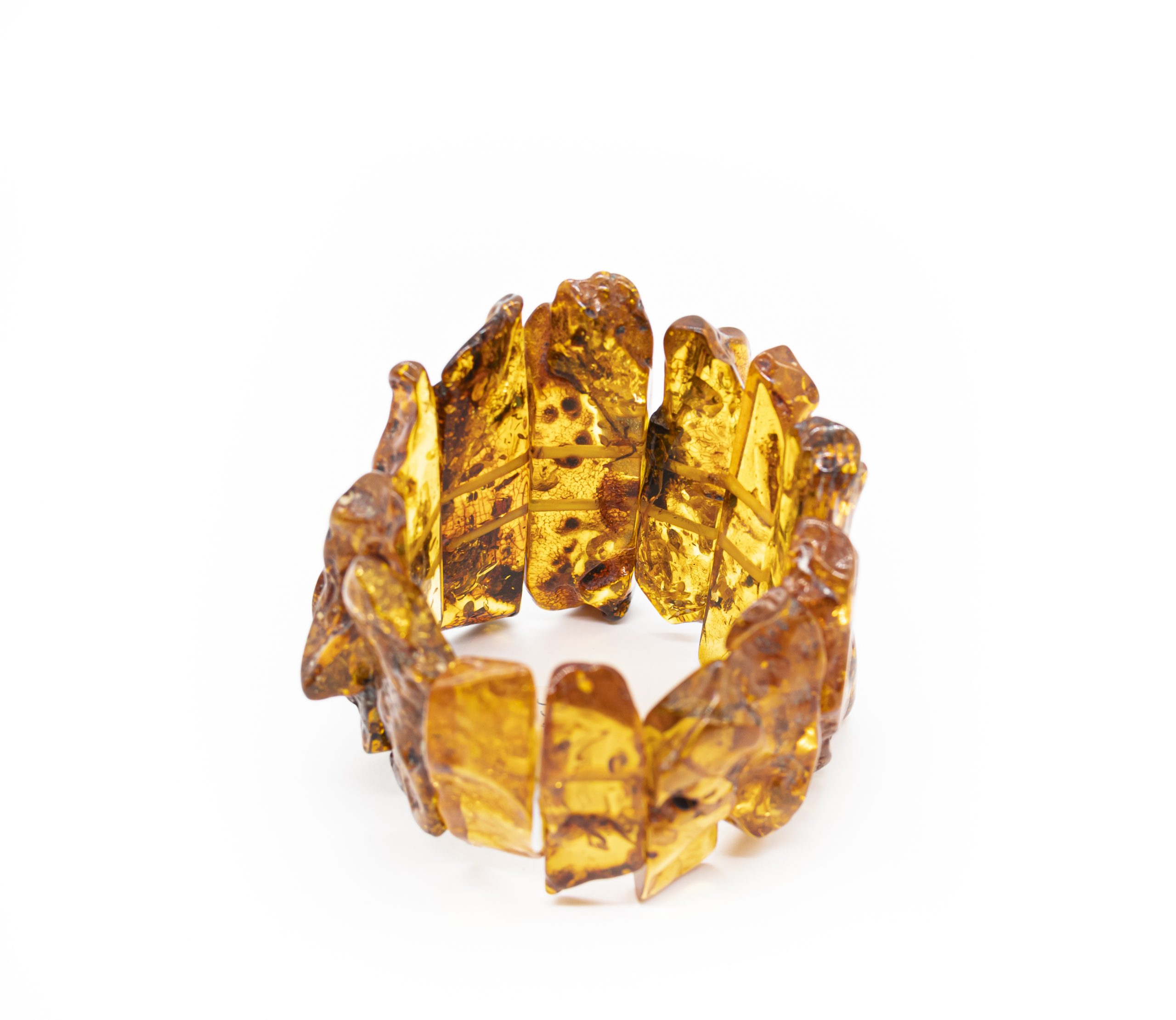 Stambi, elegantiška, itin lengva šviesaus gintaro apyrankė. Permatomos gintarinės plokštelės, išorinė pusė mažai šlifuota, paliktas natūrali gintaro tekstūra.