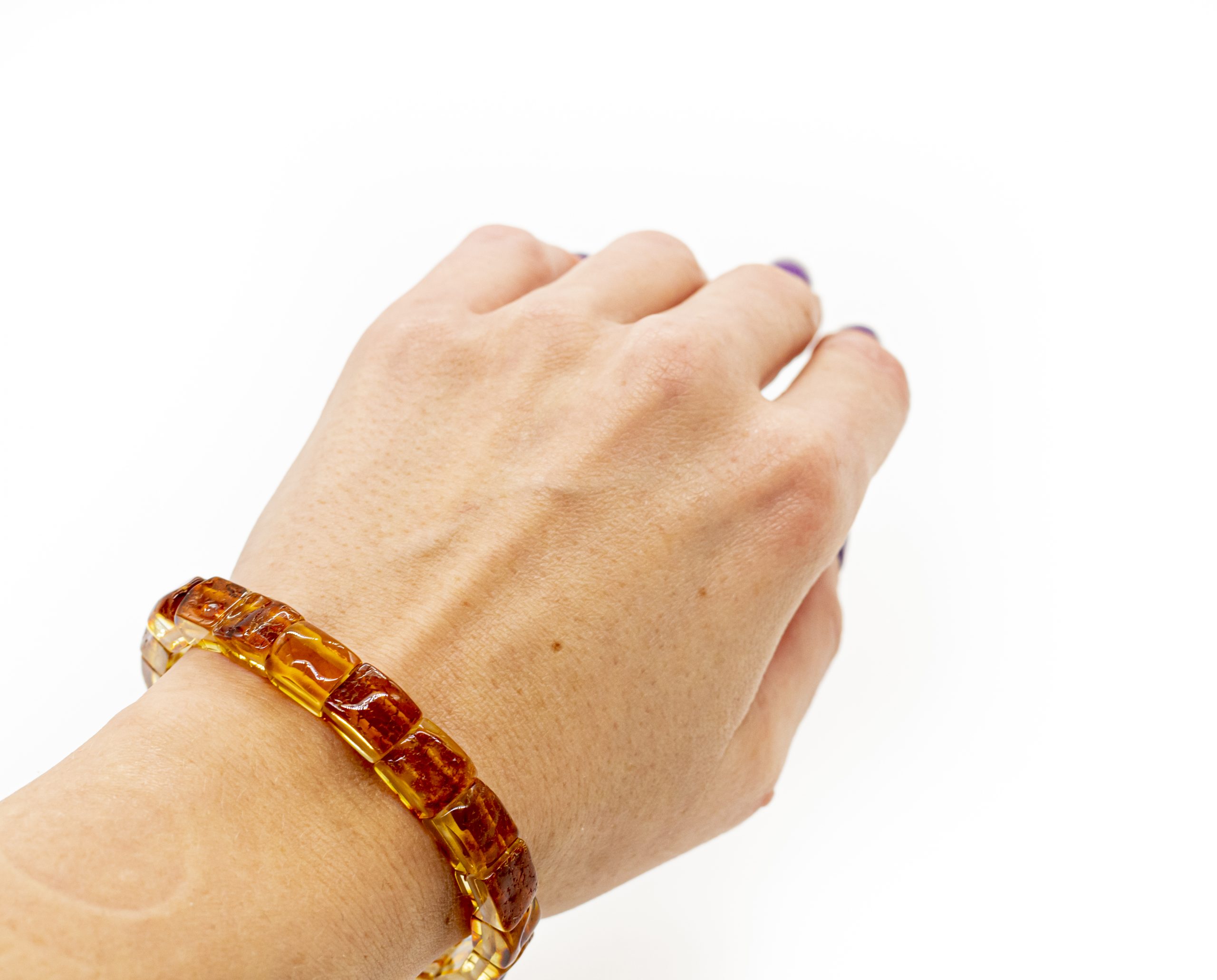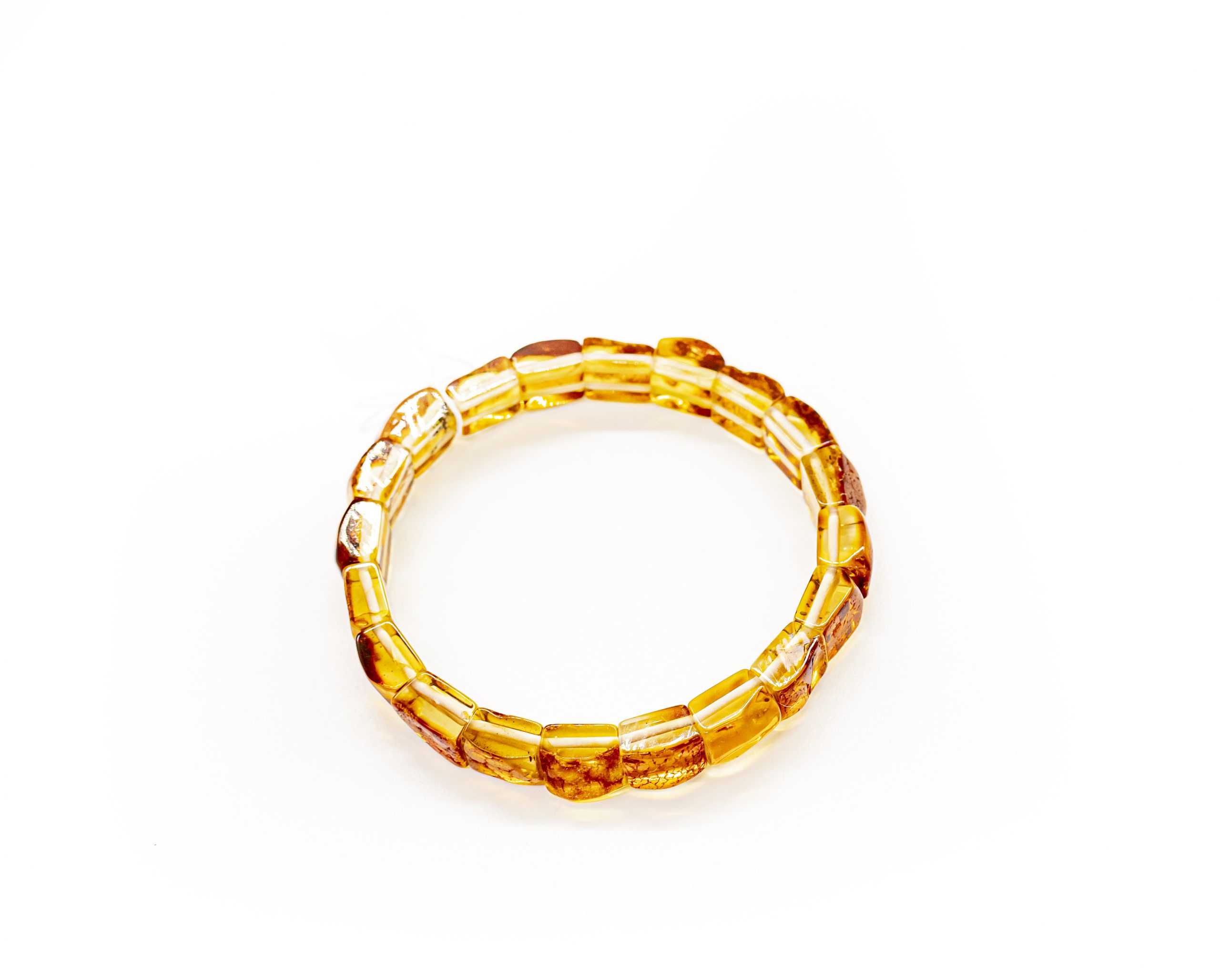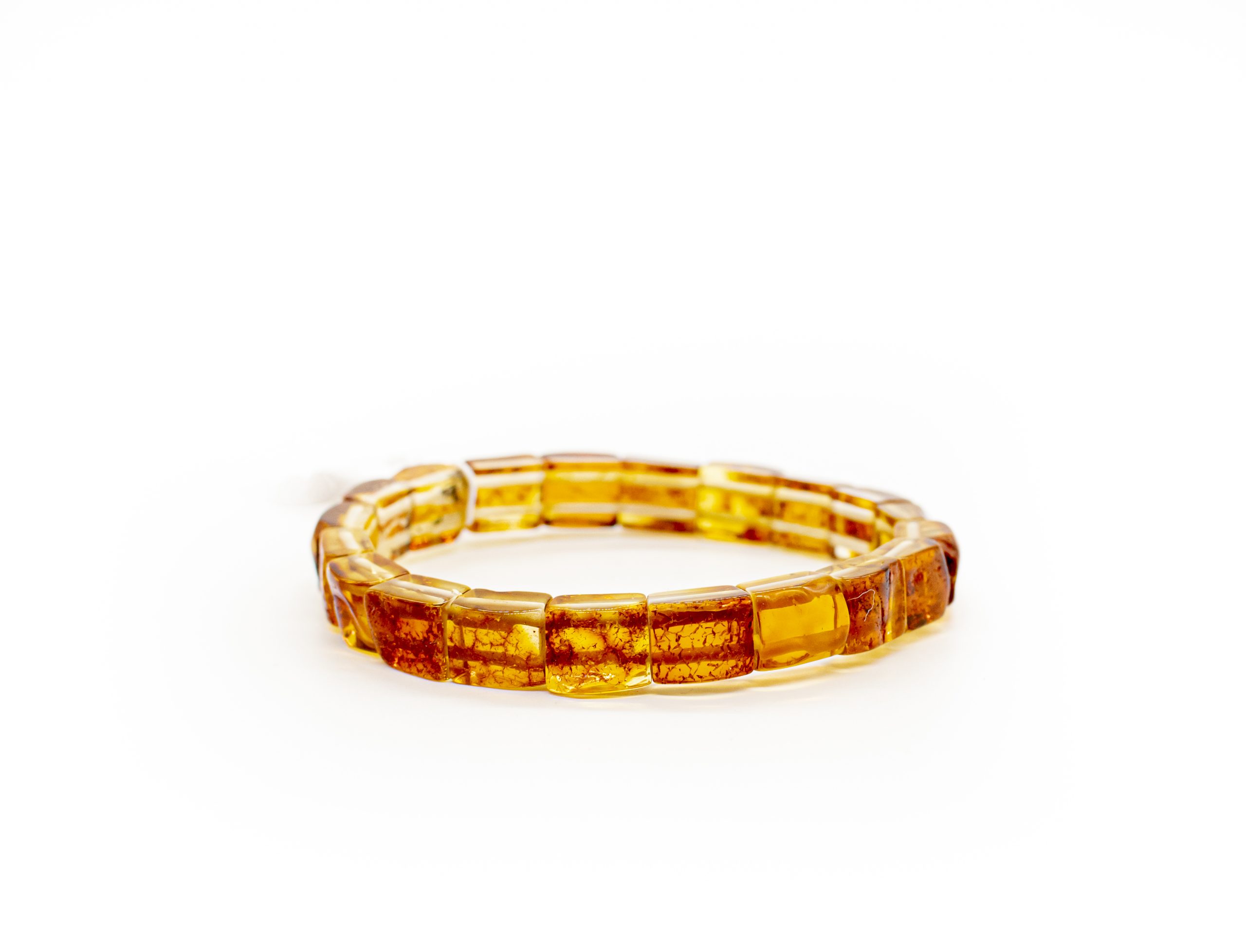 Šviesaus, tradicinės spalvos gintaro apyrankė ant gumytės. Stačiakampių detalių viršus mažai šlifuotas, palikta originali gintaro tekstūra.