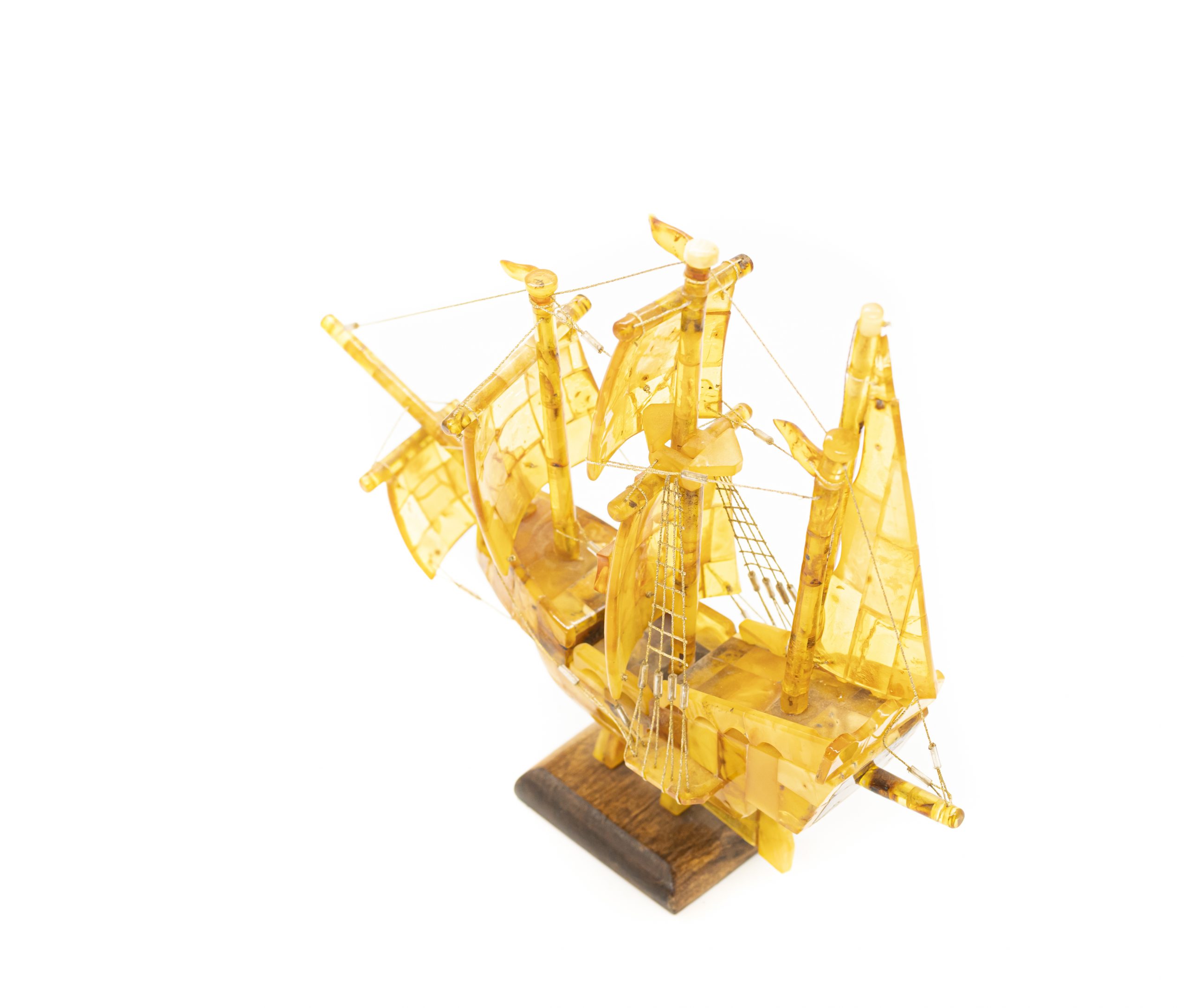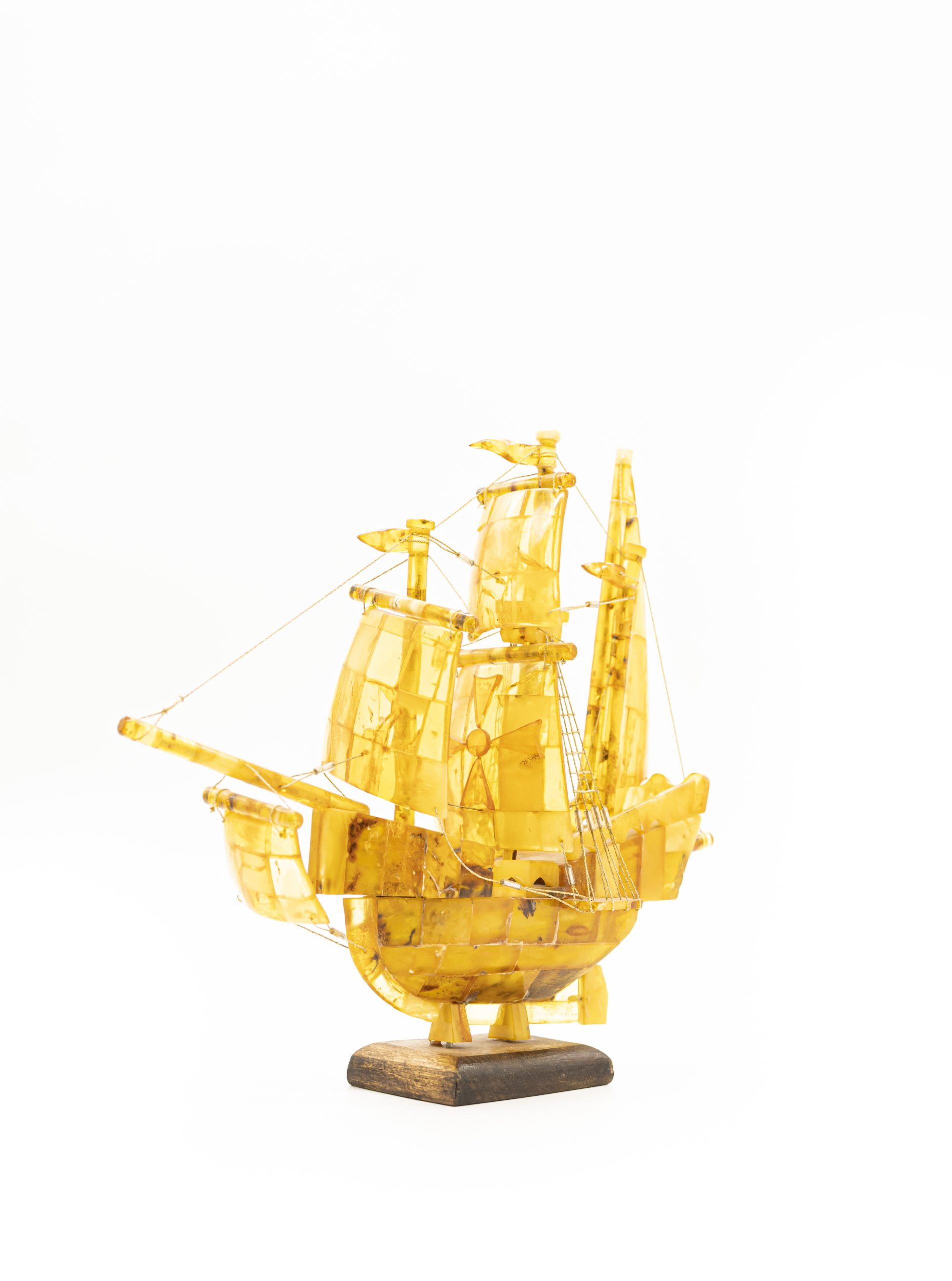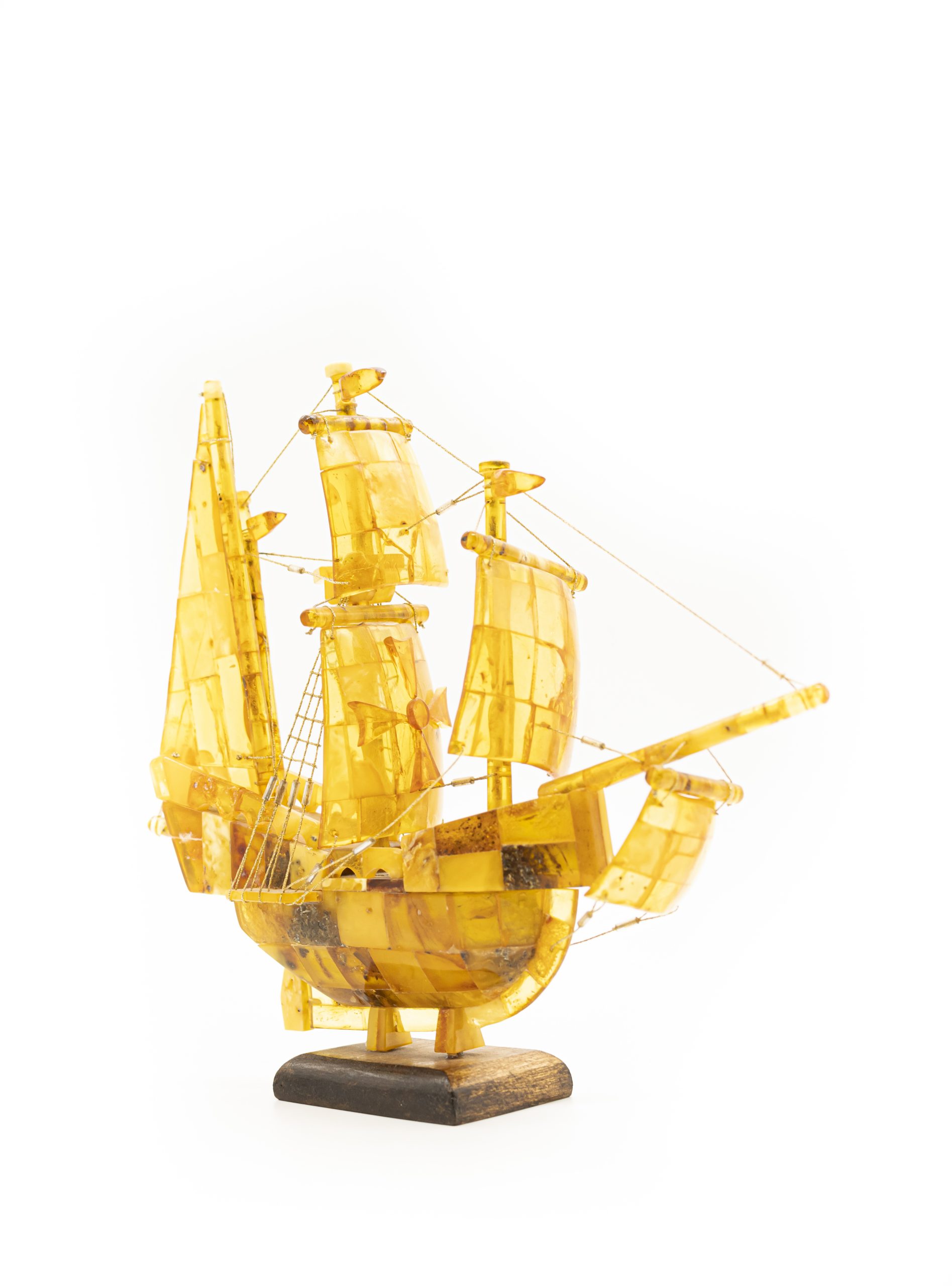 Rankų darbo autorinis šviesaus gintaro laivas ant medinio pagrindo. Ant vidurinės burės pavaizduotas Maltos ordino kryžius.