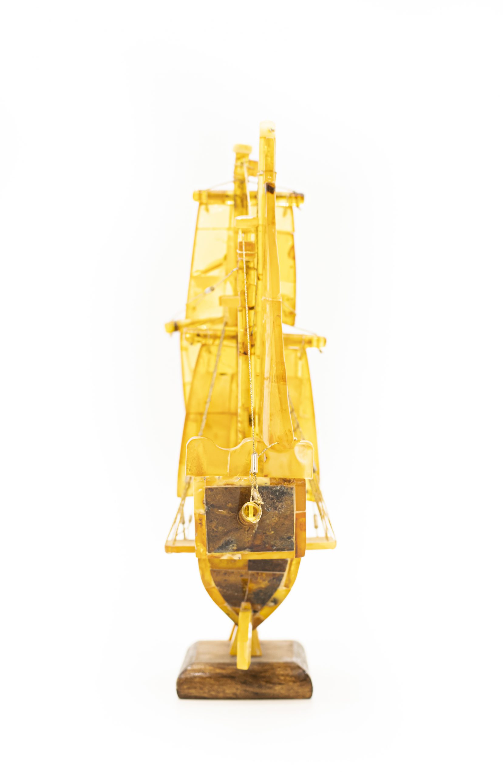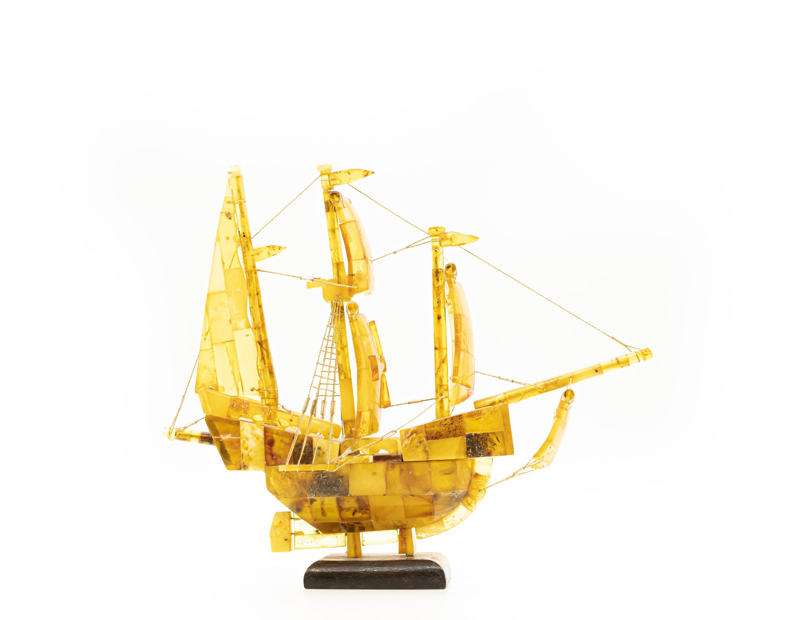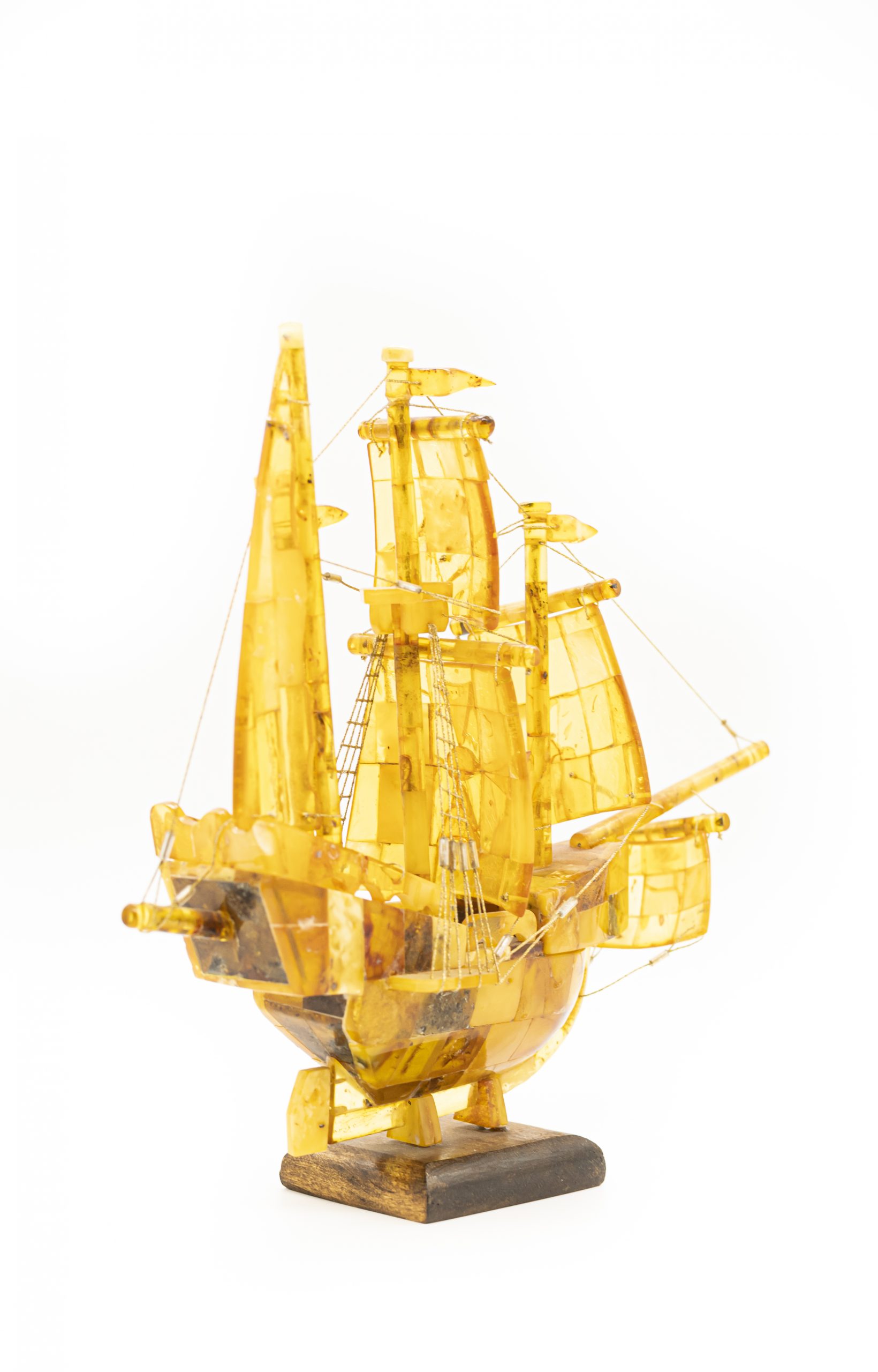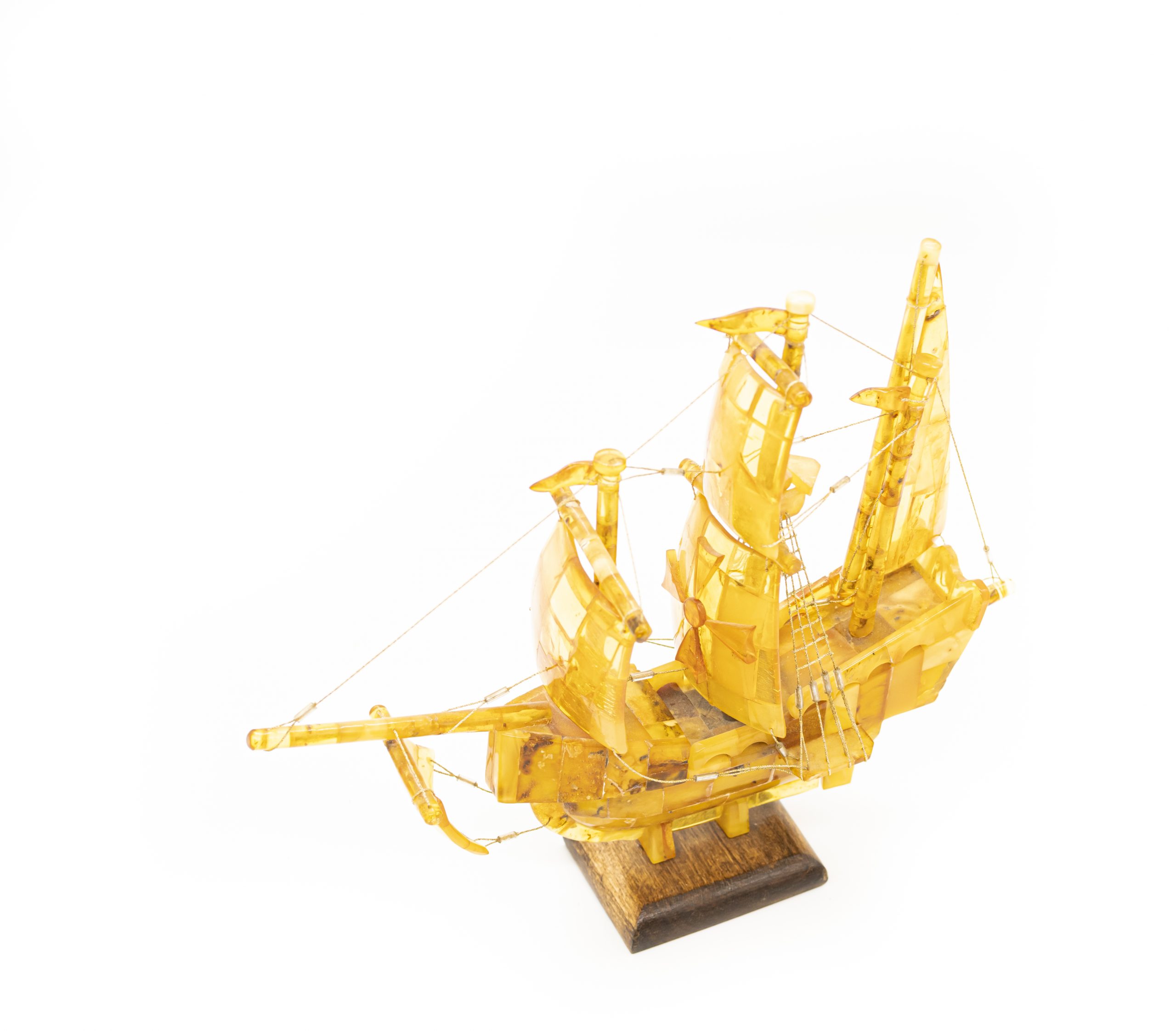 Rankų darbo autorinis šviesaus gintaro laivas ant medinio pagrindo. Ant vidurinės burės pavaizduotas Maltos ordino kryžius.