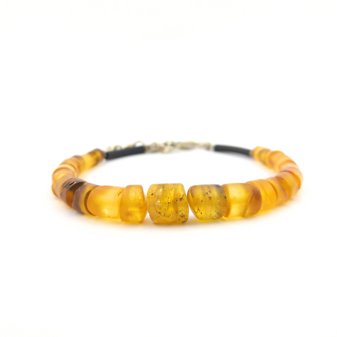 Užsegama apyrankė iš įvairaus dydžio cilindro formos gintariukų. Prie užsegimo puošta juodo kaučiuko vamzdeliais ir sendinto sidabro spalvos karoliukais. Sidabro spalvos užsegimas su grandinėle.