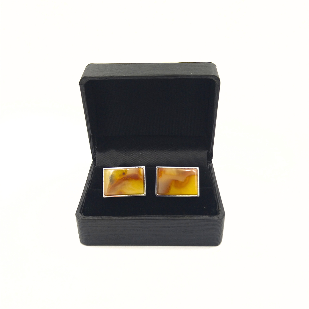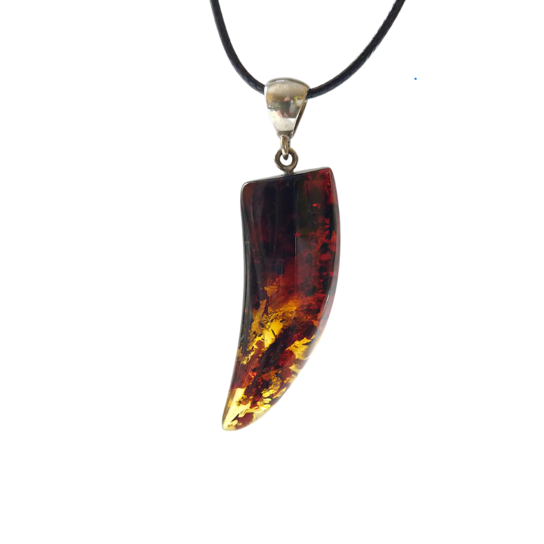 Įvairiaspalvių, skaldyto cilindro formos gintaro karoliukų vėrinys su balto gintaro iltimi. Užsukamas plastikinis užsegimas.