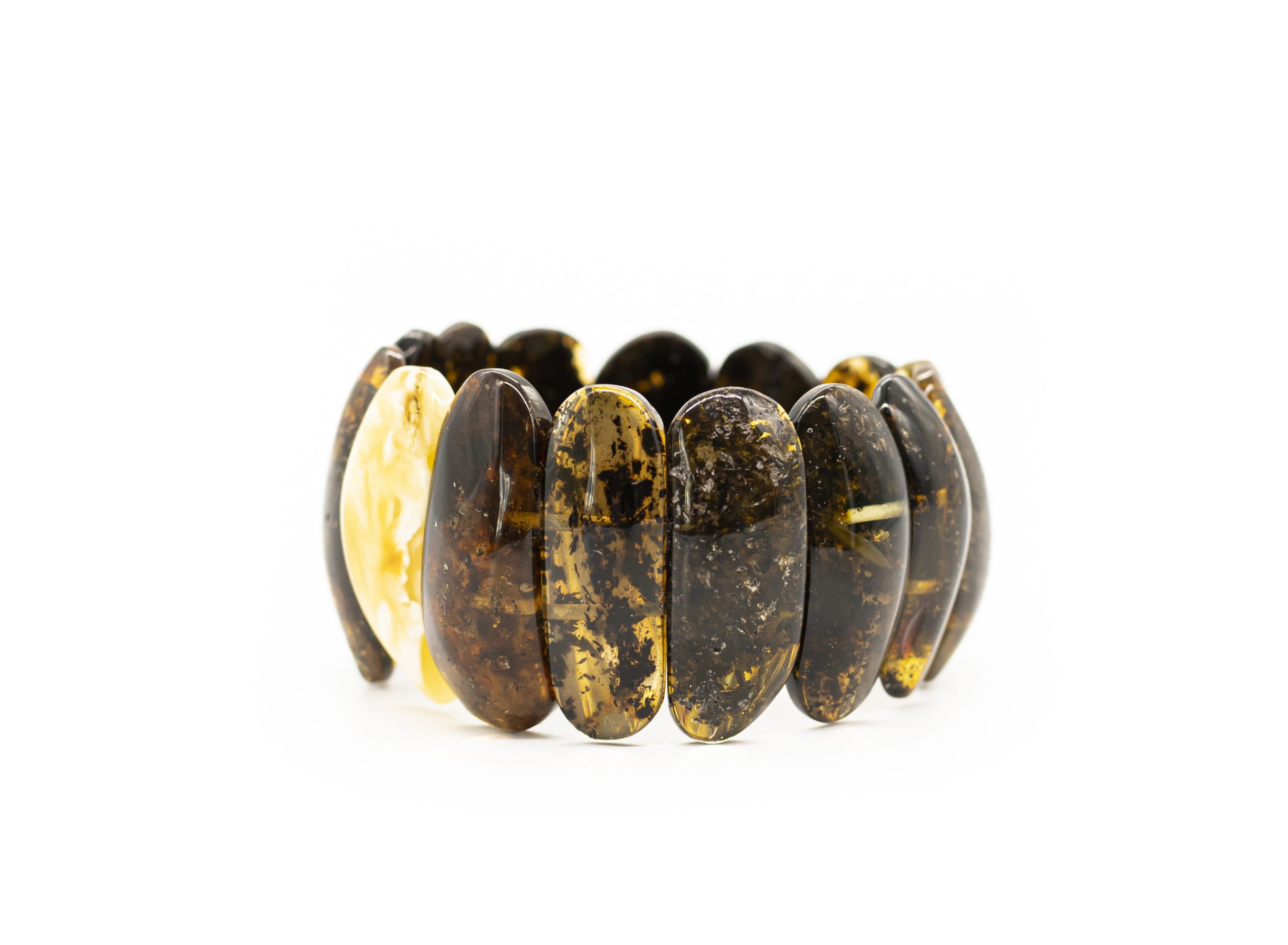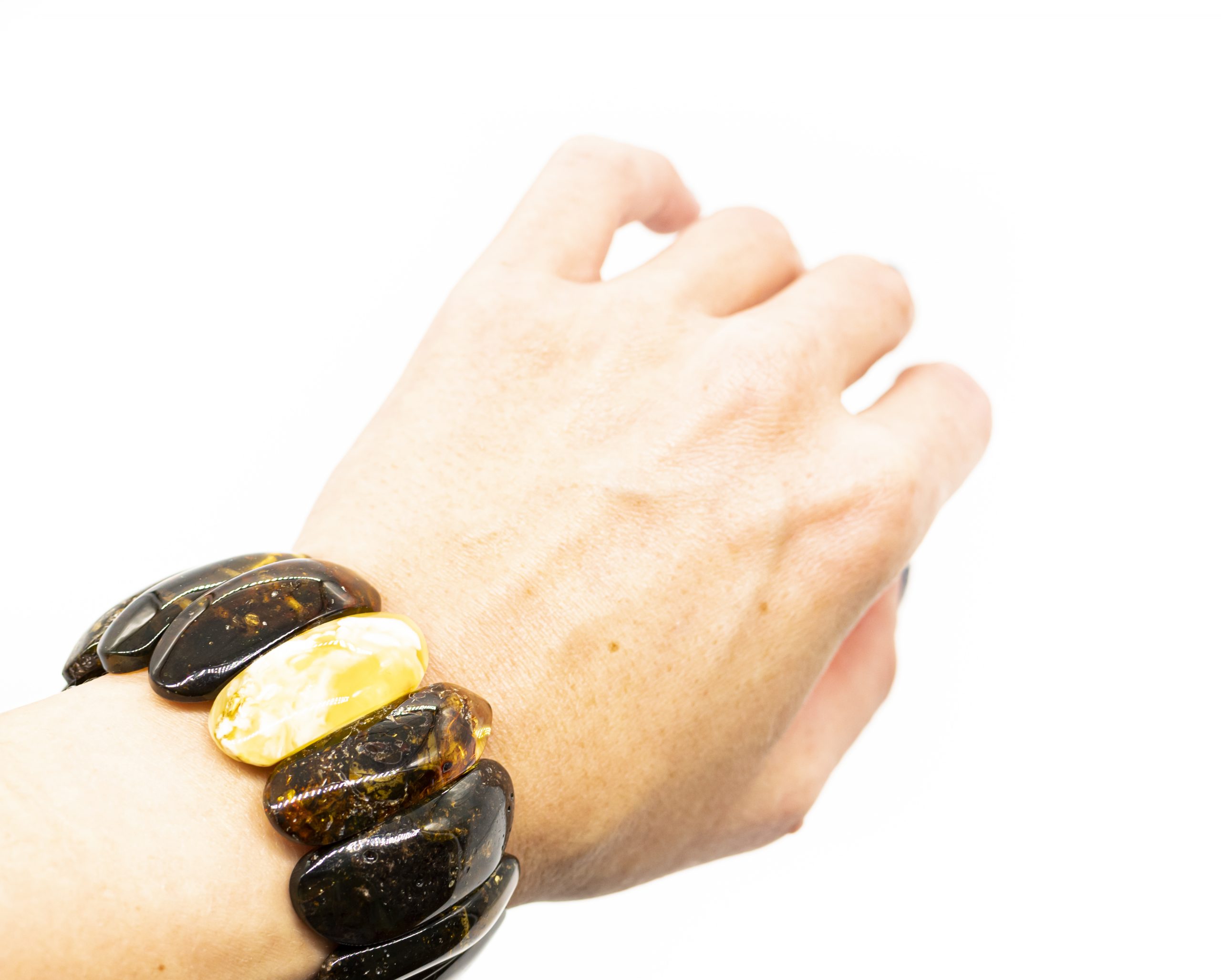 Aptakių formų žalio gintaro apyrankė su balto gintaro plokštele. Apyrankė suverta ant guminių virvelių.
