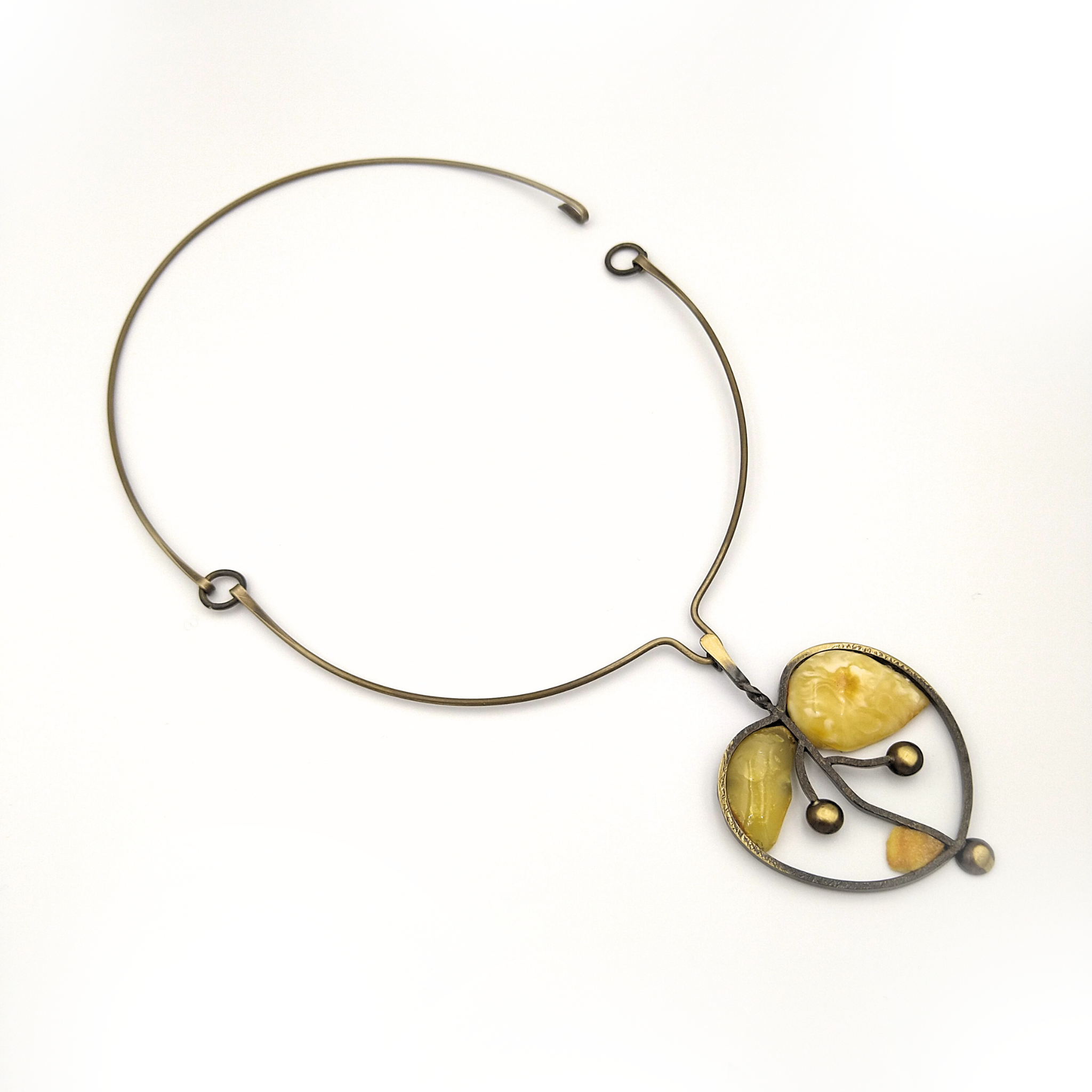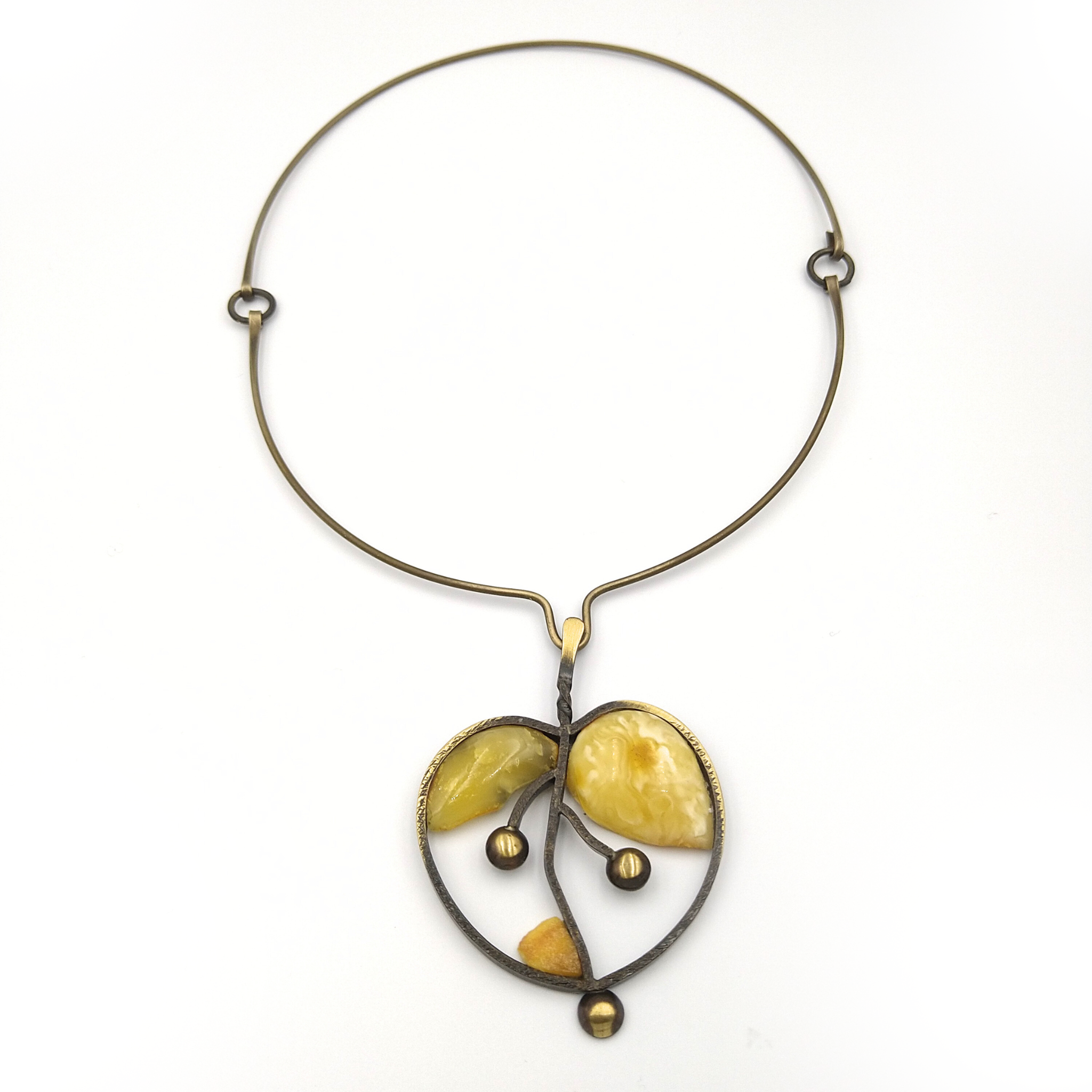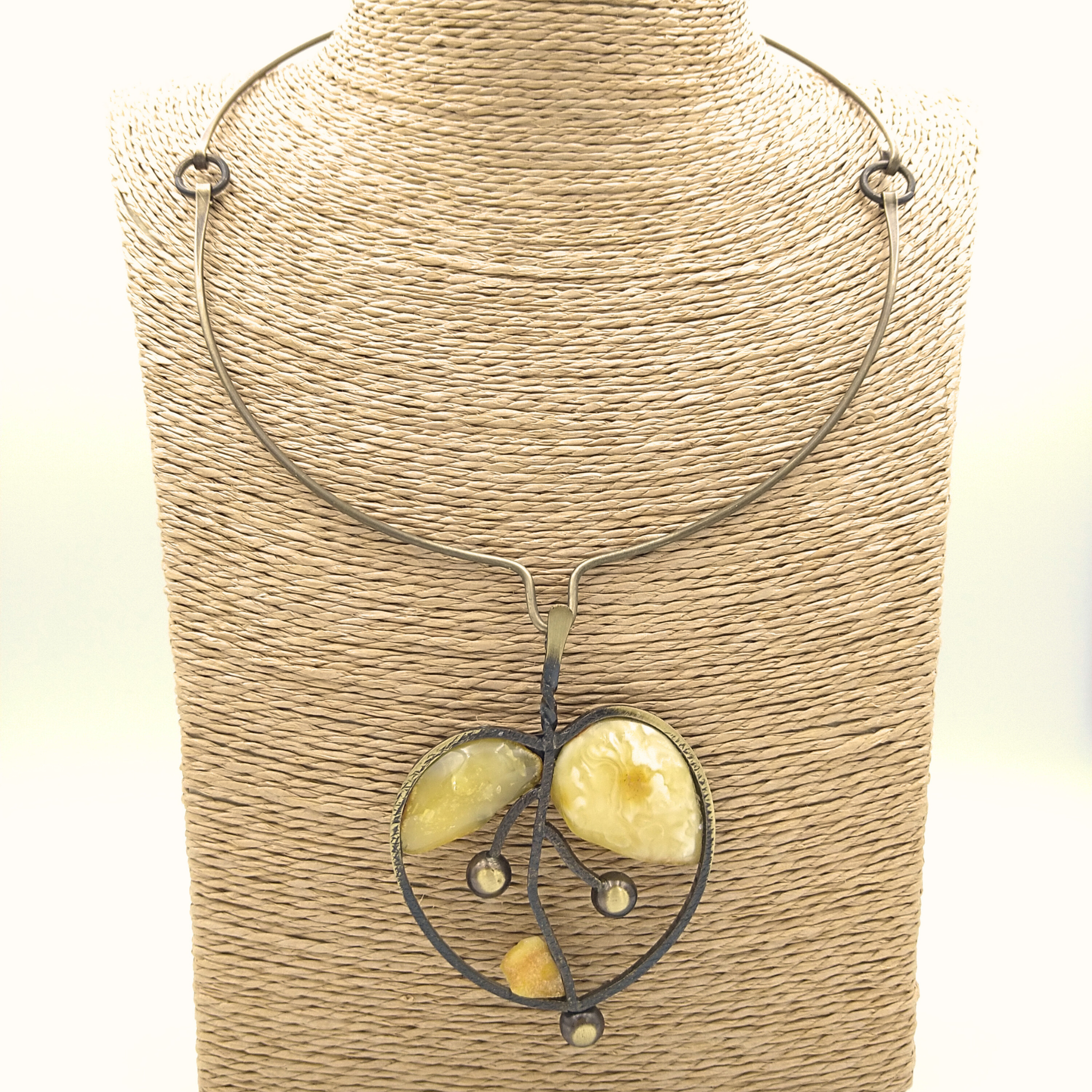 Žalvarinė antkaklė Obuolys geltonas, tai ypatingas ir išskirtinis papuošalas, kuriame susilieja gintaro šiluma ir spalvų grožis su įdomiu dizainu. Obuolio pakabukas puoštas gintaro detalėmis suteikia papuošalui žaismingumo. Ankaklės detalės jungtos žiedeliais priduoda lankeliui lengvumo, patogiai užsisega/atsisega šone kabliuku.