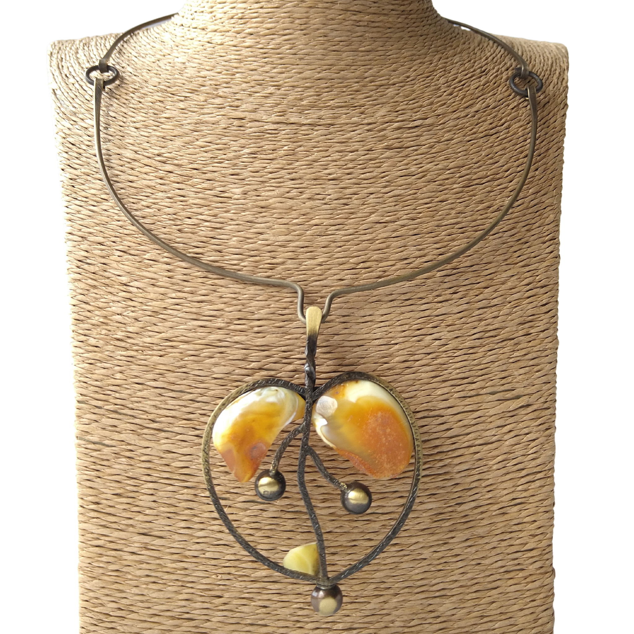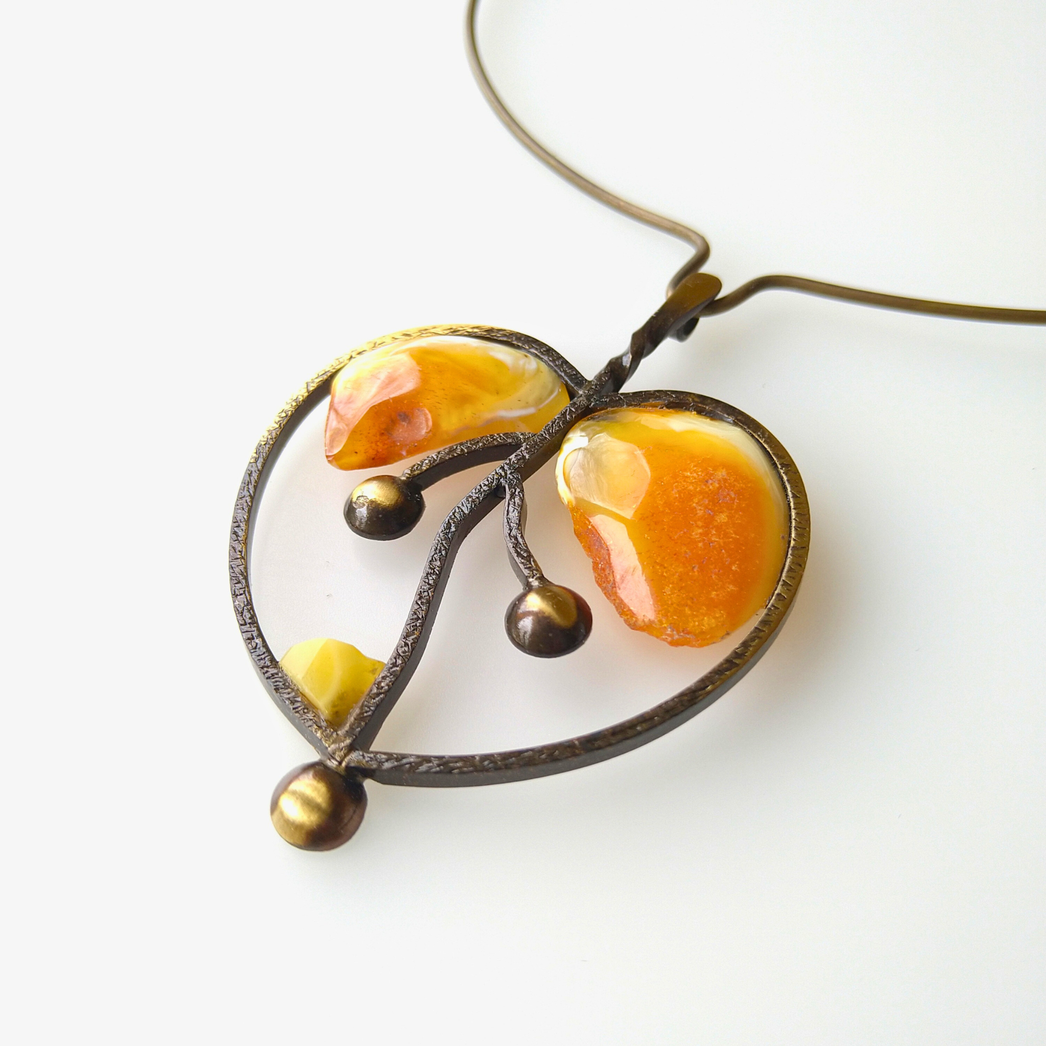 Žalvarinė antkaklė Obuolys, tai ypatingas ir išskirtinis papuošalas, kuriame susilieja gintaro šiluma ir spalvų grožis su įdomiu dizainu. Obuolio pakabukas puoštas gintaro detalėmis suteikia papuošalui žaismingumo. Ankaklės detalės jungtos žiedeliais priduoda lankeliui lengvumo, patogiai užsisega/atsisega šone kabliuku.